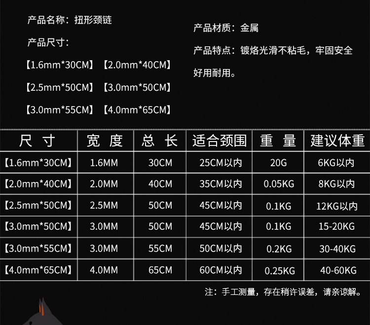 Raise a pet stainless steel P chain dog rope traction rope golden retriever 304 collar snake chain large dog pet 1.6mm*30CM twisted neck chain