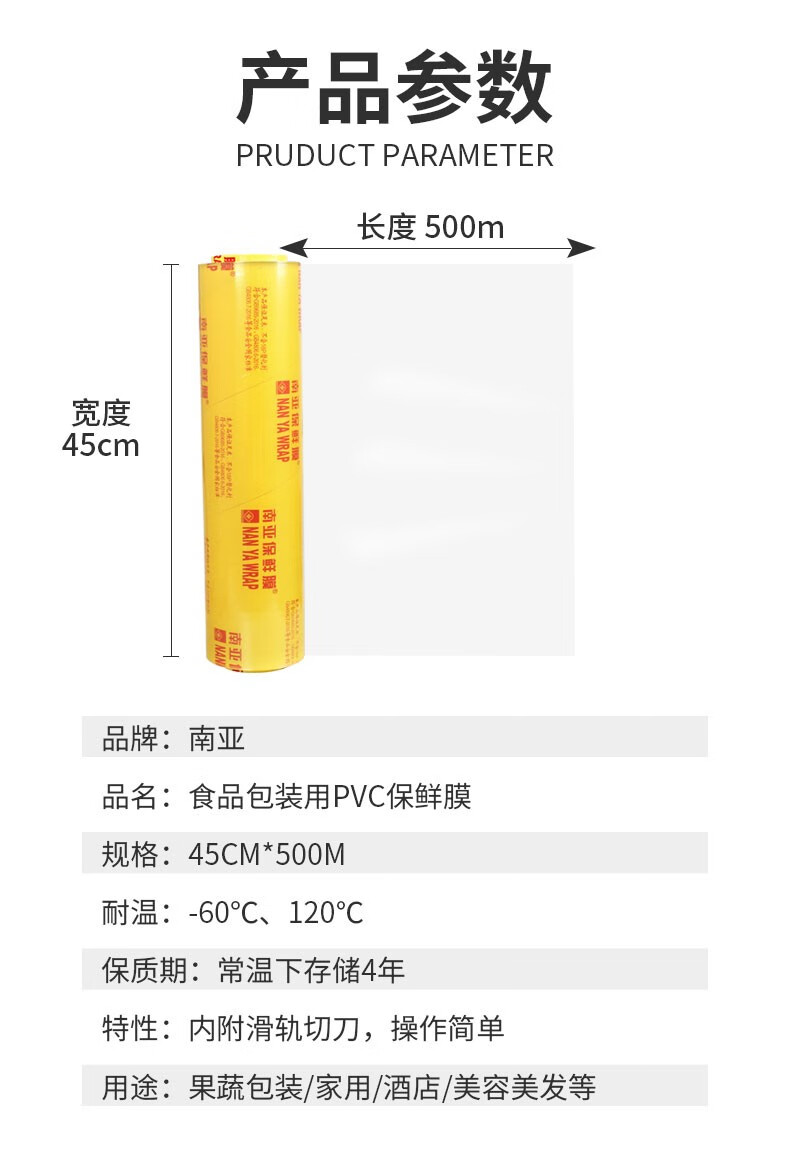 NAN YA WRAP PVC large roll sliding knife cutter food grade fruit and vegetable supermarket catering beauty body hotel film 500M 45cm*500M*1 box