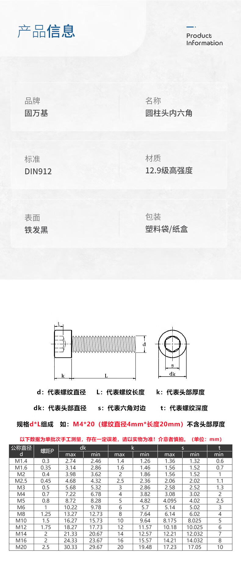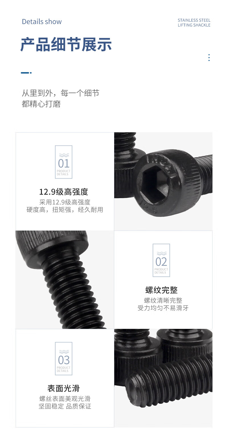 Guwanji Grade 12.9 inner hexagonal screw cylindrical head bolt full-thread high-strength extended screw screw fastener collection M16*55 10 pcs full-thread