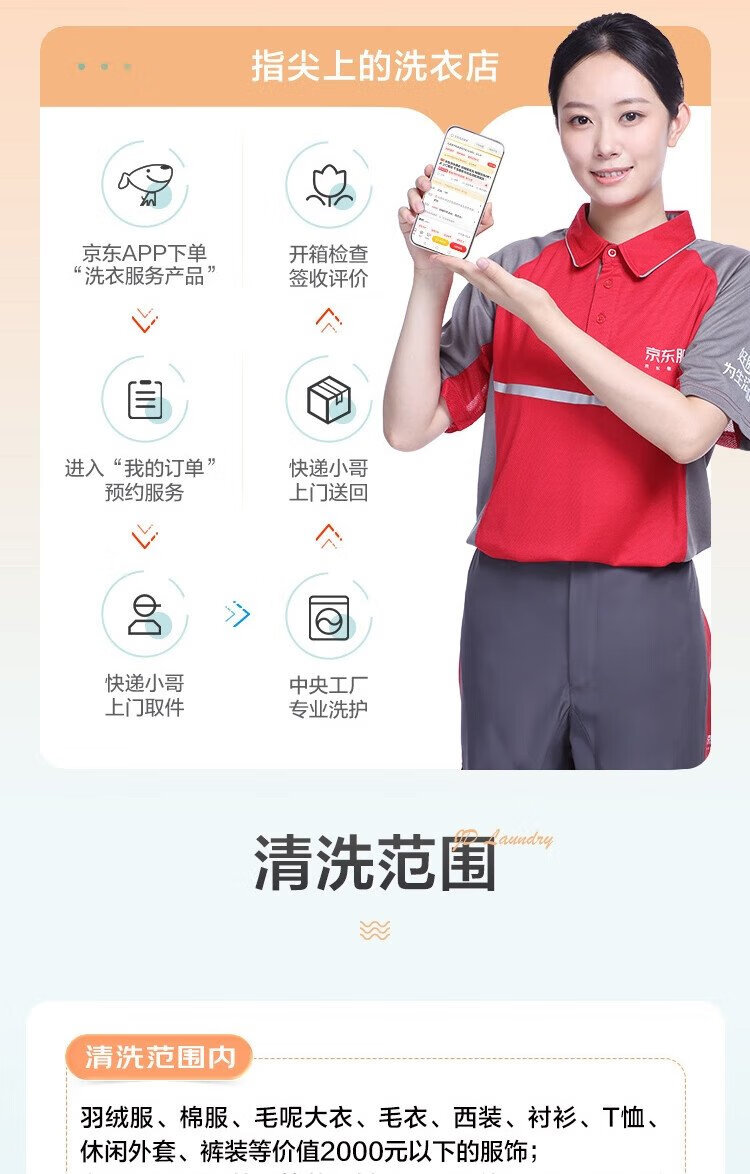 Jingdong Laundry Service: Any clothes and shoes can be washed, down jackets/shirts/sneakers, etc. Dry cleaning service, stain removal and ironing, cleaning and maintenance, free pick-up and delivery, 5 pieces of clothes and shoes can be washed on demand