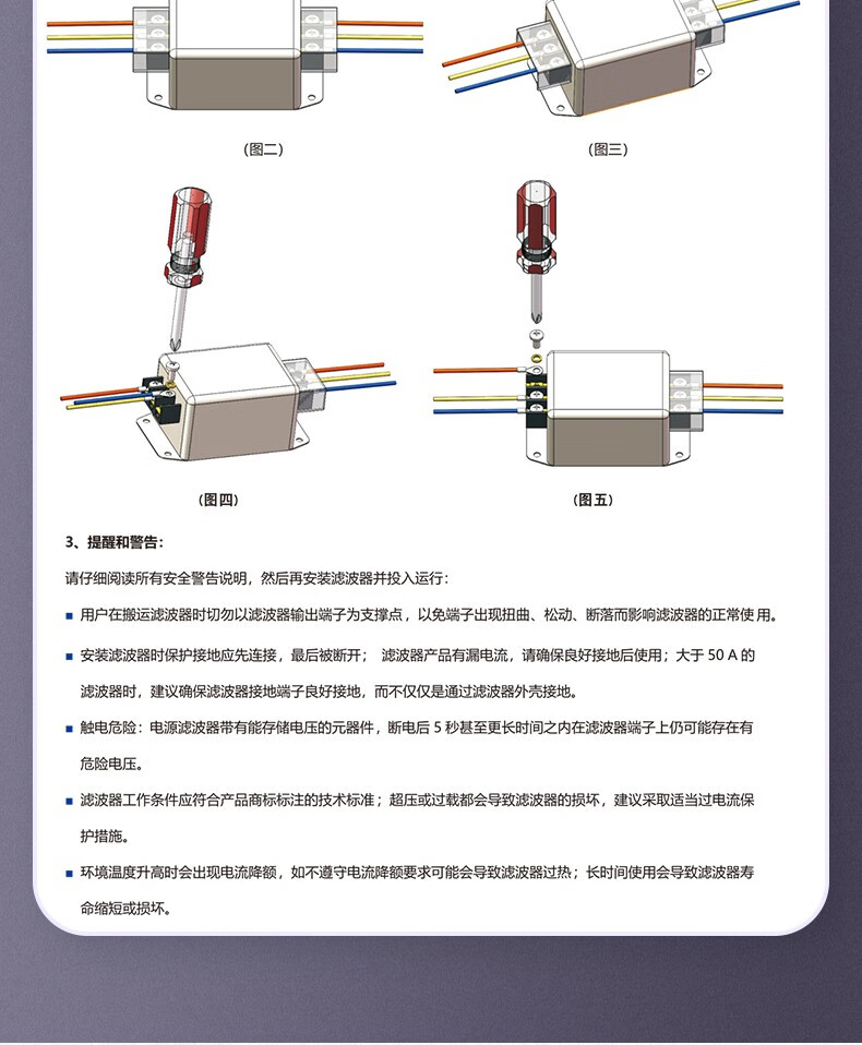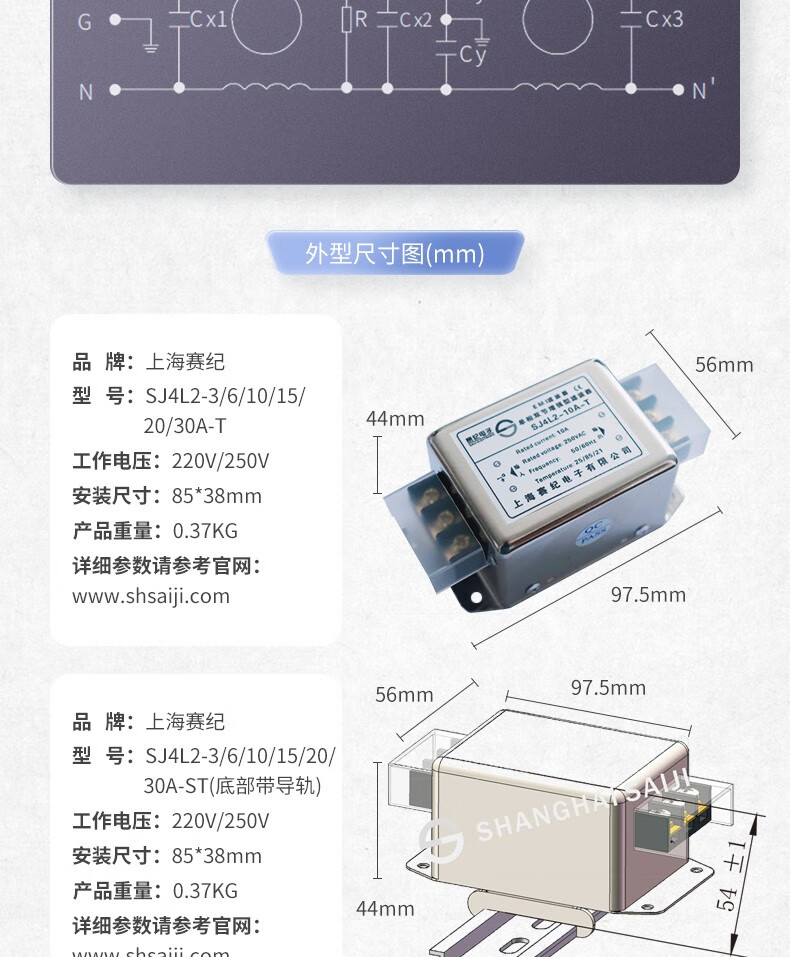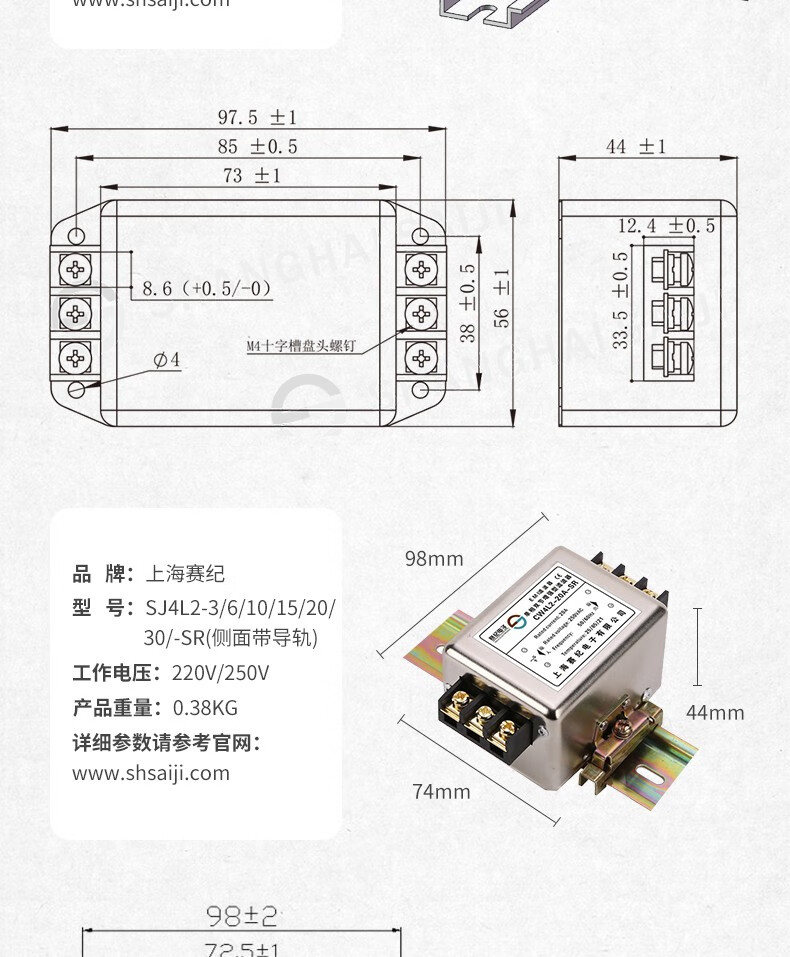 Saiji SJ4L2 power filter 220V AC emi rail double section anti-interference power purifier SJ4L2-15A-SR (with rails on the side)