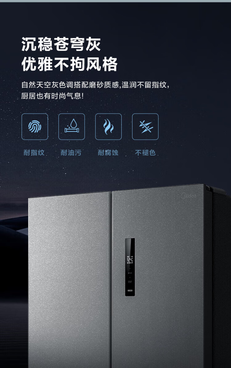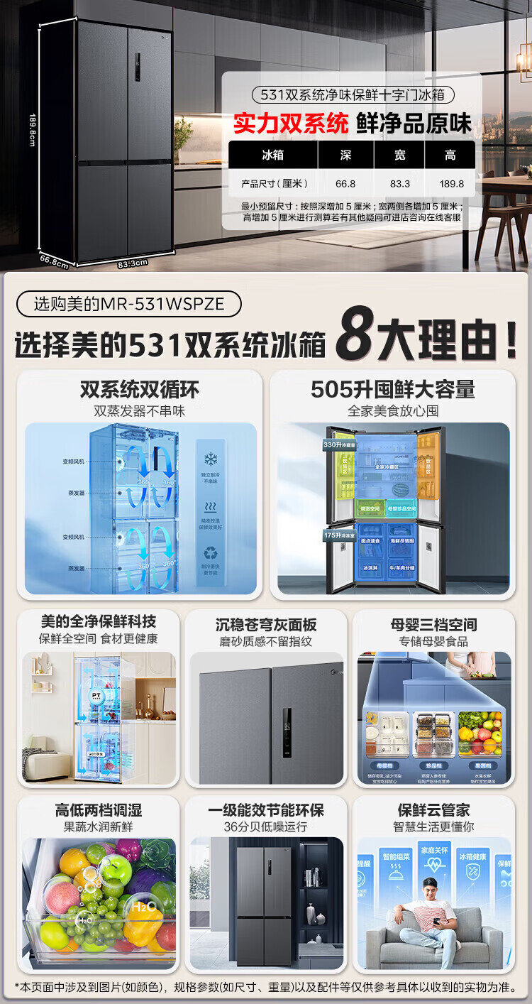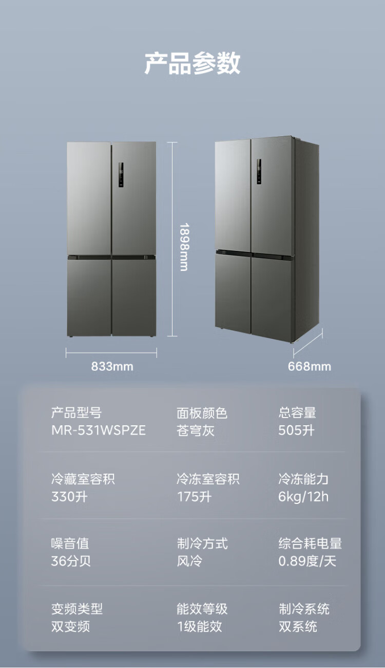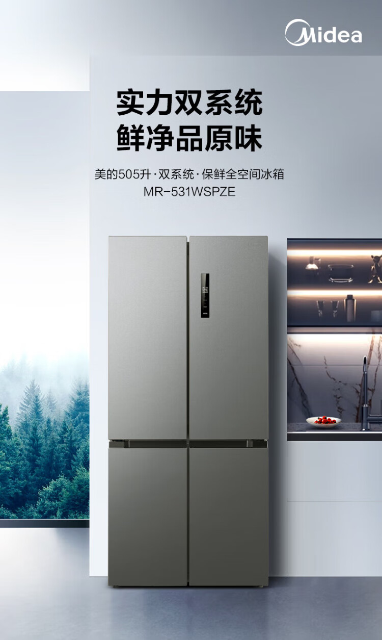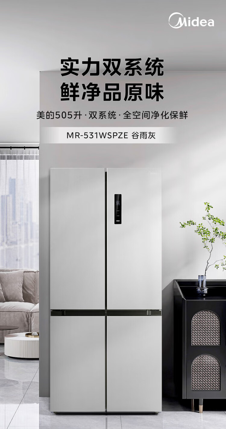 Midea 508 refrigerator 531 cross-door multi-door dual system dual cycle odor-free first-class energy efficiency air-cooled frost-free large capacity household four-door refrigerator subsidy 15% dual system MR-531WSPZE Sky Gray