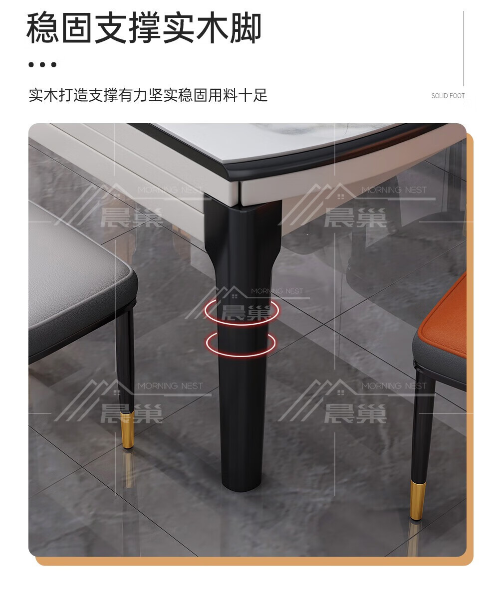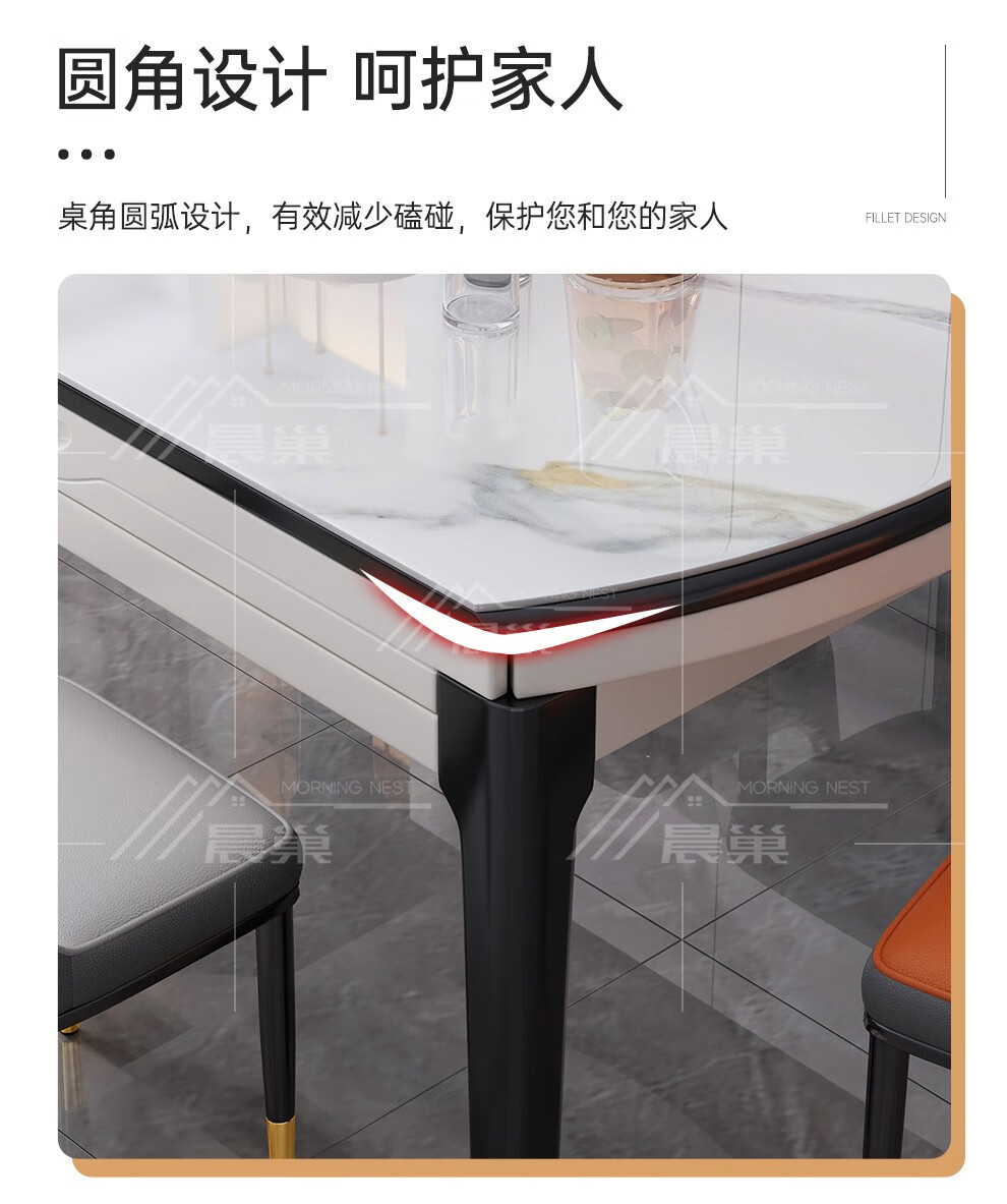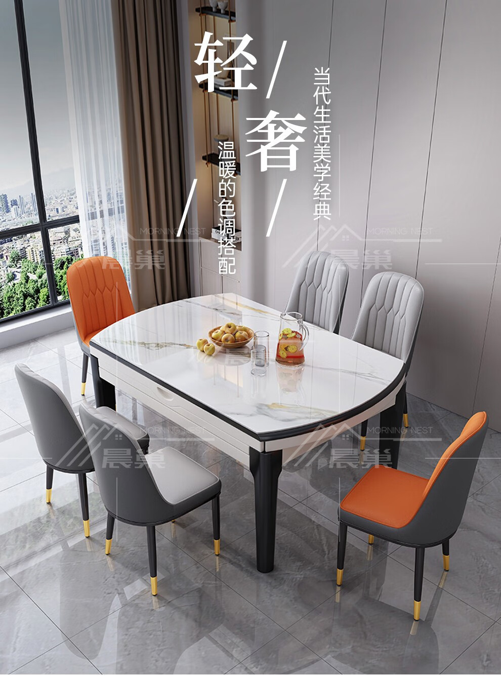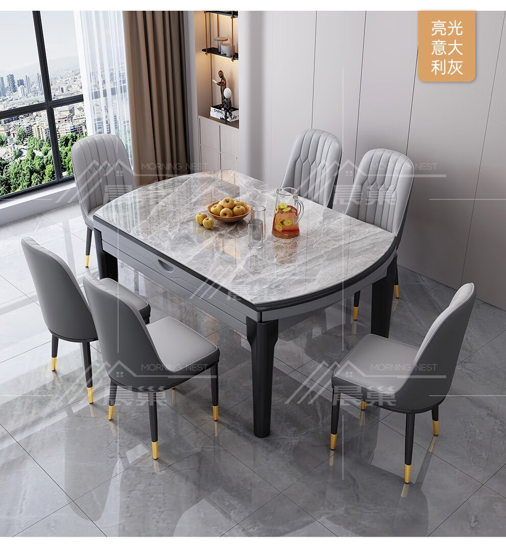 Morning Nest Slate Dining Table Solid Wood Dining Table and Chair Combination Modern Simple Retractable Folding Dining Table Restaurant Furniture Black and White Frame Glossy Snow Mountain White-111 Leather Chair 1.35 Meter Table and Six Chairs-12MM Rock Slab Thickness