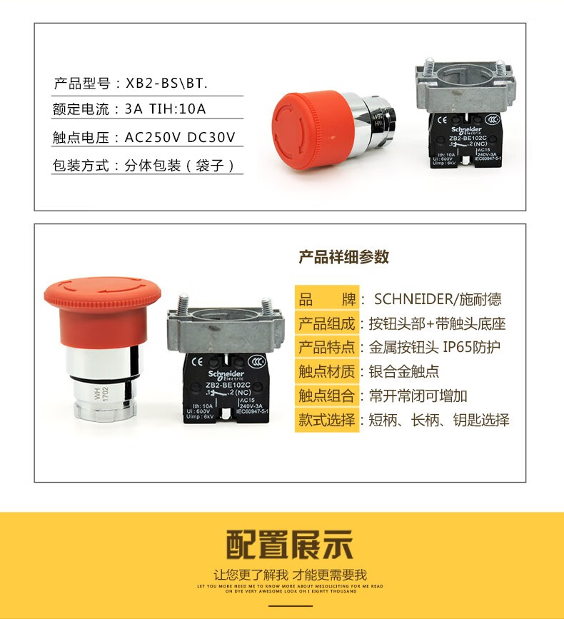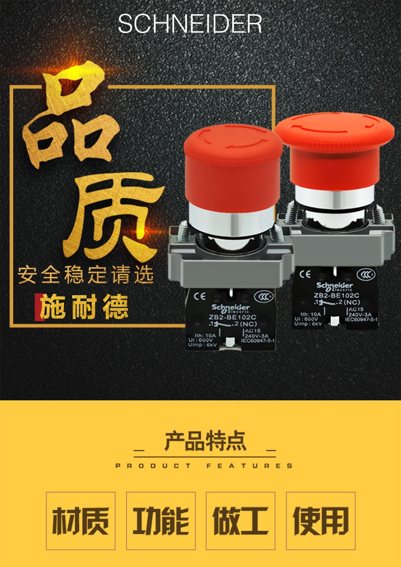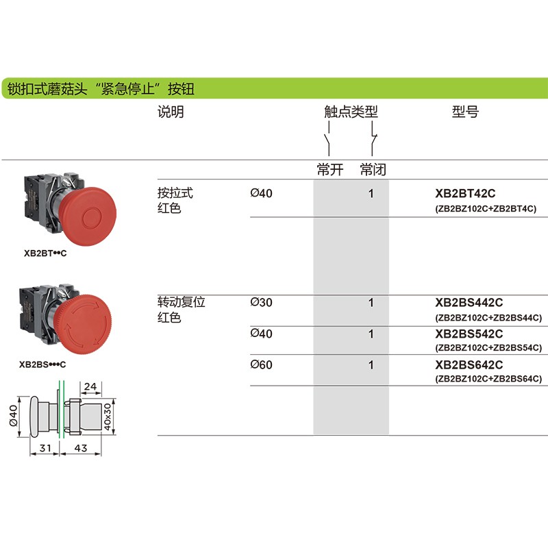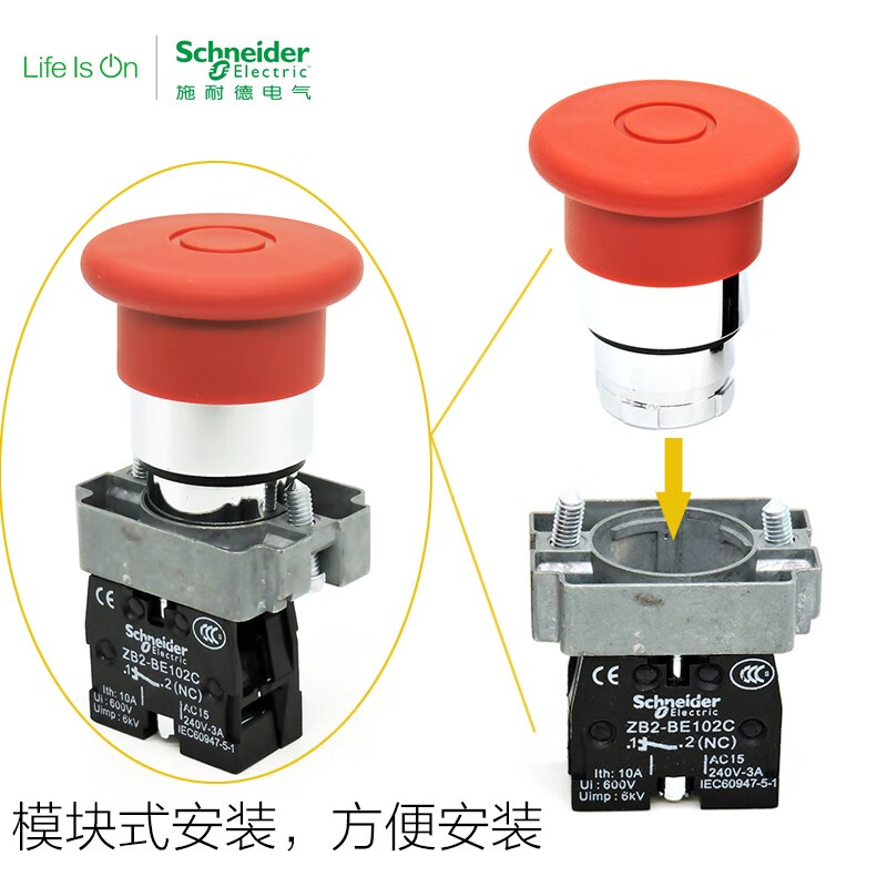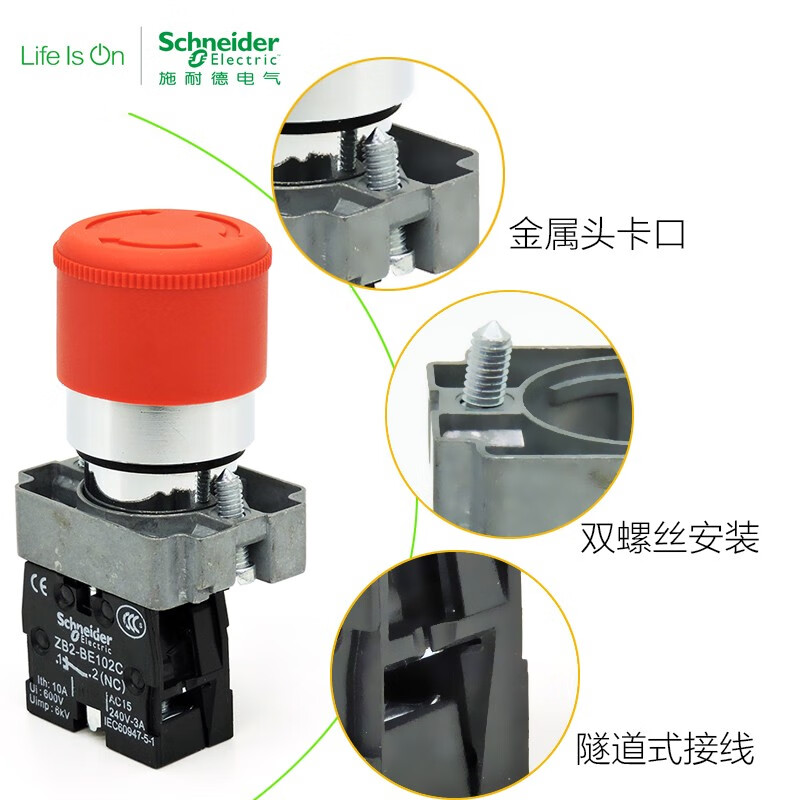 Schneider original Schneider XB2BS emergency stop button switch 40mm diameter 22mm mounting hole red self-locking rotation reset XB2-BT pull-out normally open contact ZB2BE101C normally closed 102C XB2-BS542C 40 mushroom 1 normally closed