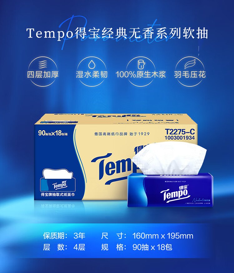 Debao Soft Tissue 4-layer thickened classic unscented wettable napkins 90 napkins 18 packs (new and old packaging shipped randomly) Classic unscented napkins 4 layers 90 napkins*18 packs