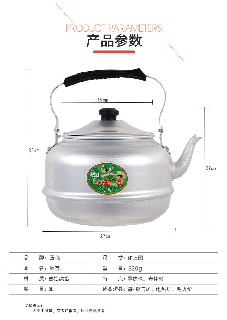 Yuniao old-fashioned aluminum kettle thickened aluminum kettle large capacity 8 liter teapot household gas gas firewood stove aluminum kettle 28cm aluminum firewood kettle