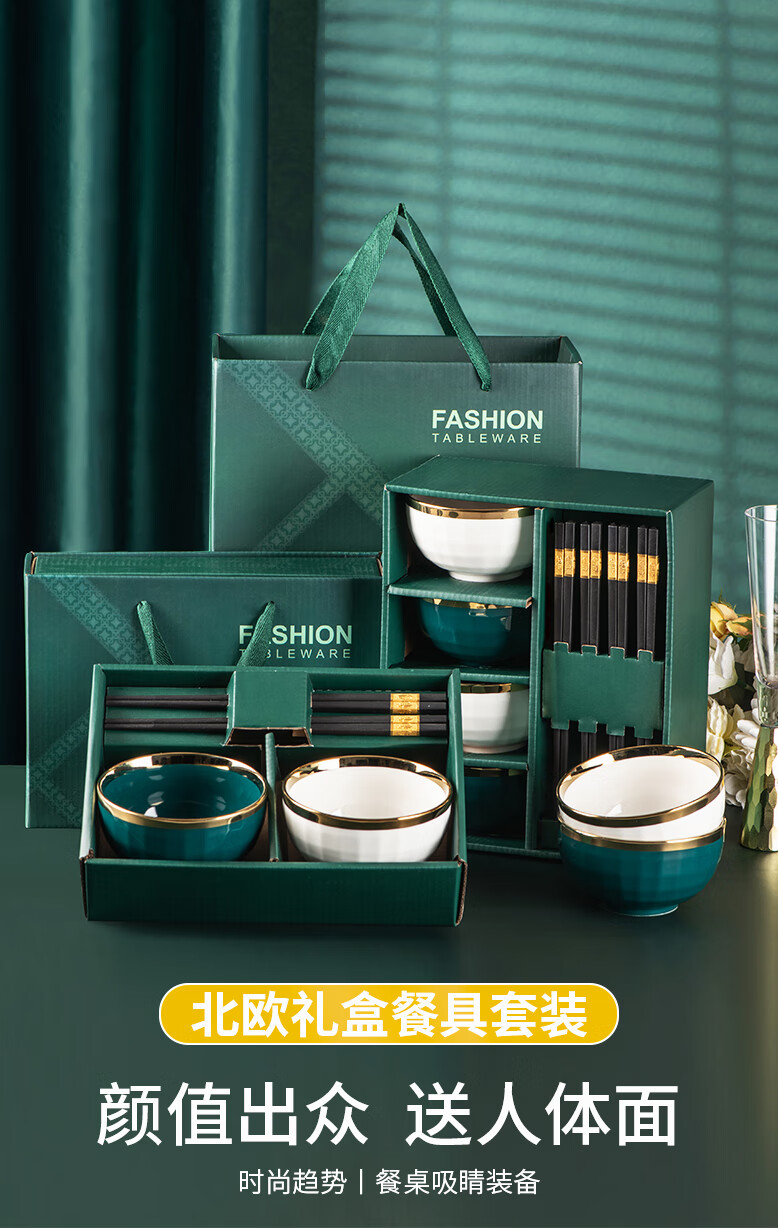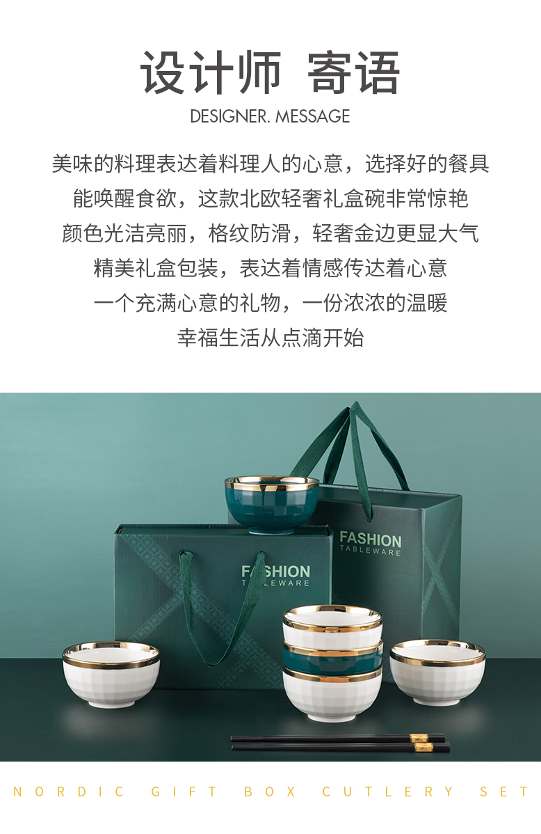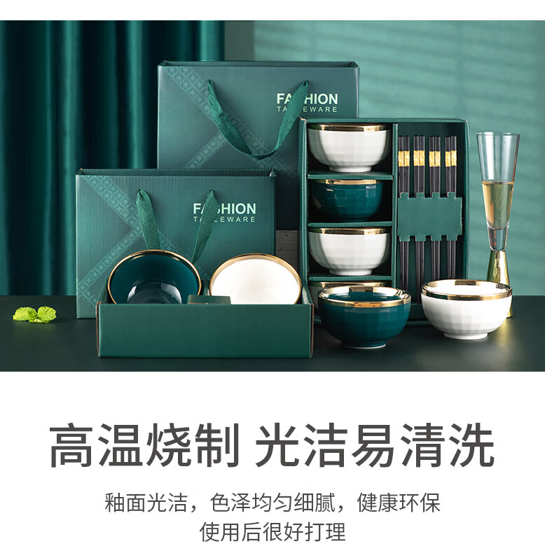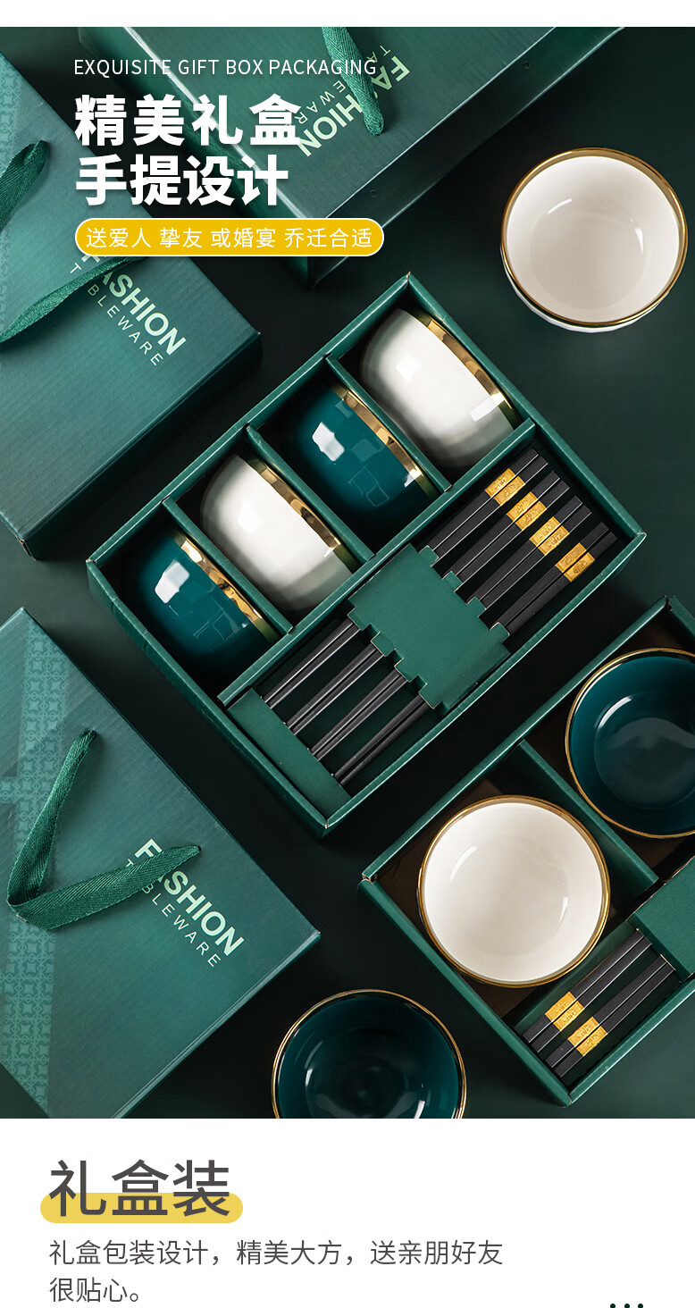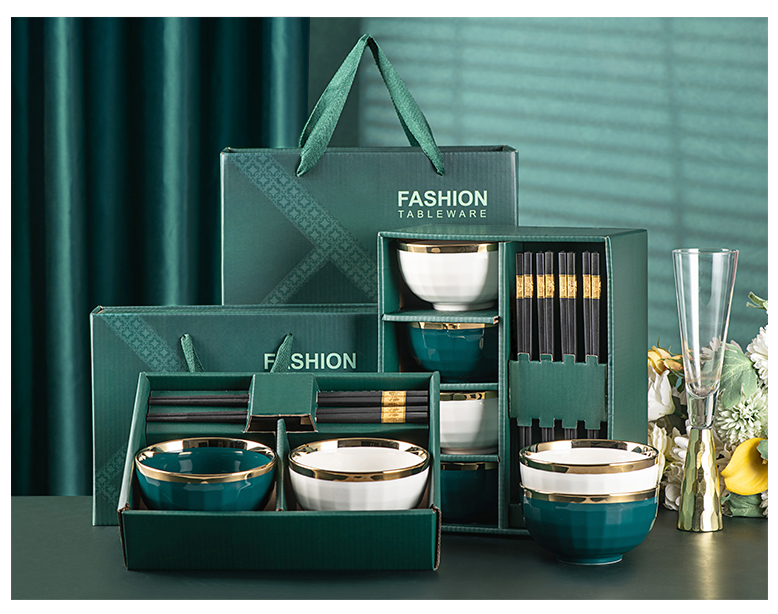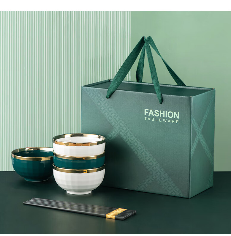 SUMEIJI gift bowl and chopsticks set, ceramic light luxury bowl set, gift to customers for annual meeting, employee benefits, souvenirs, store celebration prizes, gold-plated 4.5-inch bowl, 1 white, 1 green, 2 chopsticks