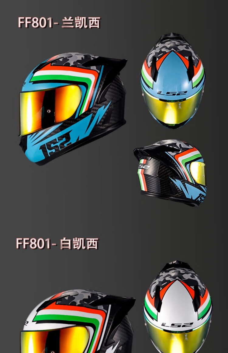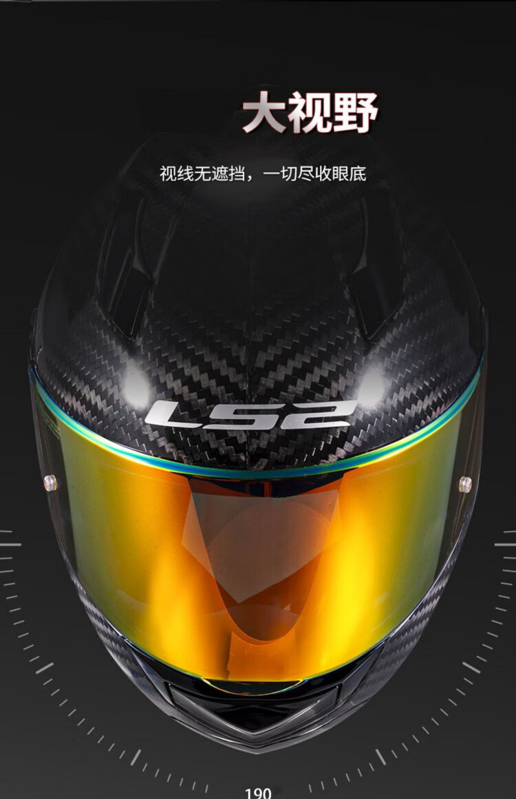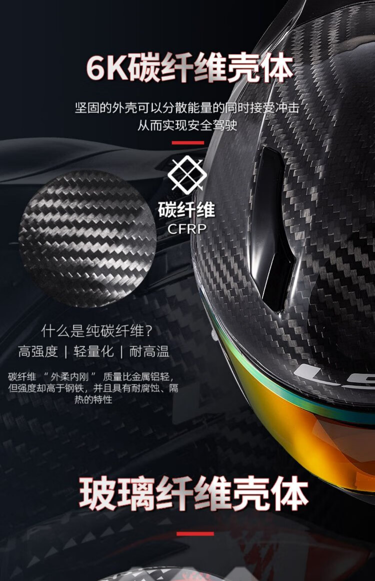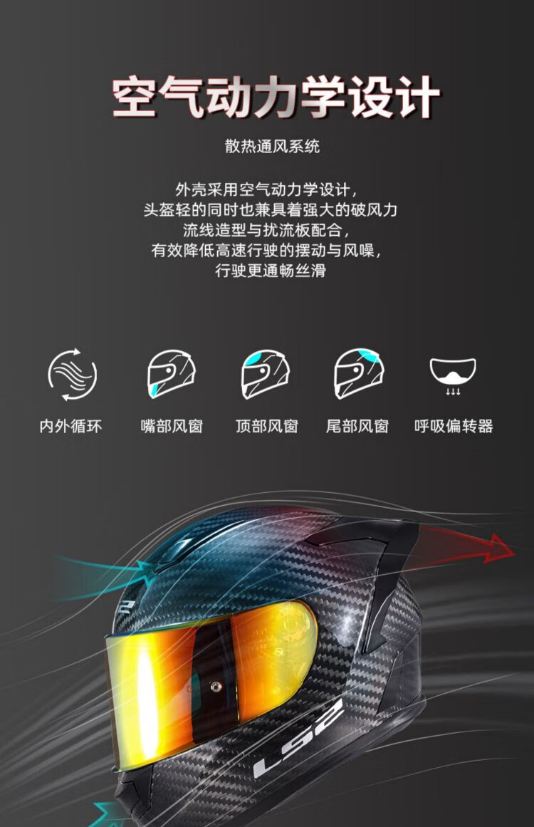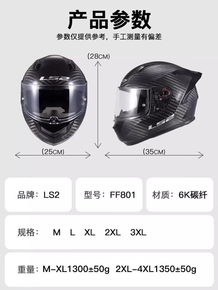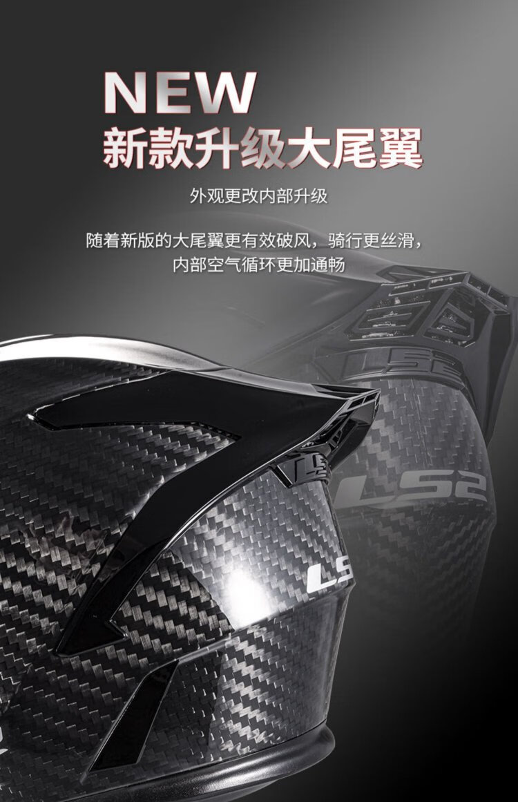 LS2 carbon fiber motorcycle helmet for men and women, all-season full-face helmet, anti-fog, large rear wing FF801 6K single lens - carbon fiber large rear wing model - bright black 2XL (59-60 head circumference recommended)