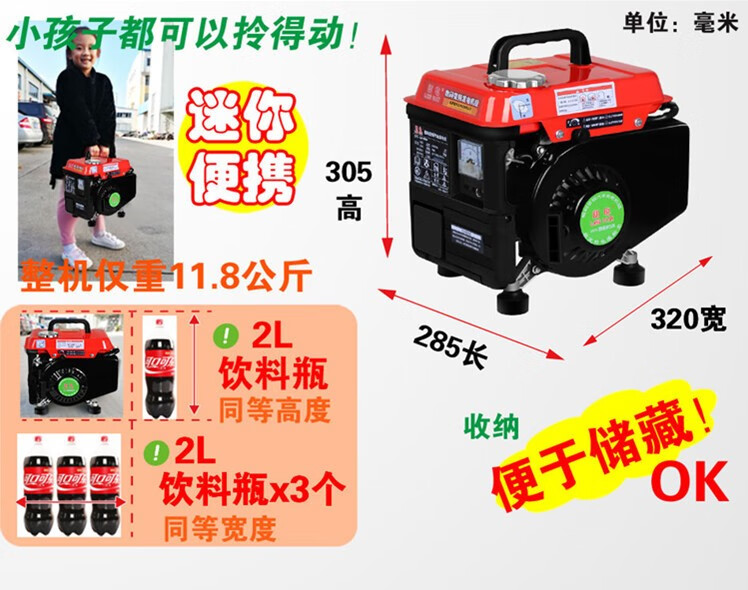 Yutairui portable gasoline generator 1000w 220v household small bass mini outdoor low bass car generator ordinary 600W 17kg