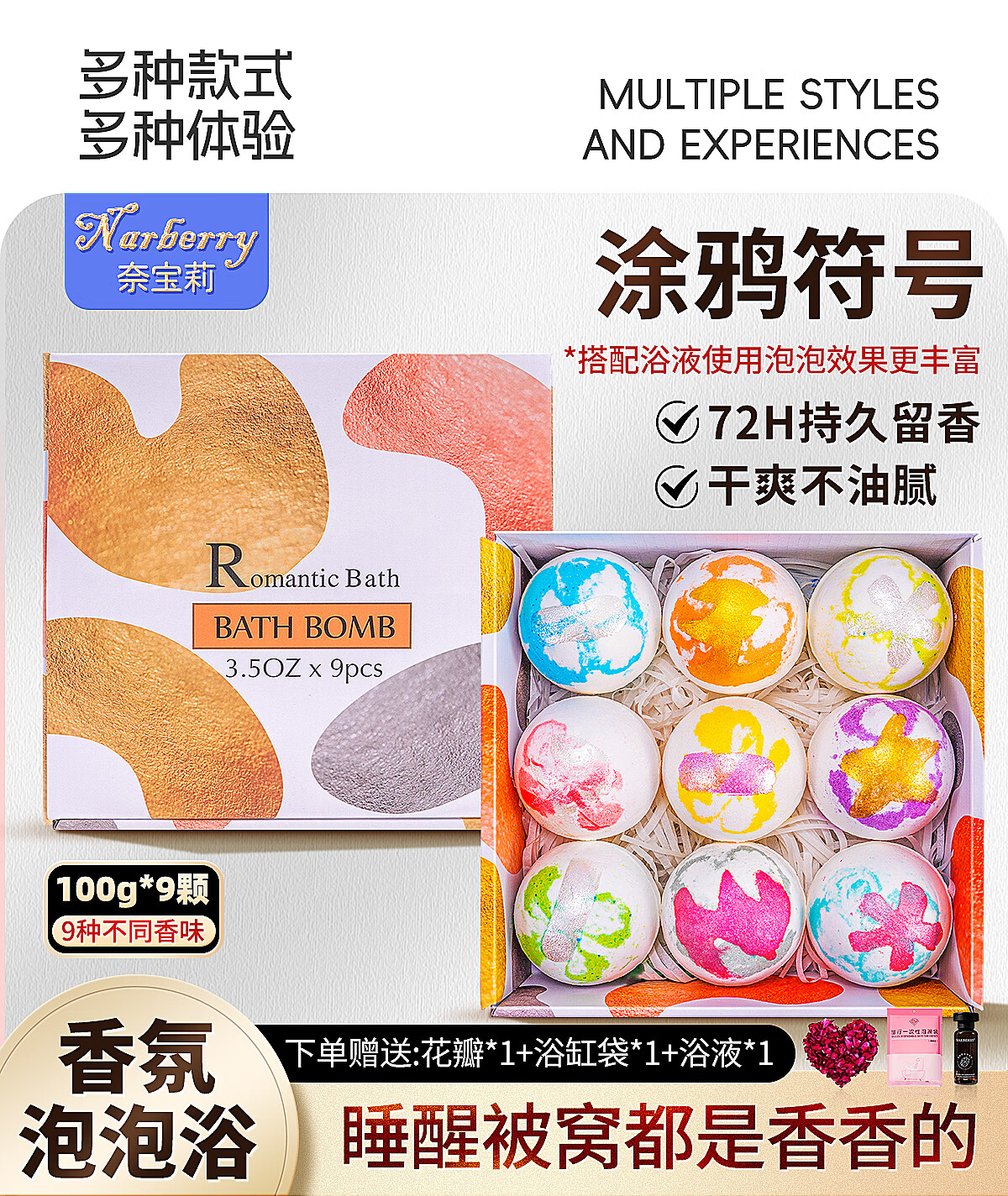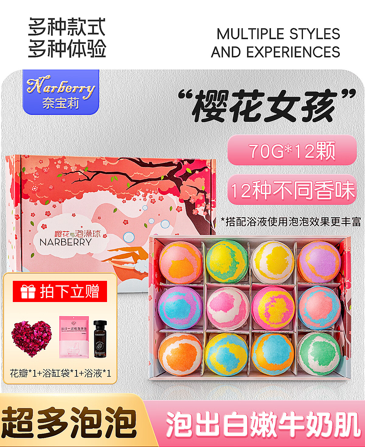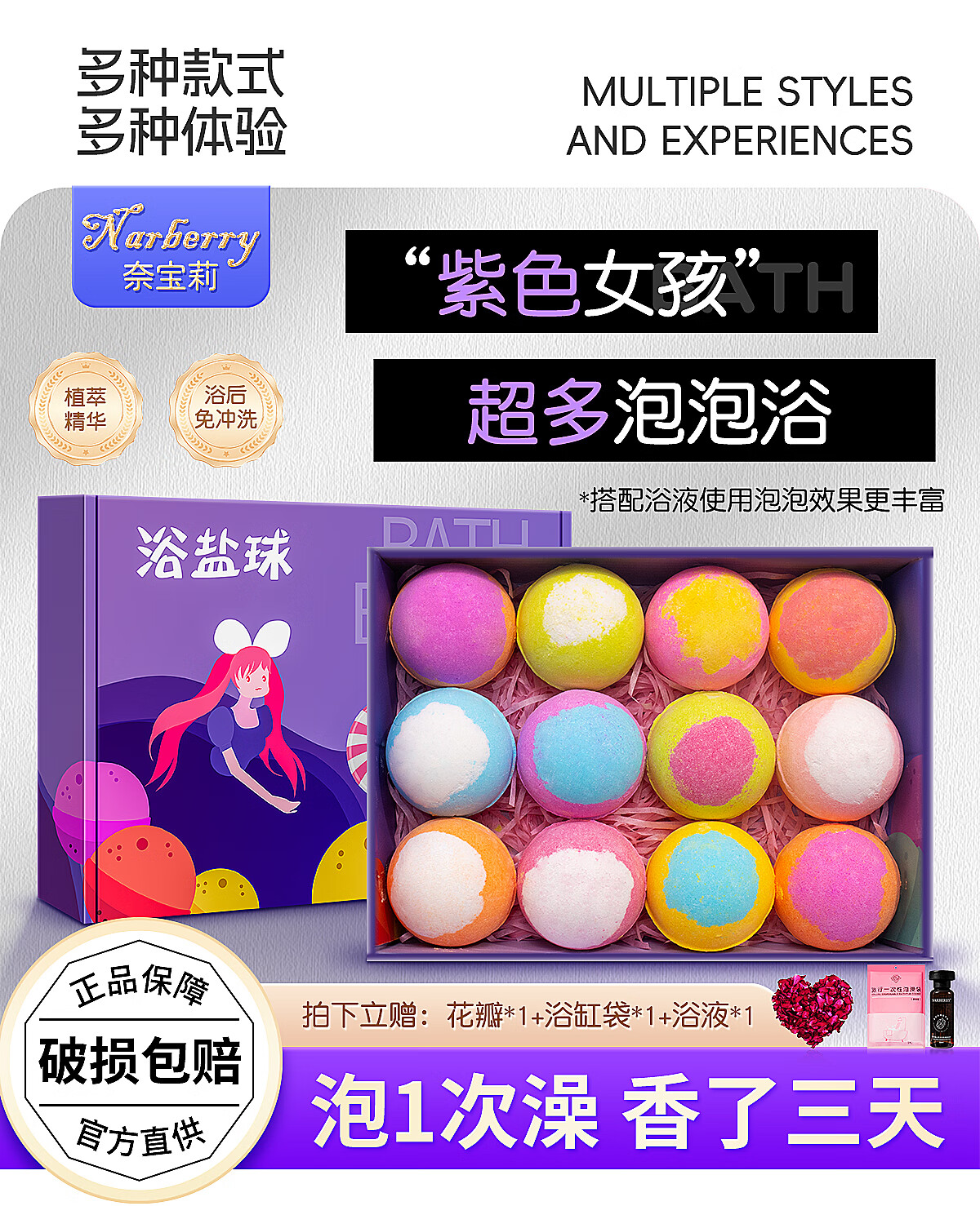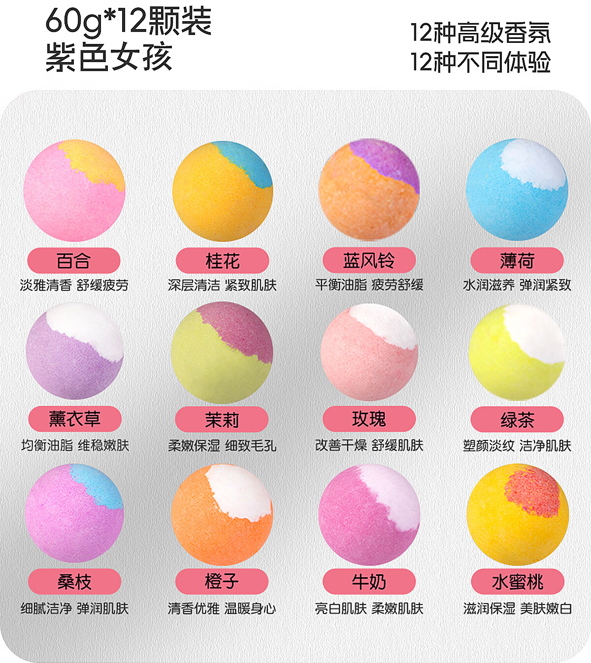 NARBERRY adult women's bath ball bath salt ball bath salt ball essential oil ball bath bubble bath super bubble bath bomb 70g*12 purple girl