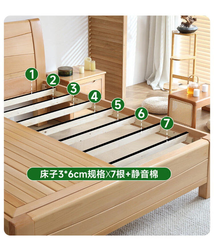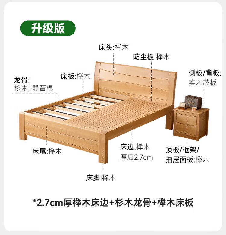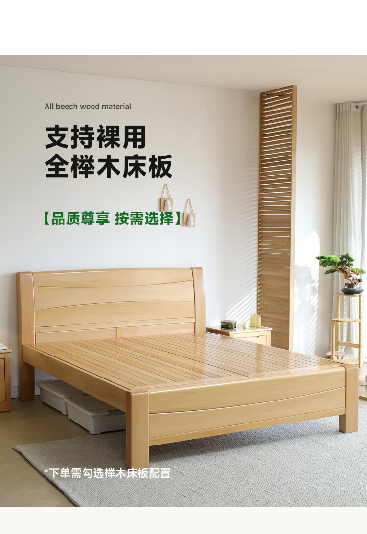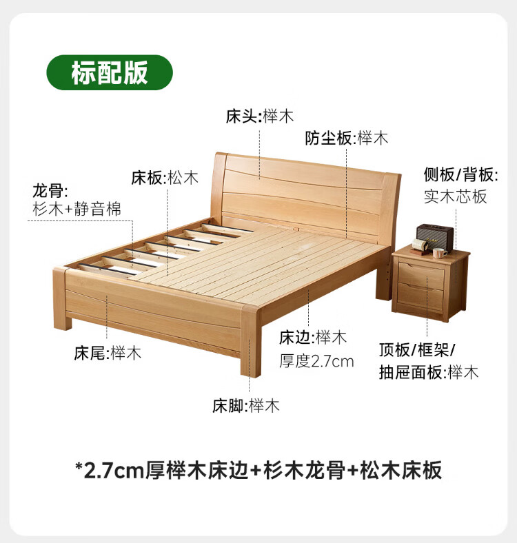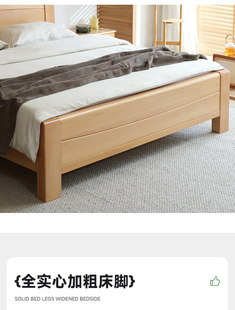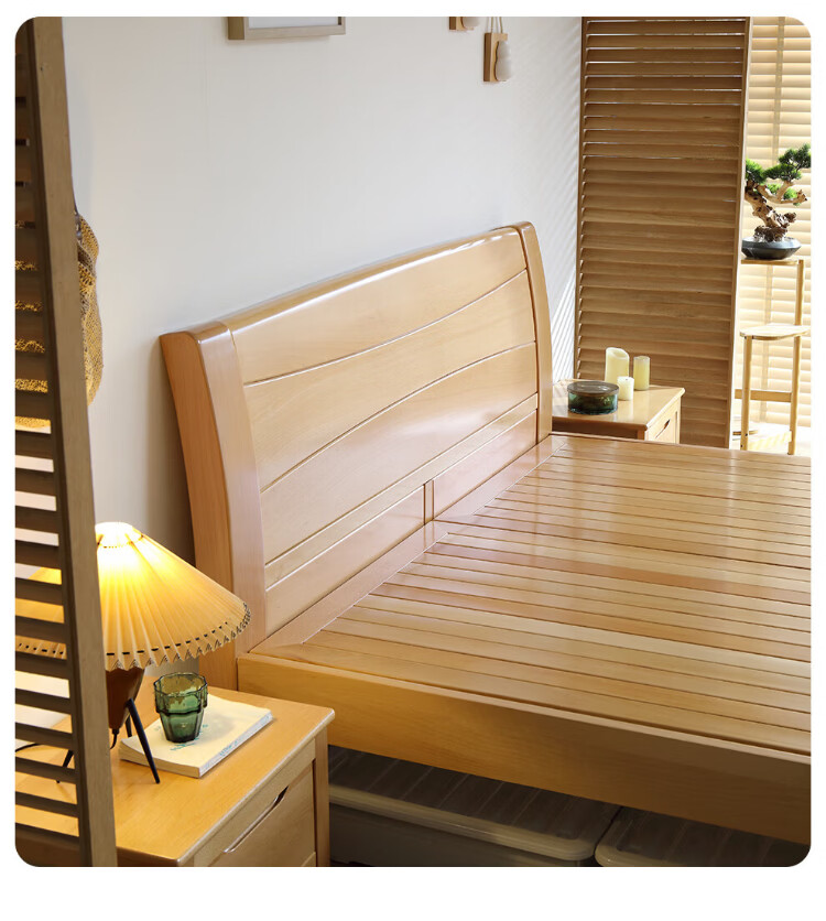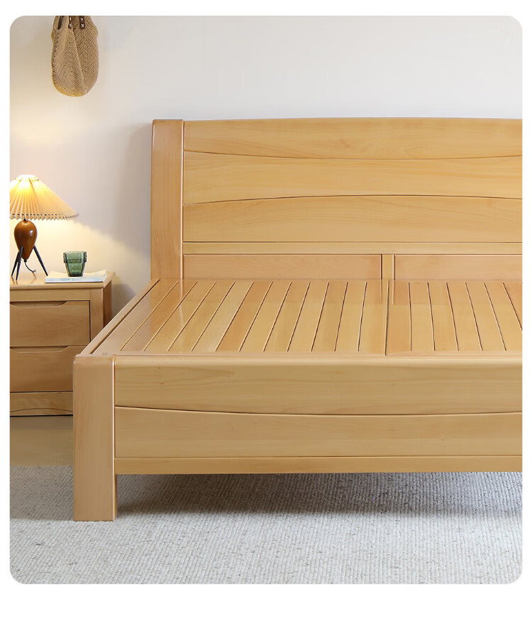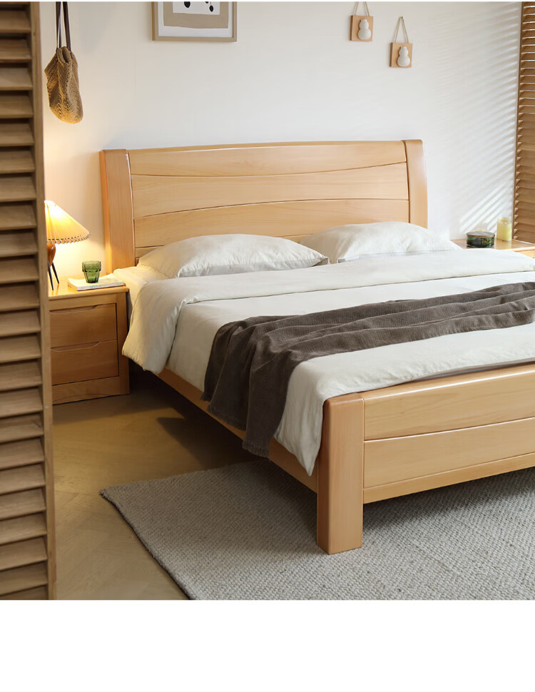 Virgin forest beech bed, all solid wood double bed, thickened simple solid wood large bed, beech furniture, log bed, master bedroom wedding bed, single bed, standard version 1.8*2.0 meters-2.7cm thick beech bedside + fir keel + pine bed board