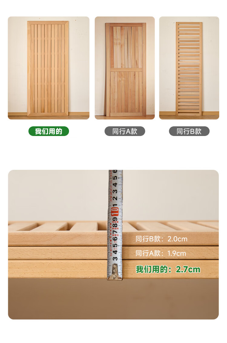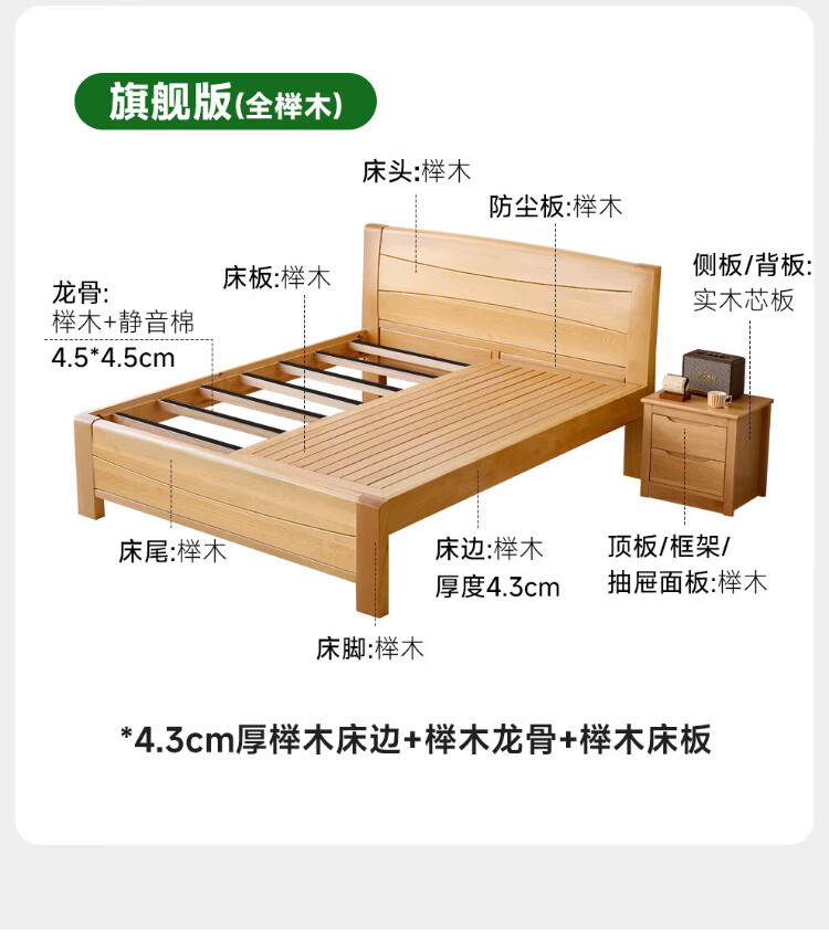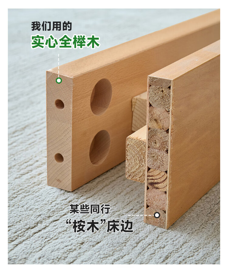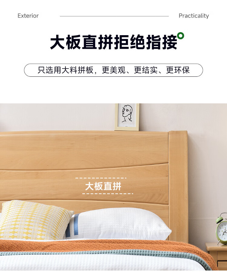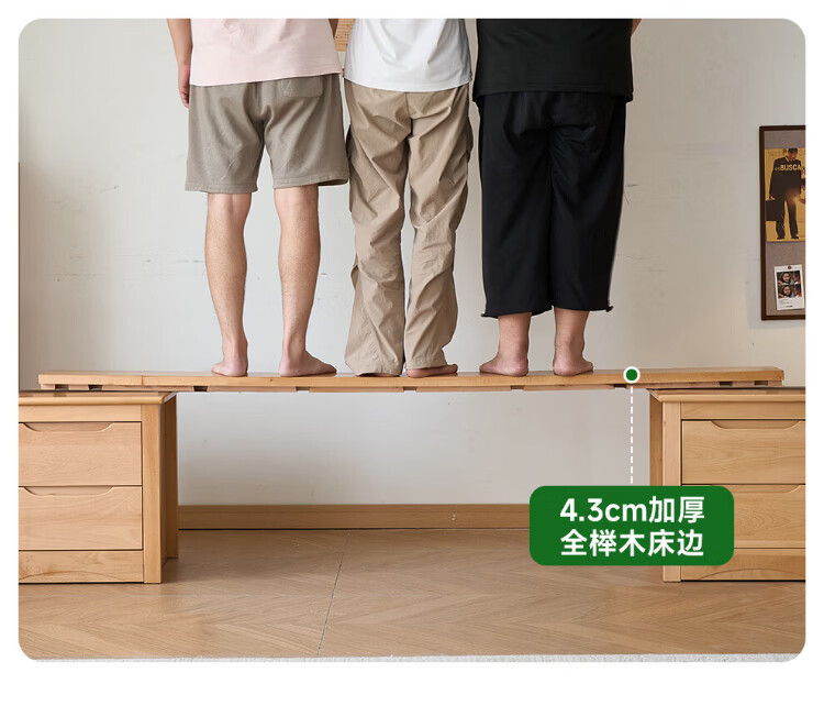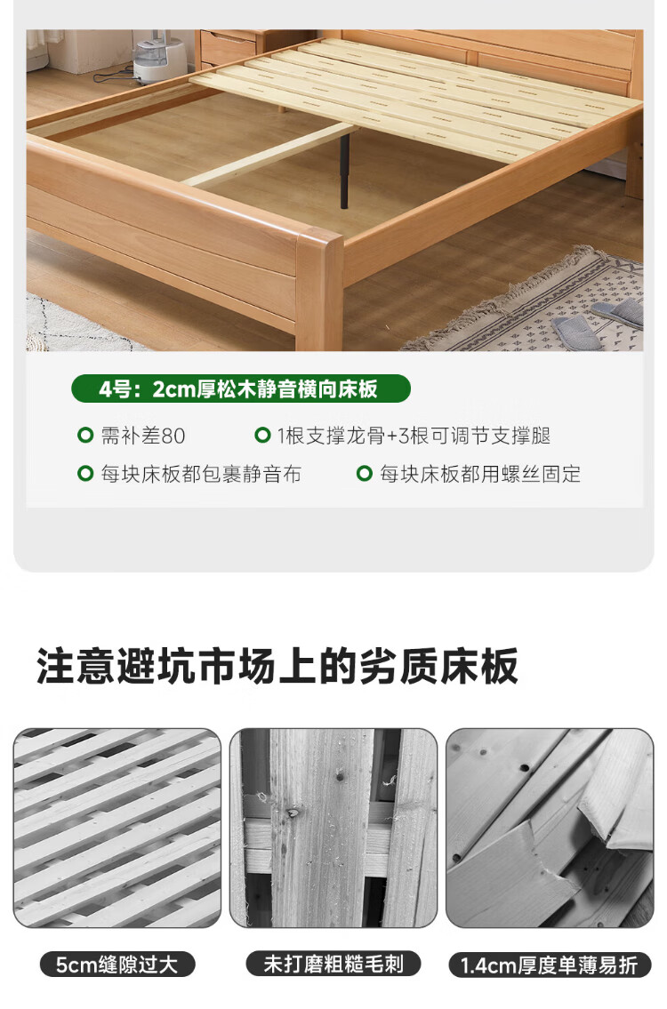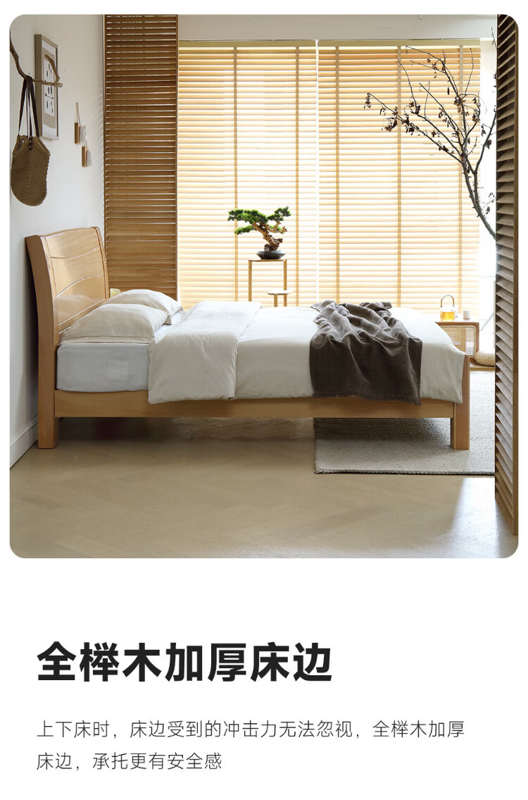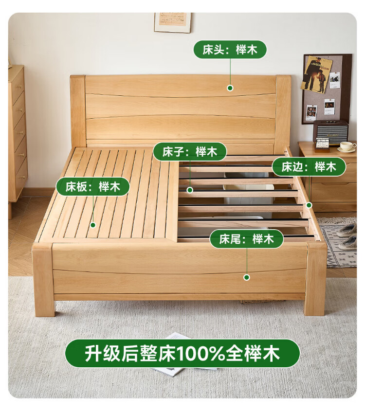 Virgin forest beech bed, all solid wood double bed, thickened simple solid wood large bed, beech furniture, log bed, master bedroom wedding bed, single bed, standard version 1.8*2.0 meters-2.7cm thick beech bedside + fir keel + pine bed board