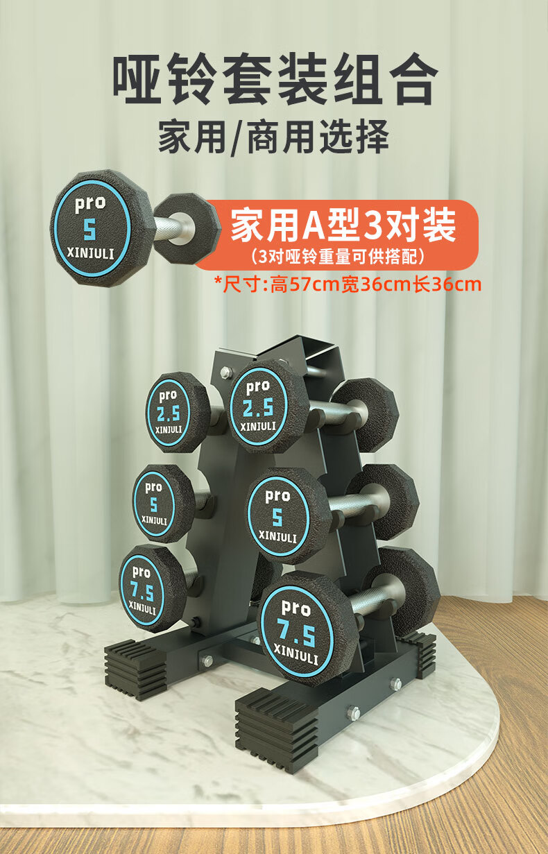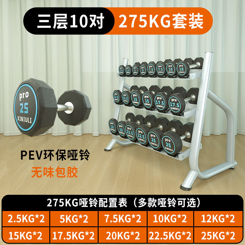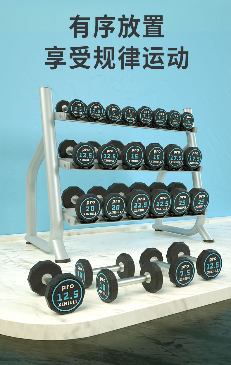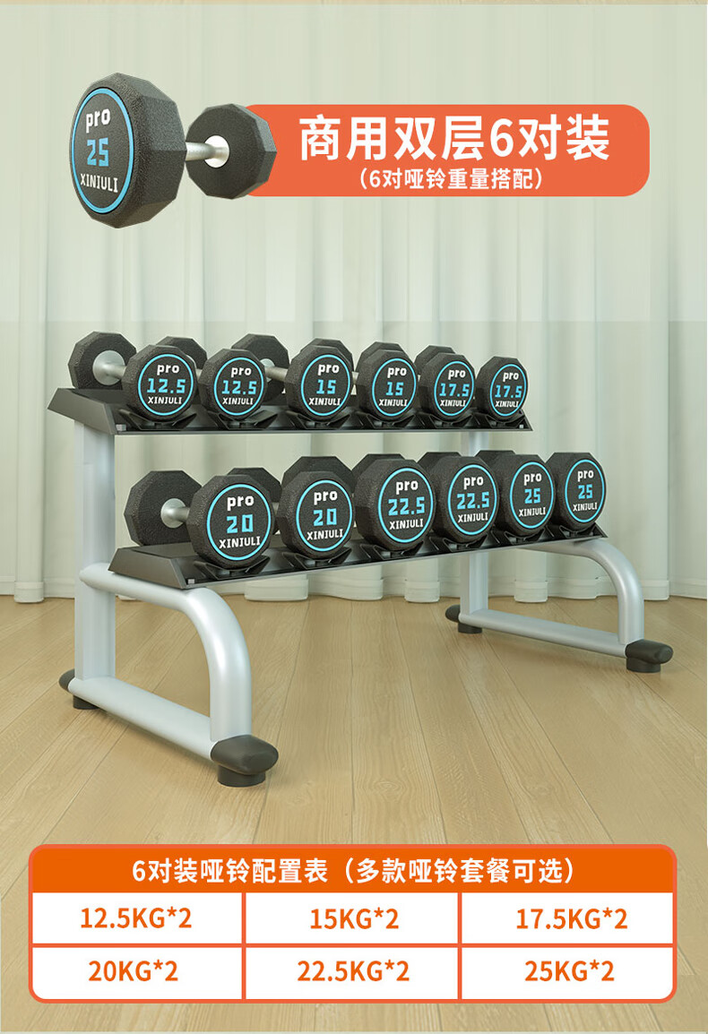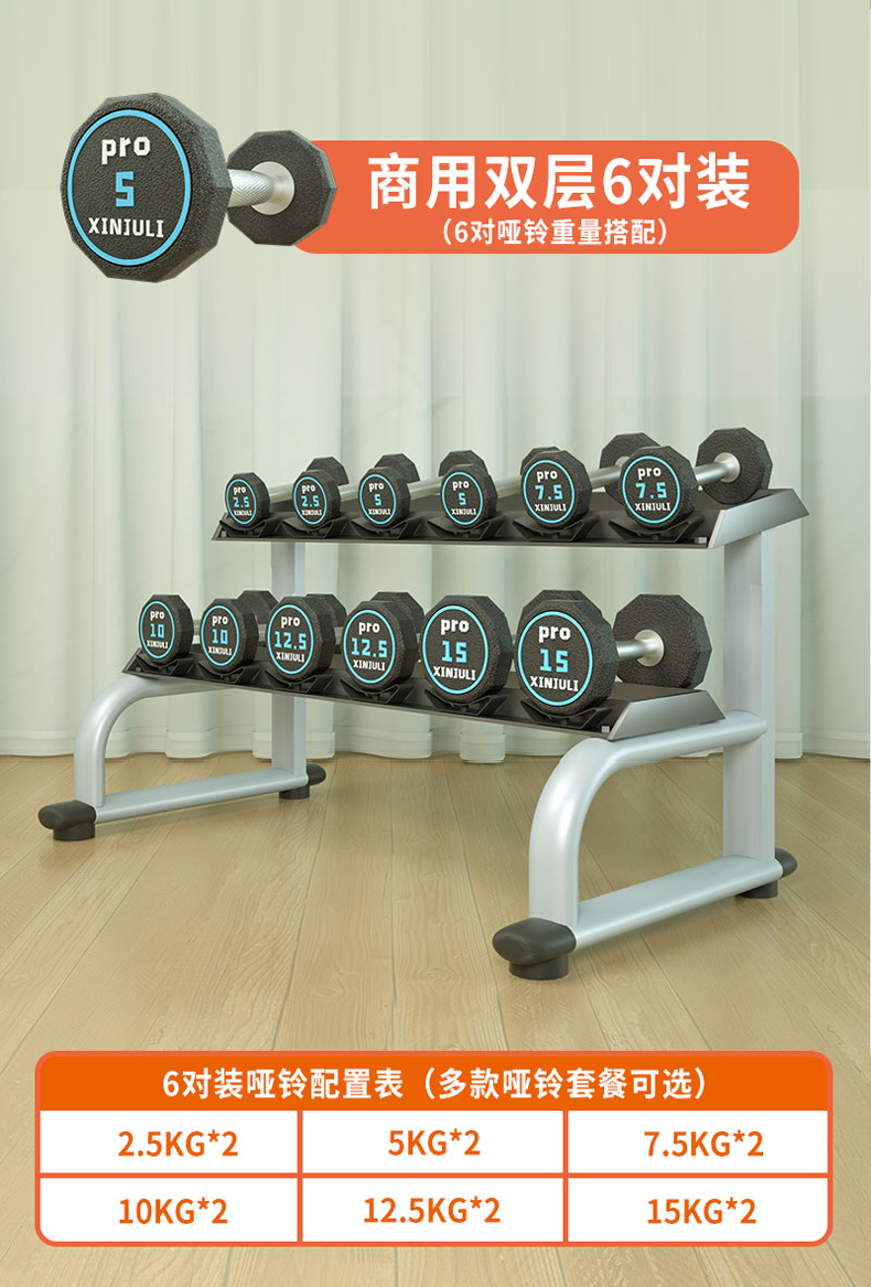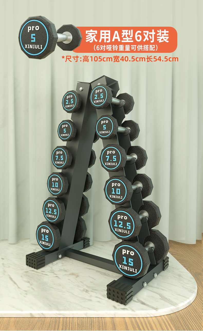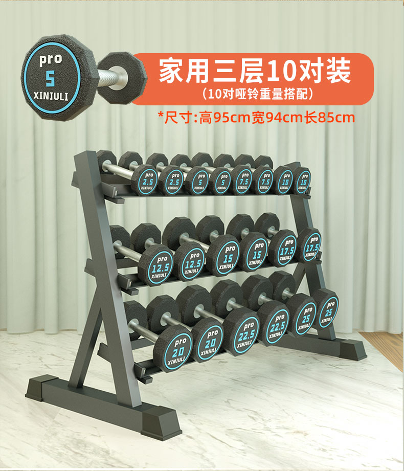 XINJULI fixed dumbbells for men and women, home fitness equipment, commercial personal training, solid rubberized combination polygonal dumbbell rack package, household three-layer 8 pairs of dumbbell rack package