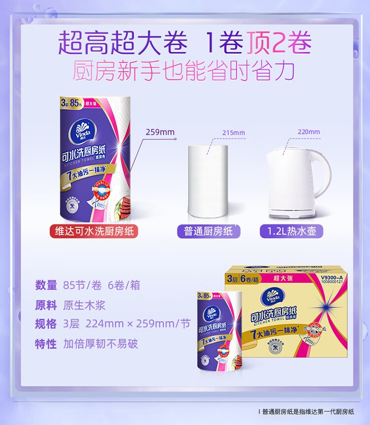 Vinda washable kitchen roll 3 layers 85 sections, dry and wet special paper towels for degreasing, decontamination, oil and water absorption, 3 layers 85 sections * 6 rolls, whole box