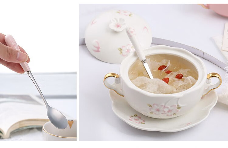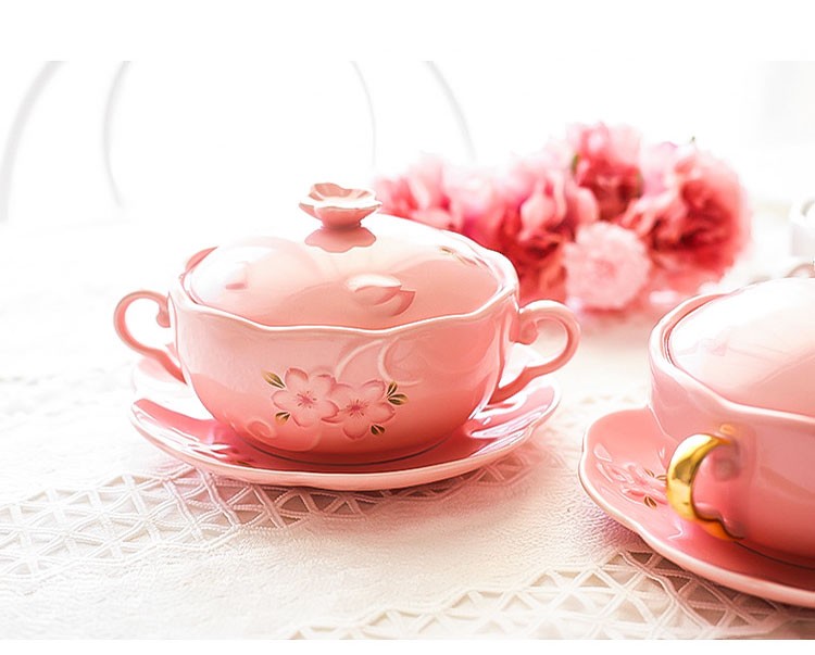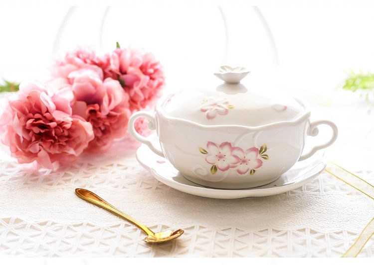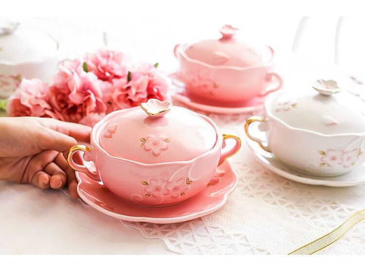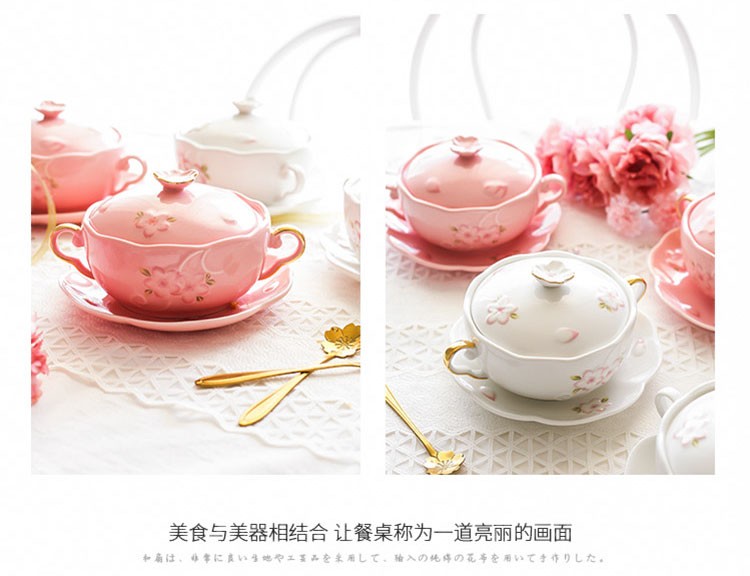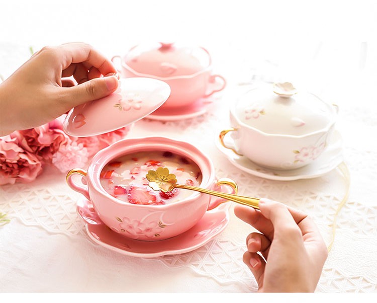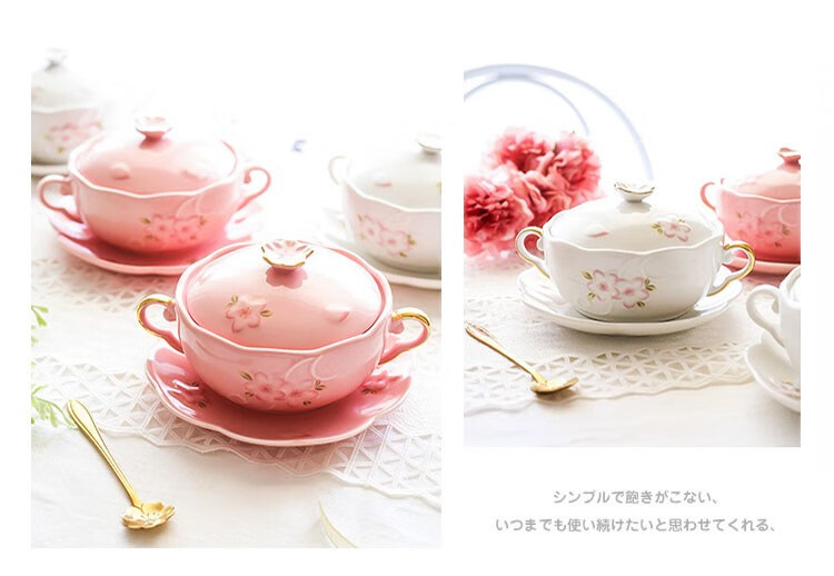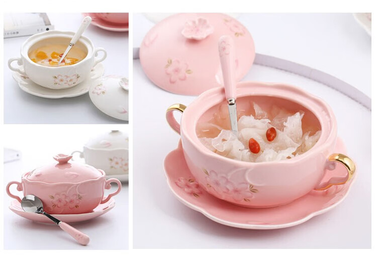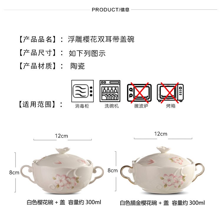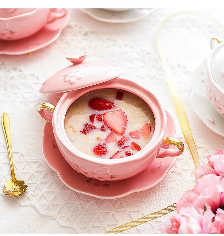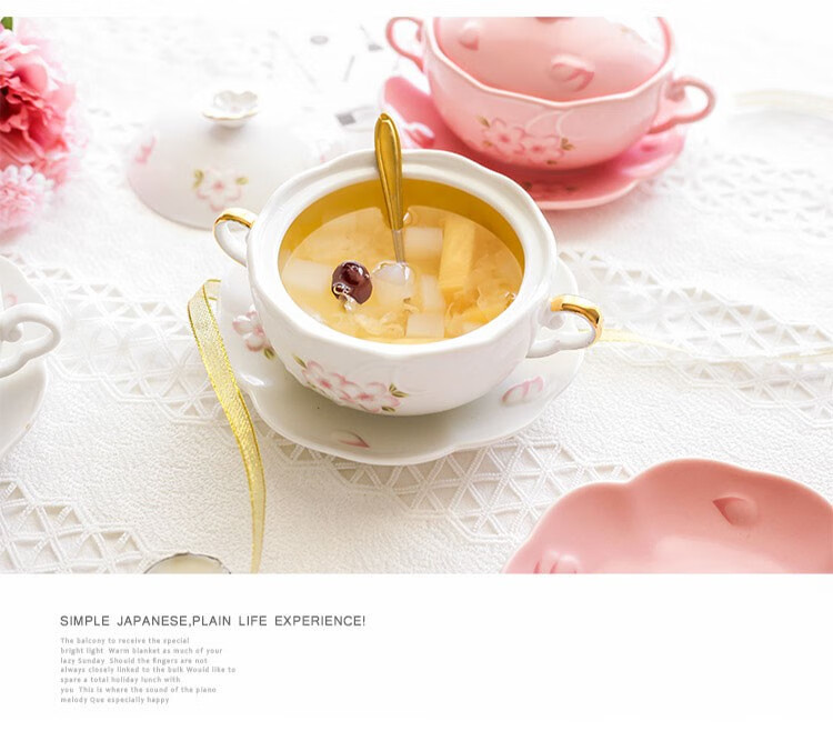 Jiayi Kitchen Japanese-style cherry blossom double-eared bowl with lid porridge bowl palace embossed sugar water dessert bowl steamed egg bowl ceramic bird's nest bowl stew pot white covered bowl + white plate + golden cherry blossom spoon