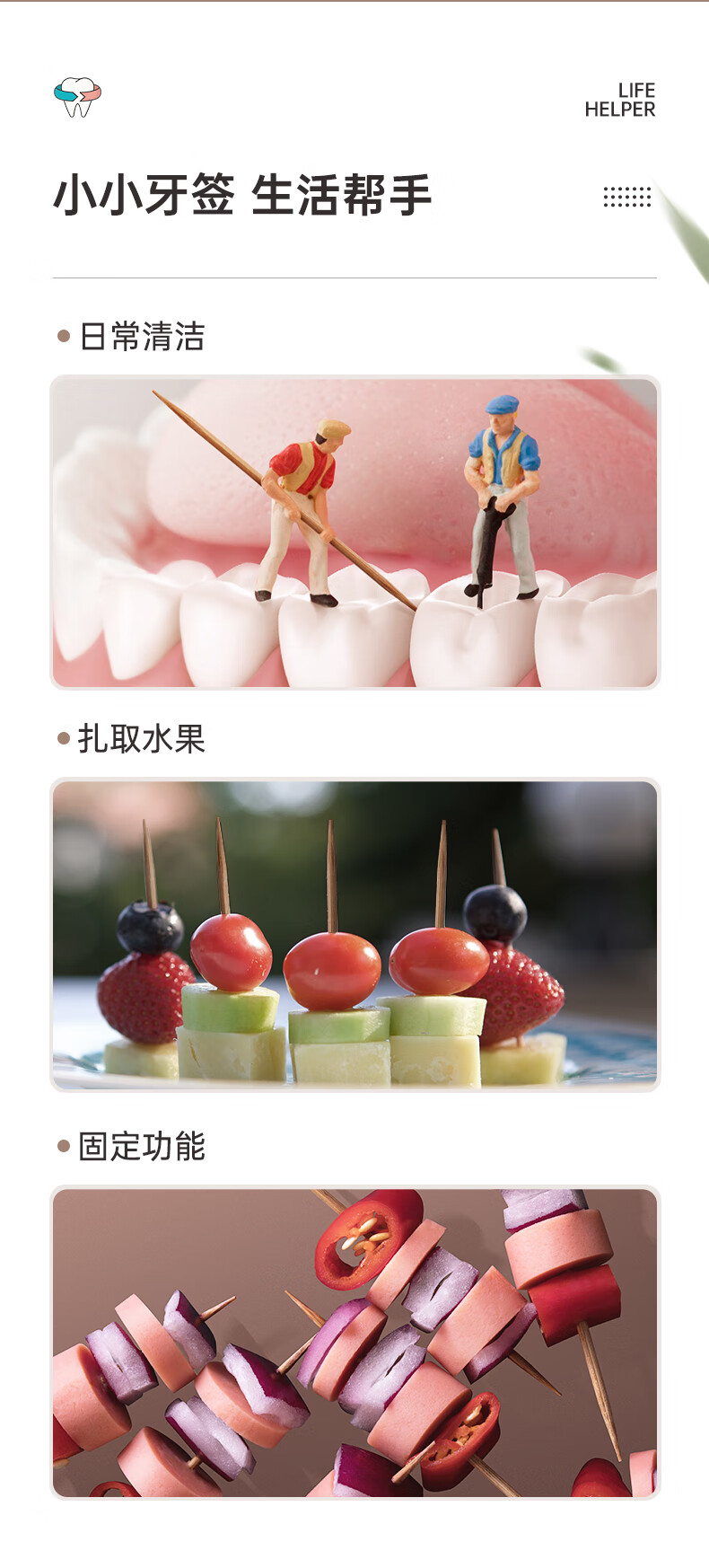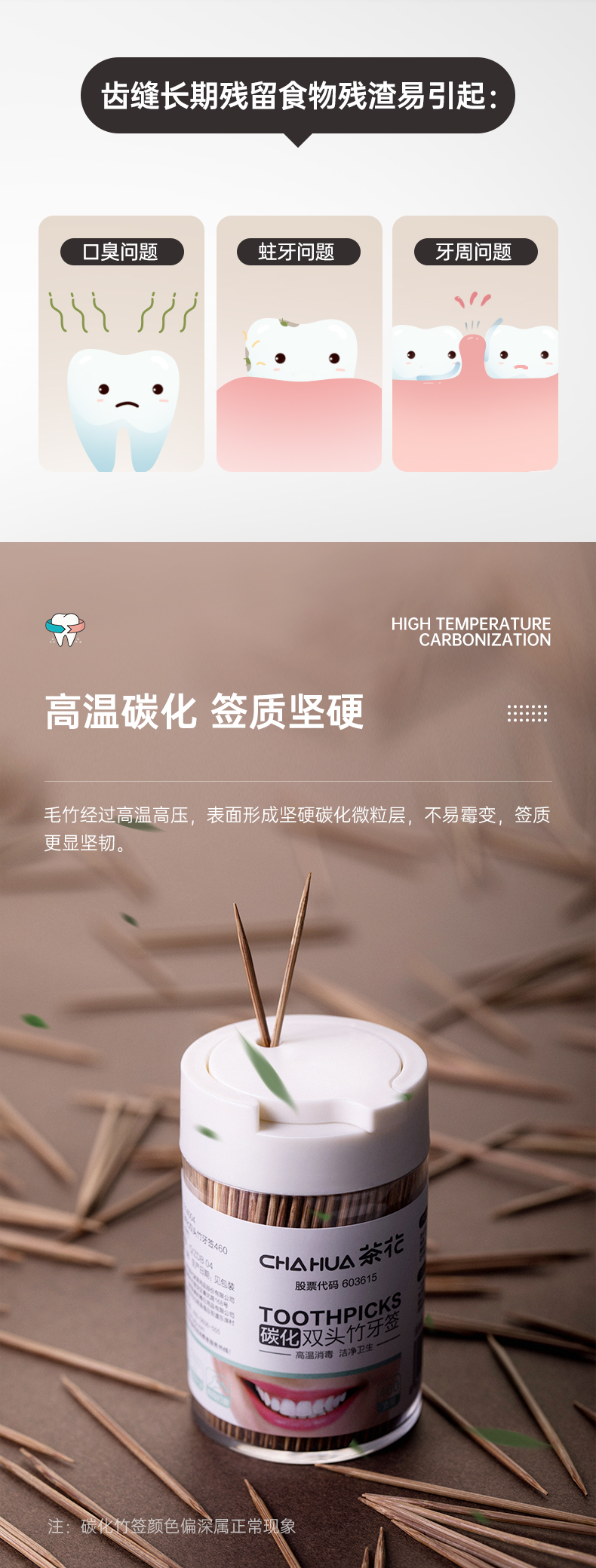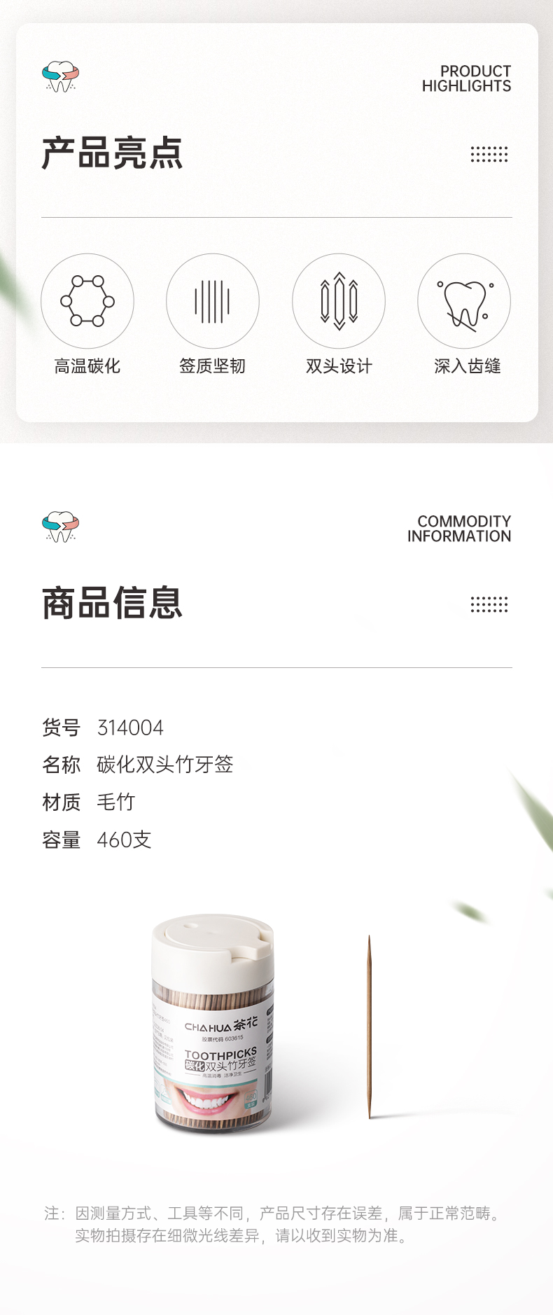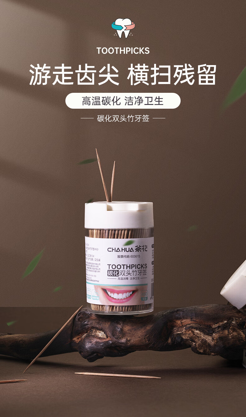 Camellia (CHAHUA) disposable carbonized bamboo toothpicks, independent cans, home restaurant fruit picks, portable double-headed thin and tough double-headed bamboo toothpicks 520 pieces