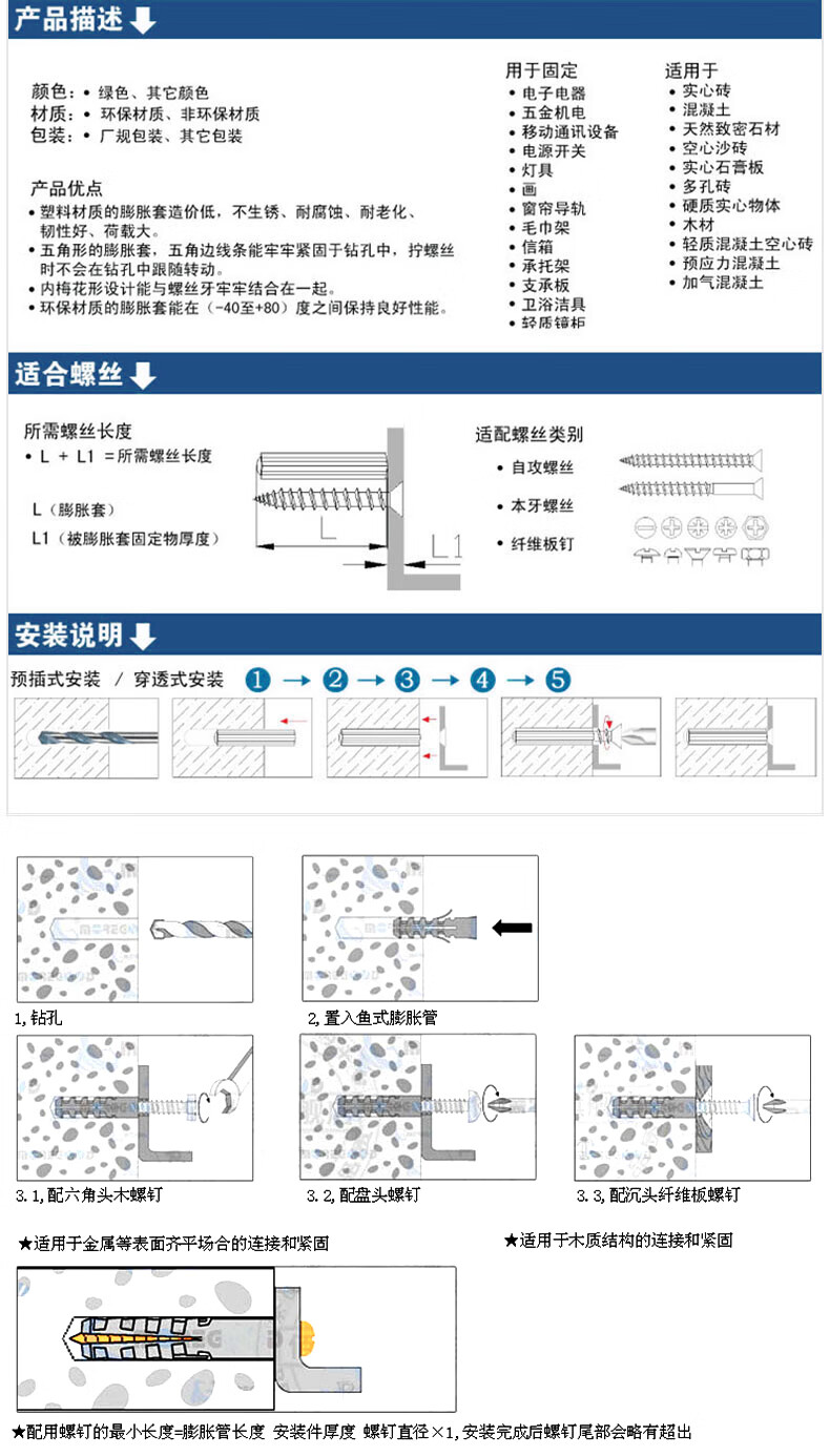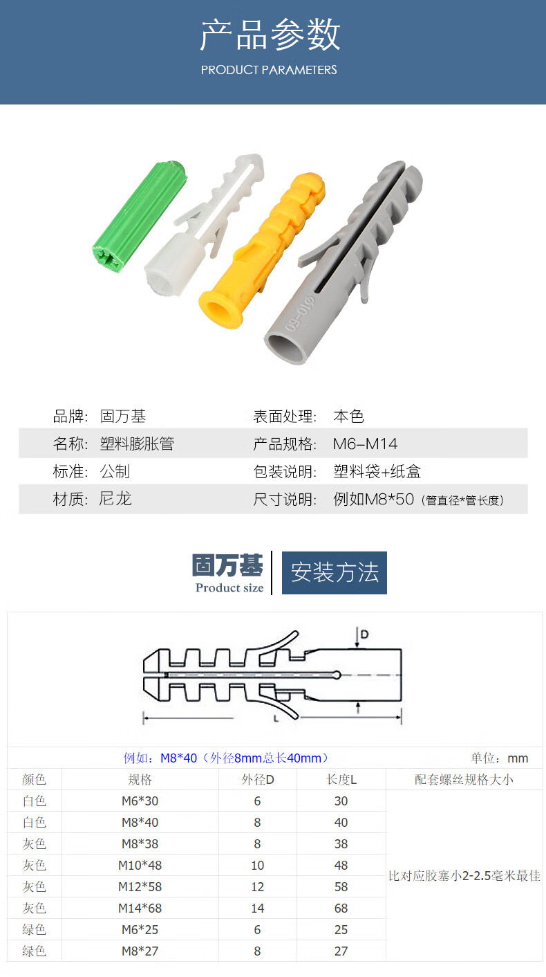Guwanji plastic expansion pipe M6M8 rubber plug expansion screw inner expansion bolt green nylon rubber wall plug expansion plug collection 100 pieces gray M6 x30 200 pieces