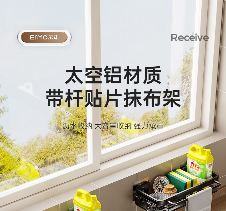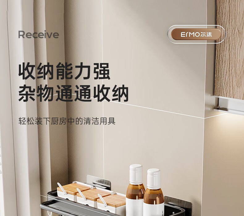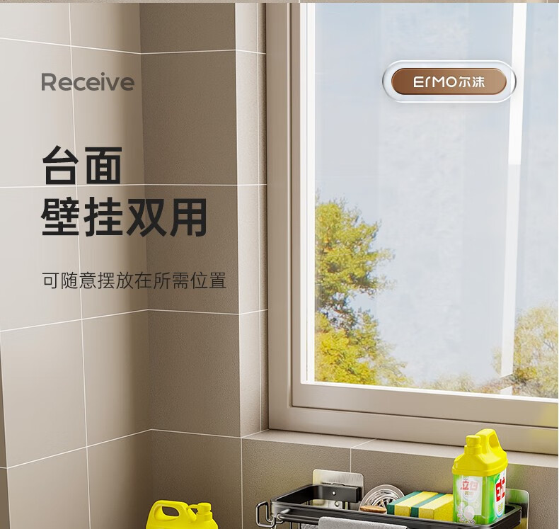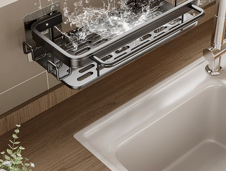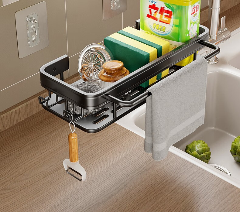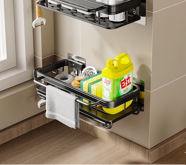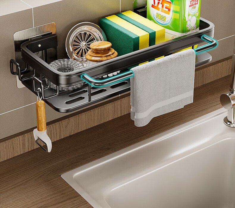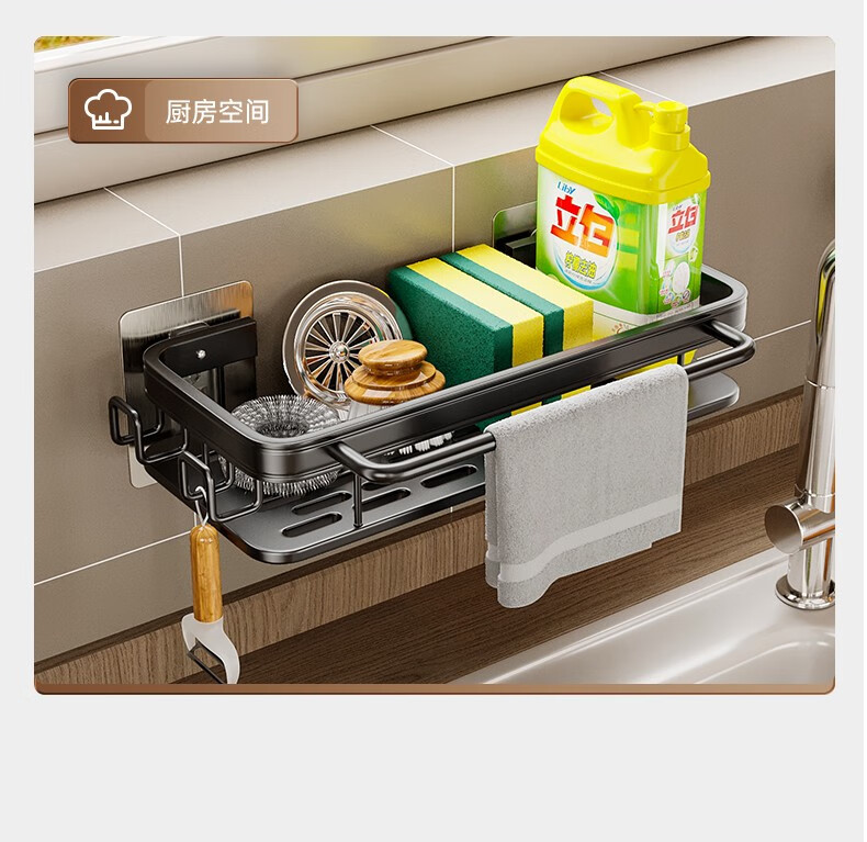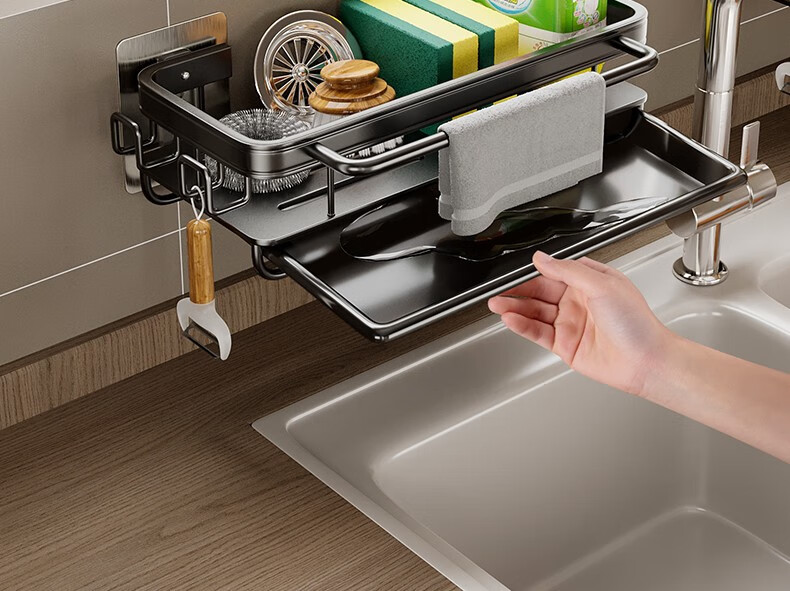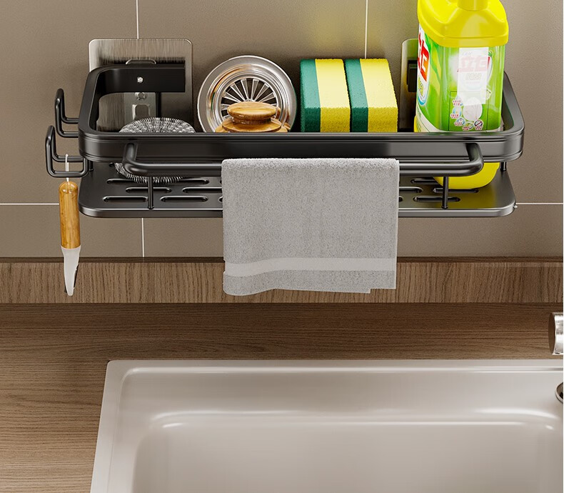 Ermo kitchen rack without punching, dishwashing liquid rag rack, drain rack, dishwashing sink, drain hanging basket, storage rack, gun ash 30cm, with rod, hook + drain tray