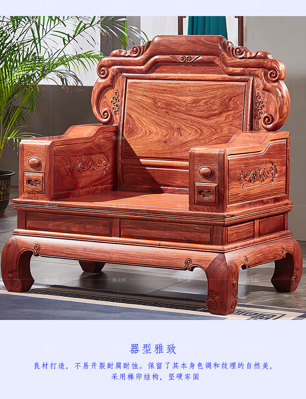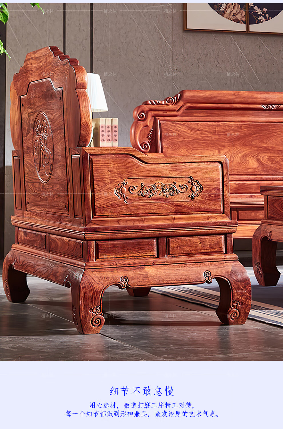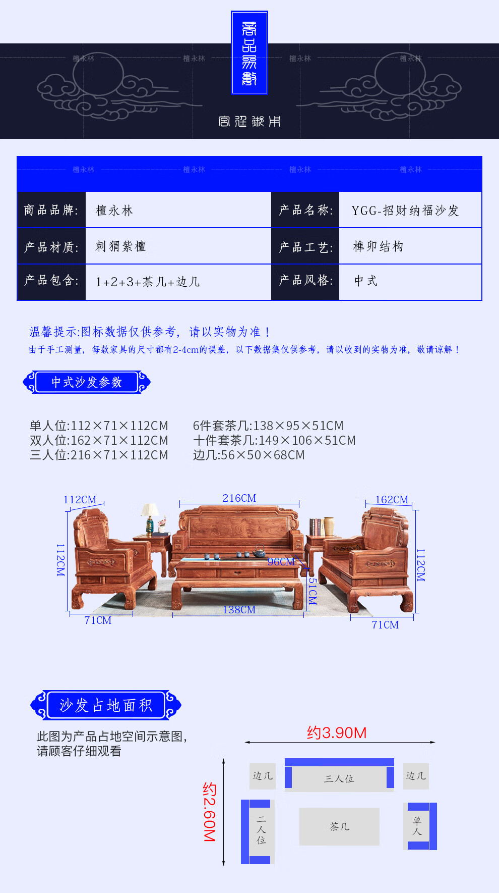 Tan Yonglin mahogany furniture African rosewood (scientific name: Hedgehog rosewood) sofa solid wood sofa complete combination Chinese villa living room furniture 113 six-piece set (2 singles + three + coffee table + 2 side tables)