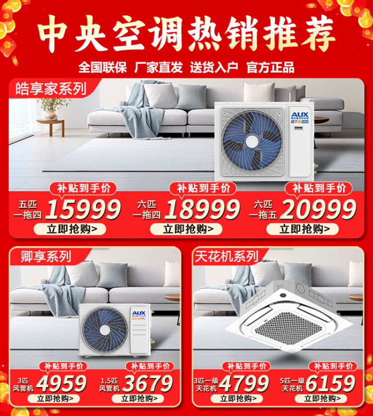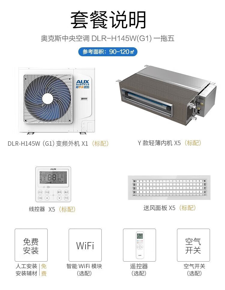 AUX central air-conditioning duct unit 4P5P6P one-to-four/one-to-three/one-to-five one-to-six multi-online frequency conversion first-class energy efficiency embedded air conditioner one price all-inclusive 5 HP first-class energy efficiency 120W (G1) one-to-four multi-online bare metal upgrade model