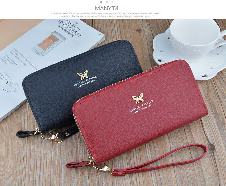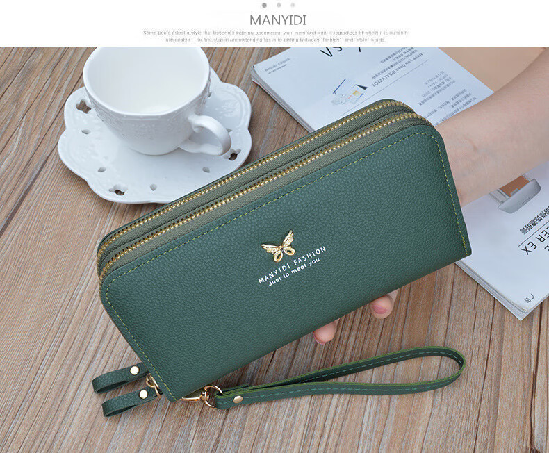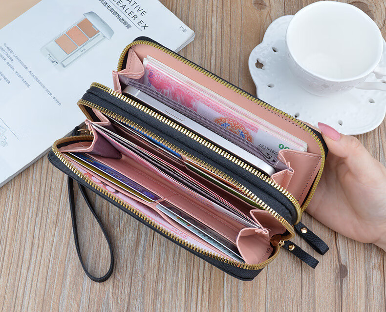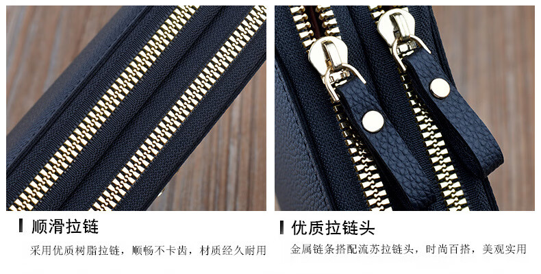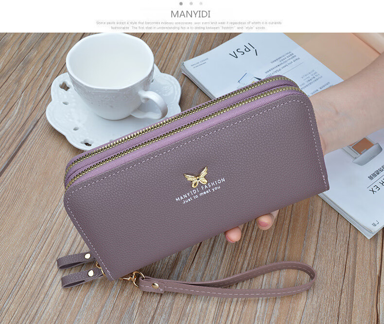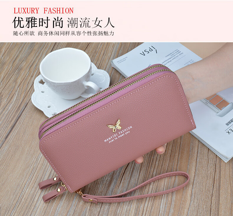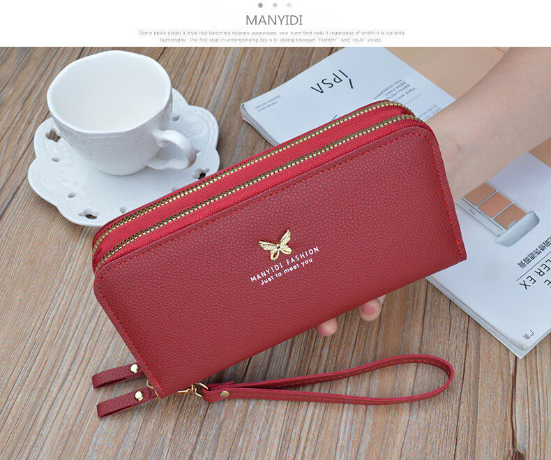 New style portable wallet for women, long double zipper clutch bag, large capacity double layer mobile phone bag, fashionable litchi pattern wallet, maroon