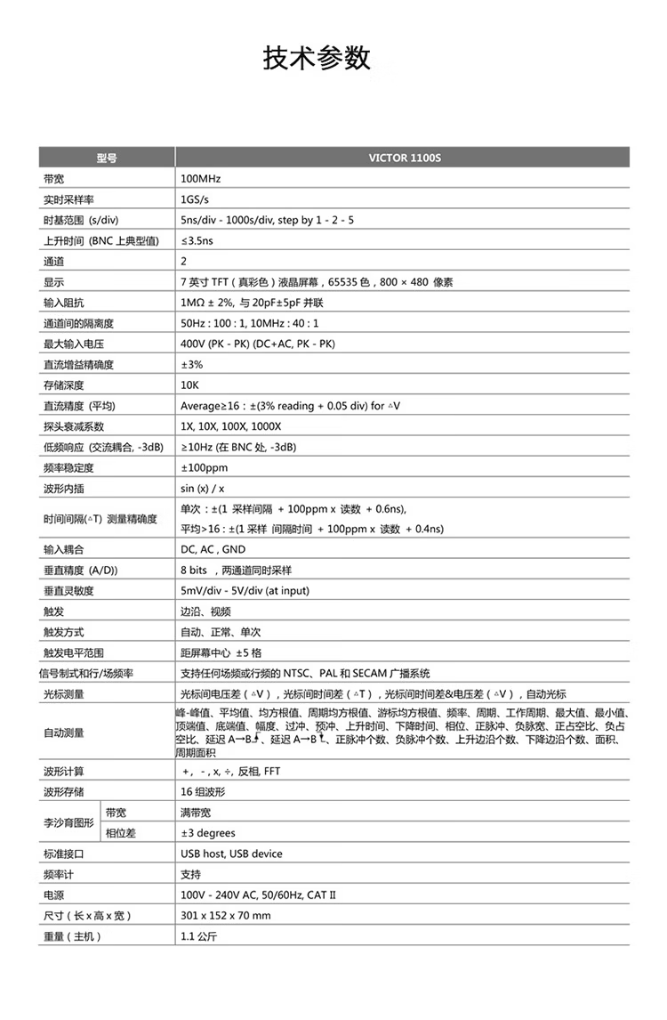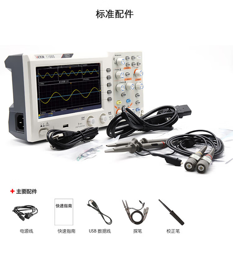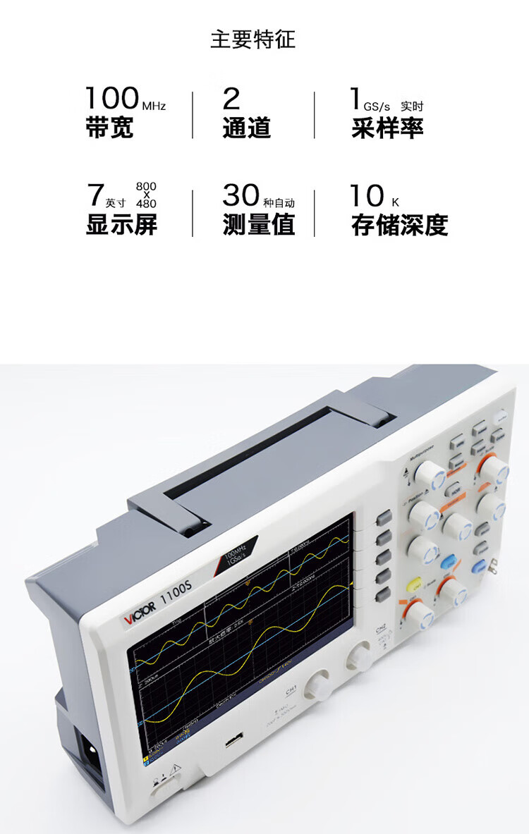 Victory Instrument (VICTOR) oscilloscope, high-precision dual-channel digital storage oscilloscope, multi-function digital display desktop waveform display with probe, sampling rate 1GSs/s bandwidth 100MHz VC1100S