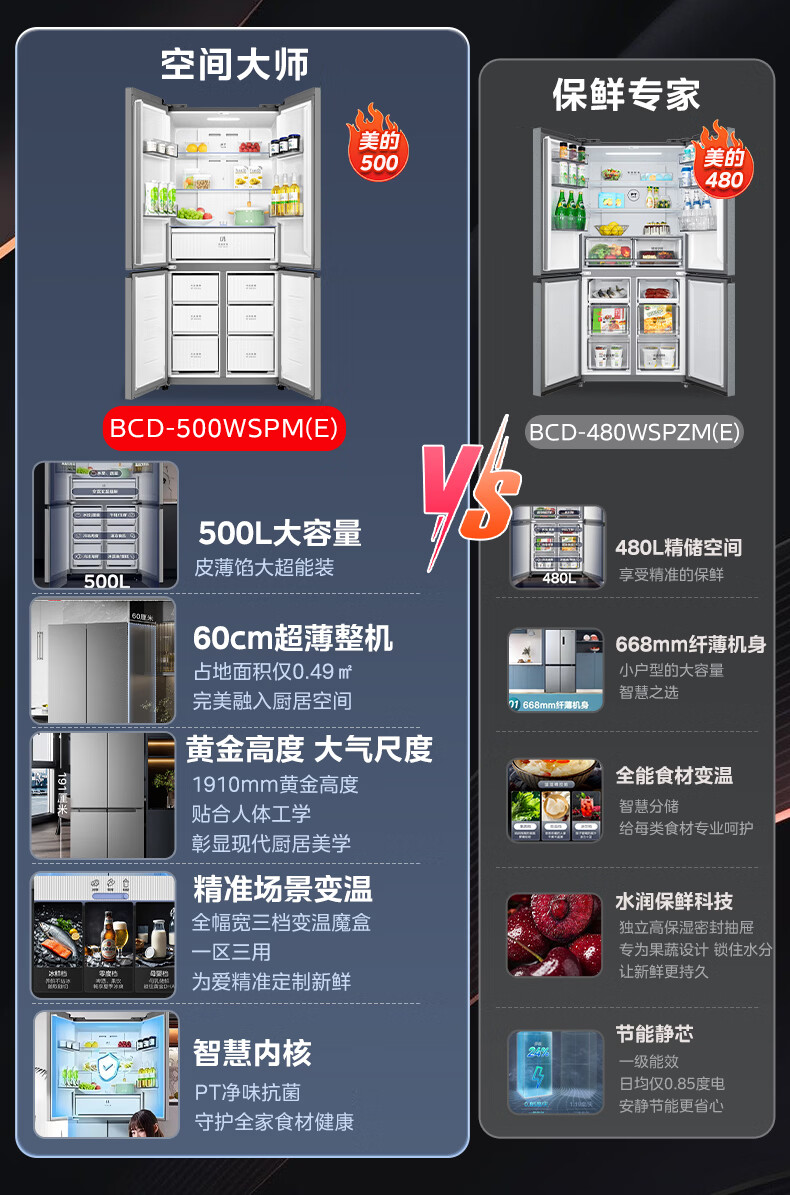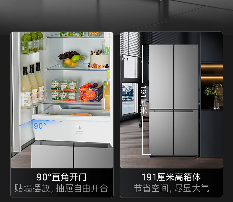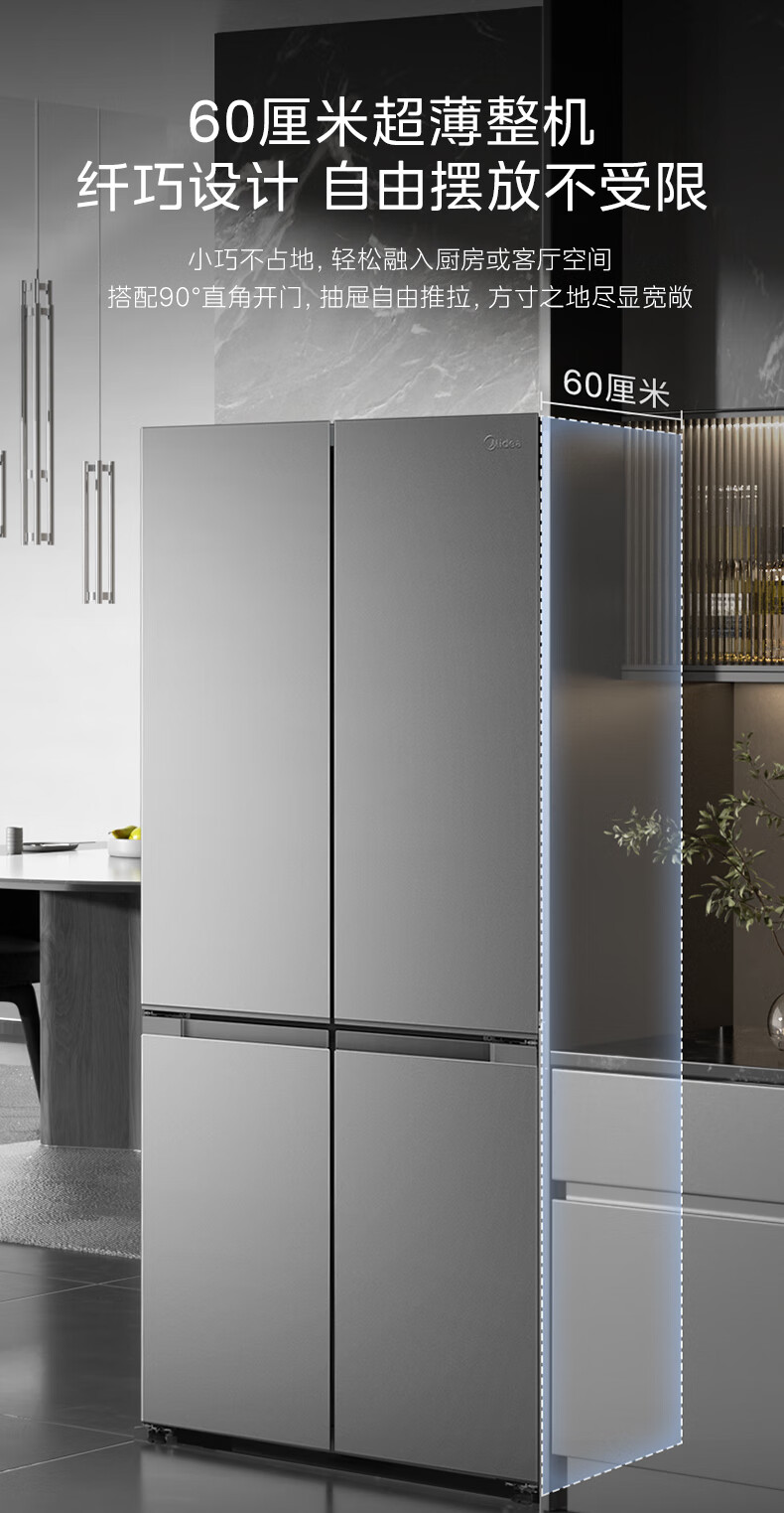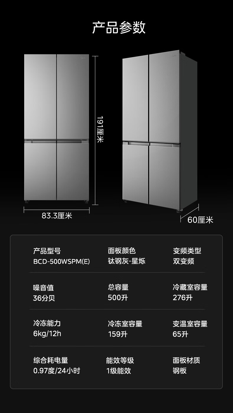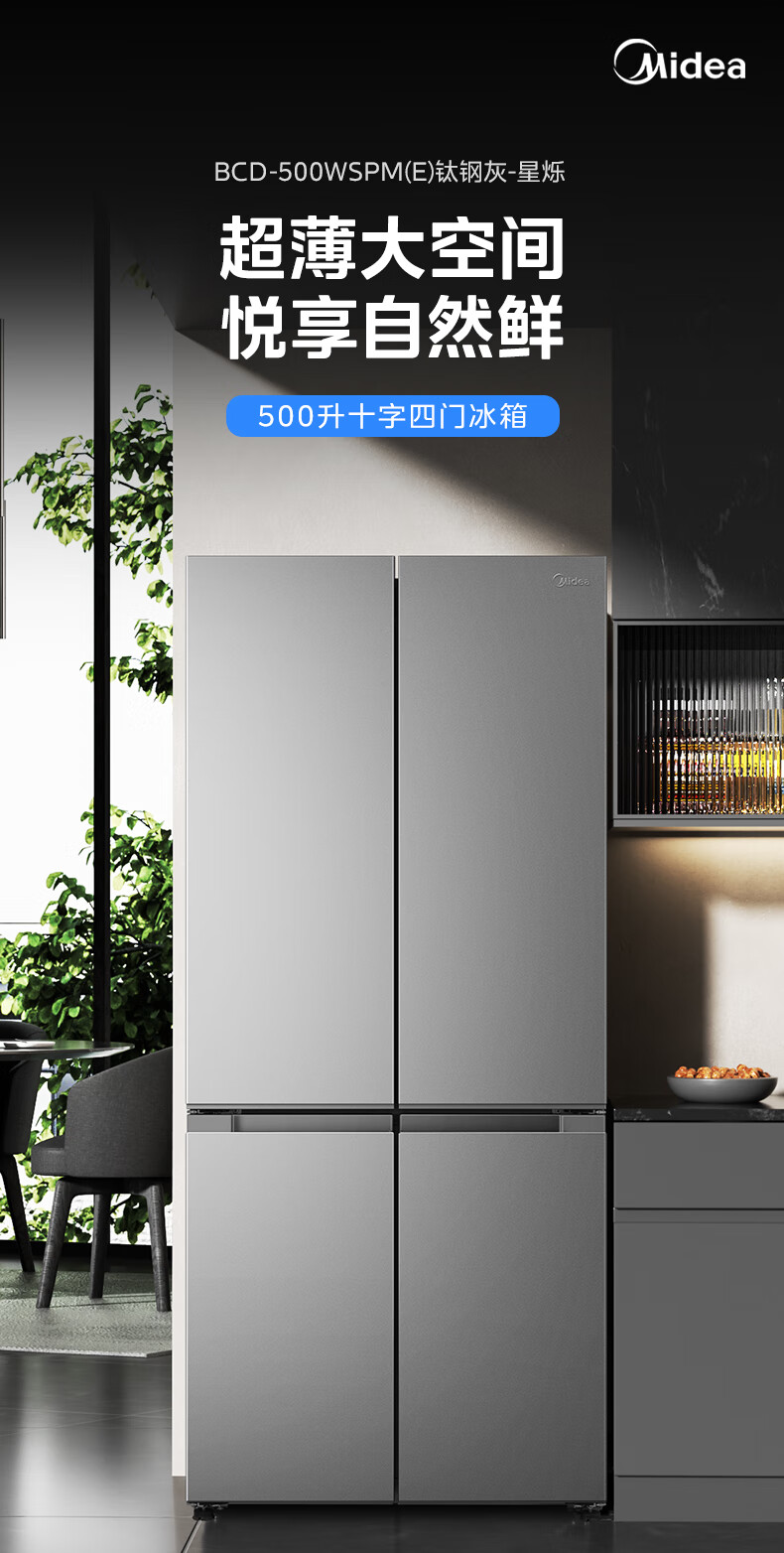 Midea 60cm ultra-thin 500-liter cross-shaped four-door ion odor-purifying and fresh-keeping first-level variable frequency air-cooled frost-free smart home large-capacity refrigerator with national subsidy of 480 upgraded model BCD-500WSPM(E)
