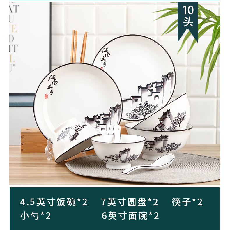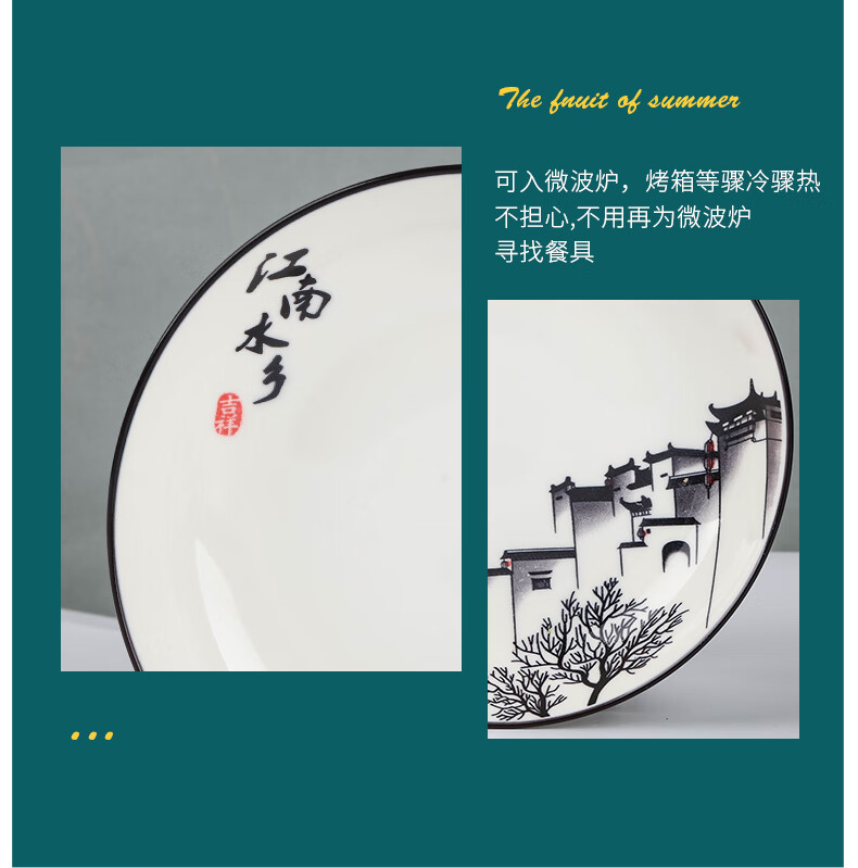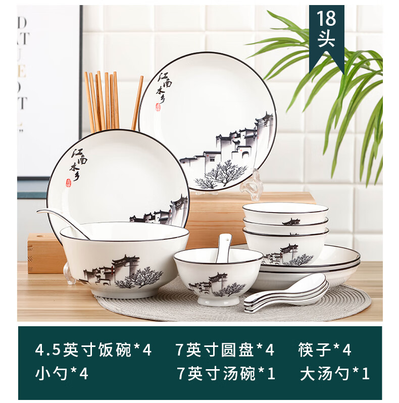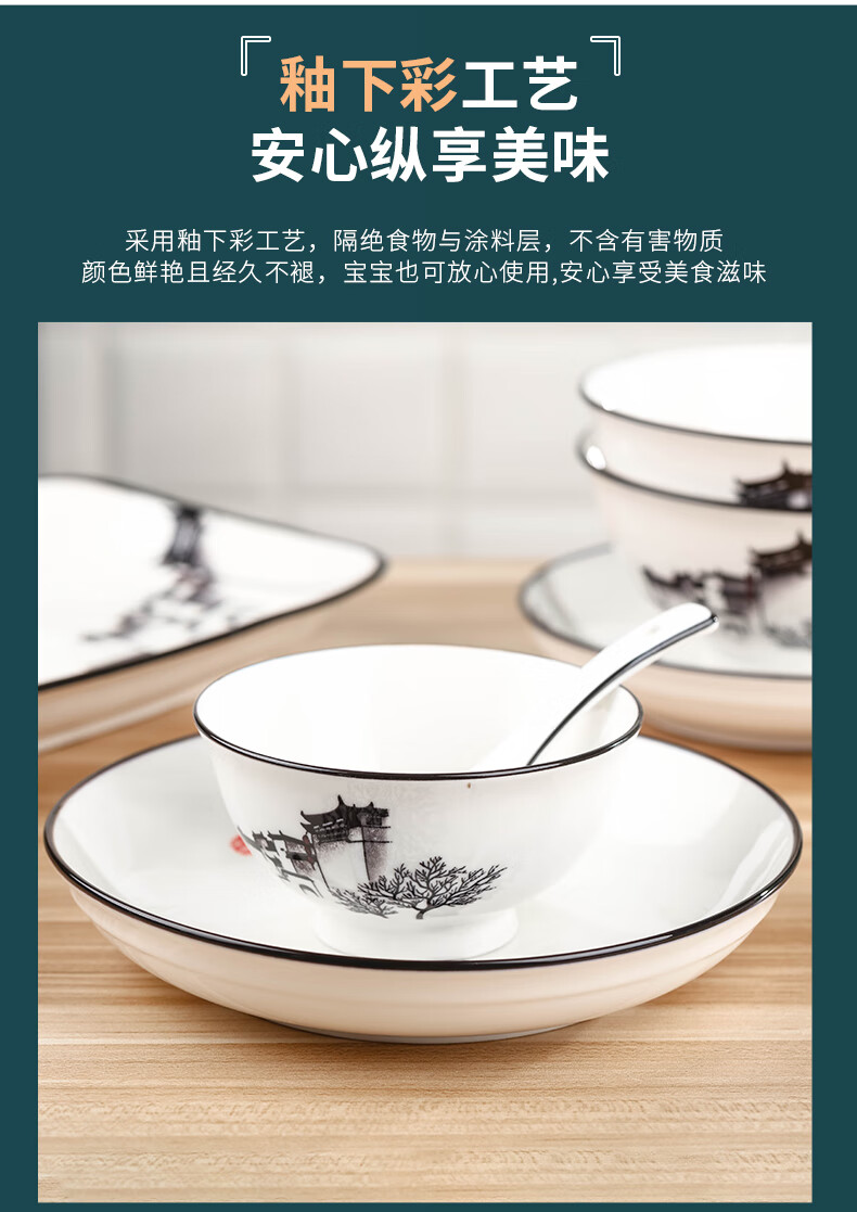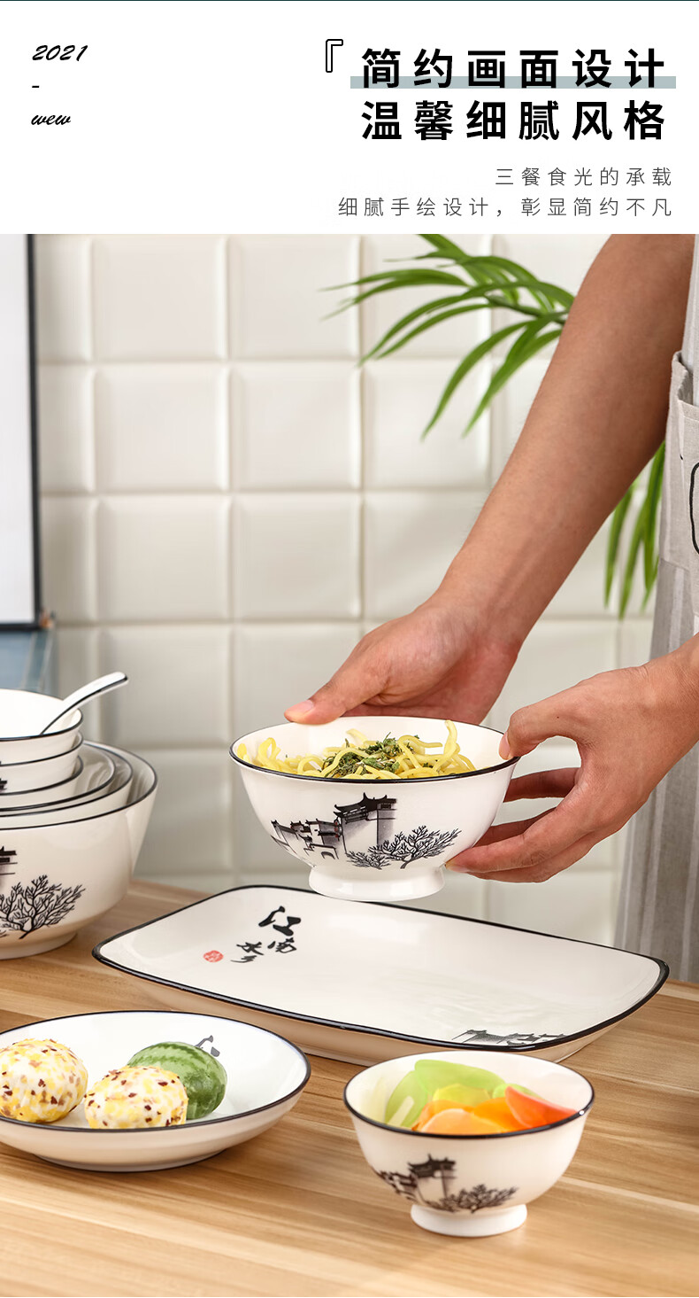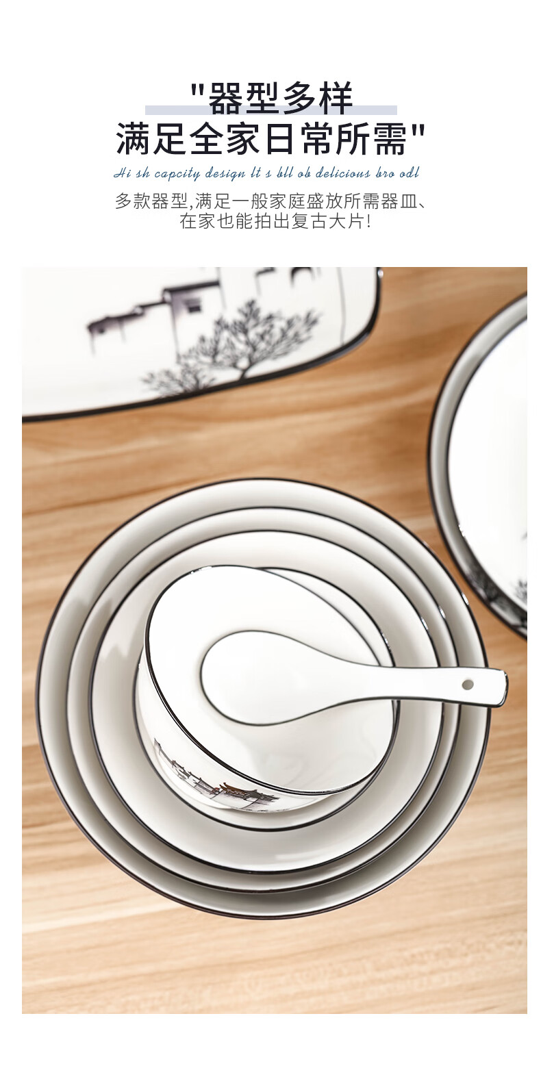 Fengfeisha 2-6 people bowl and dish set Chinese style household ceramic new bowl plate noodle bowl soup bowl couple bowl and chopsticks combination tableware Jiangnan Water Town 27 heads with soup bowl