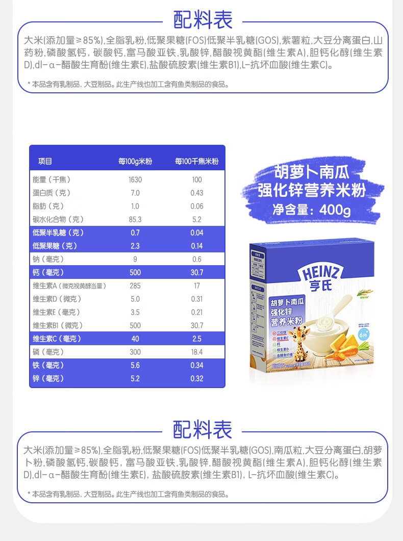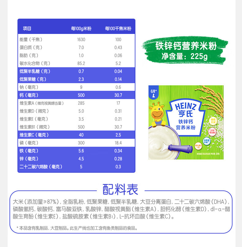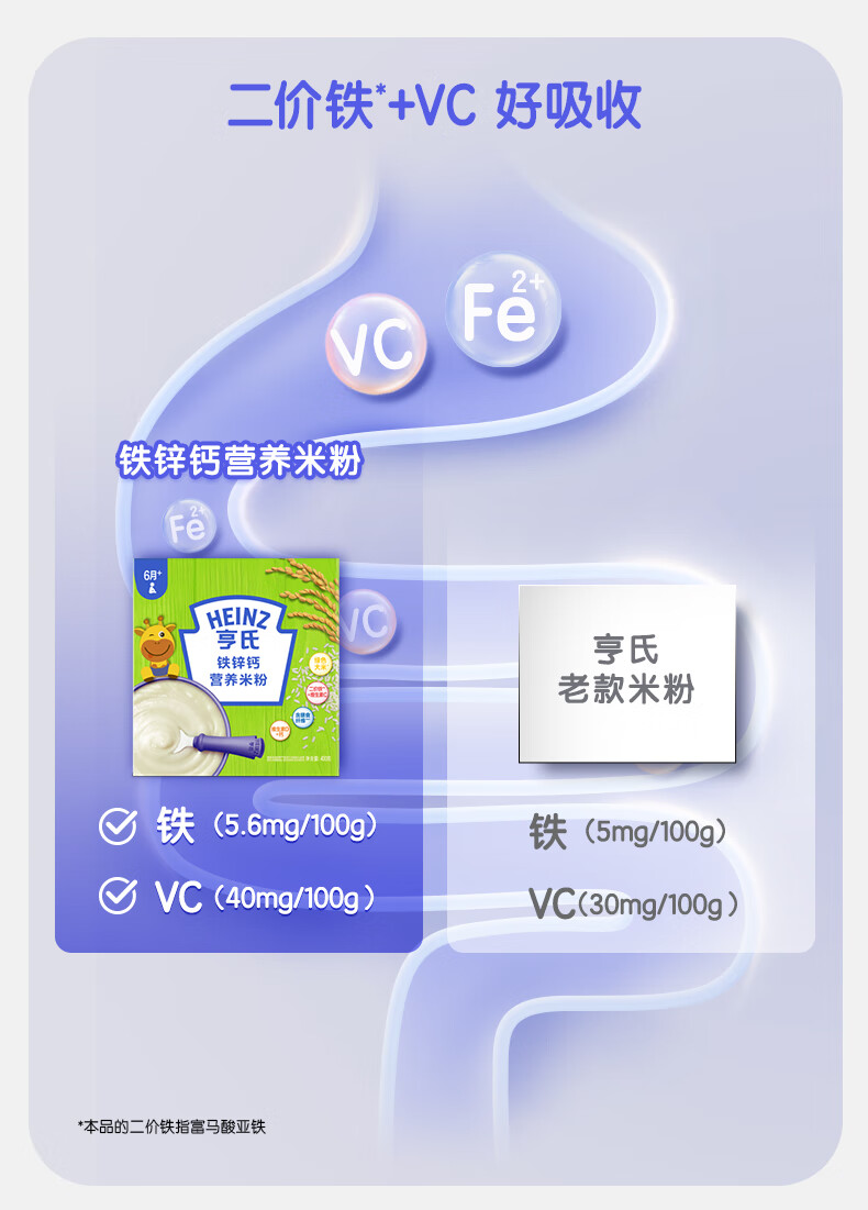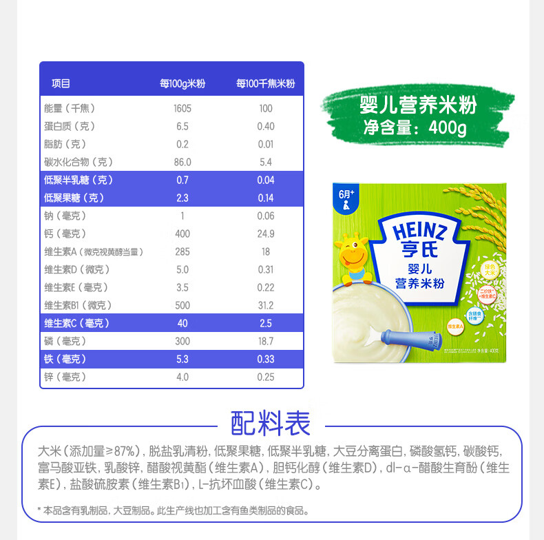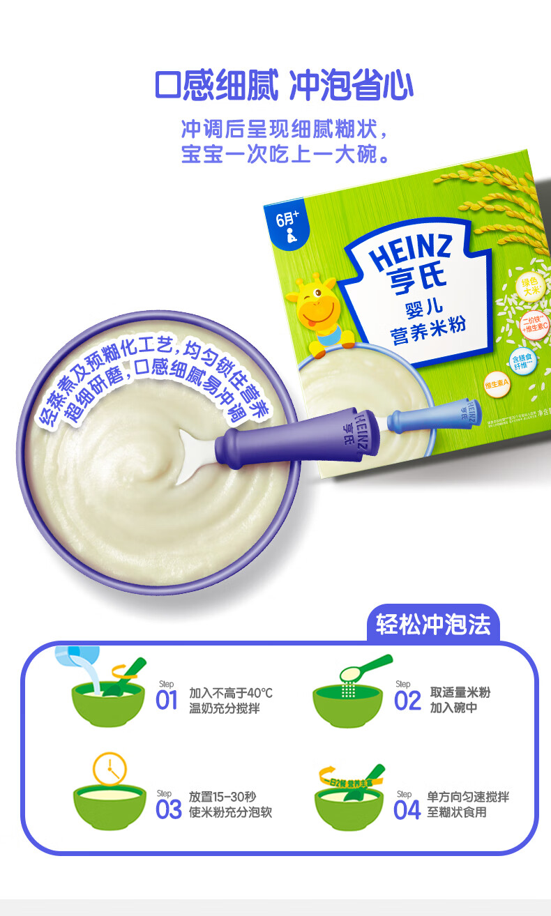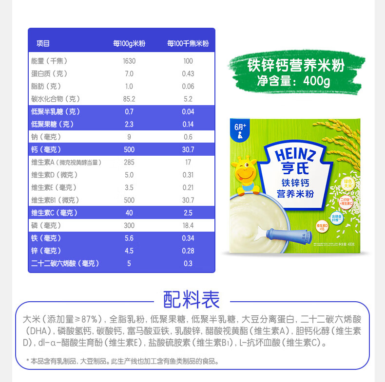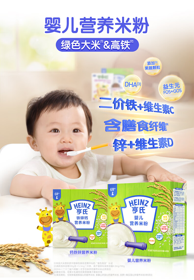 Heinz 2 boxes of infant nutrition high iron rice cereal baby food supplement fortified iron rice cereal (for 6-36 months) iron zinc calcium rice cereal 400g*2 boxes