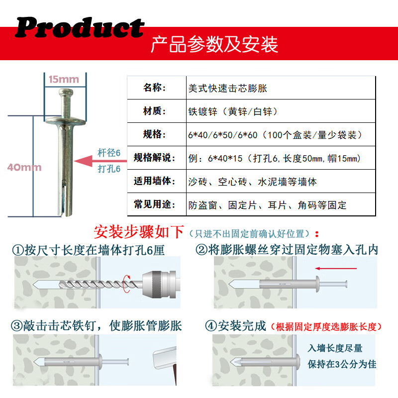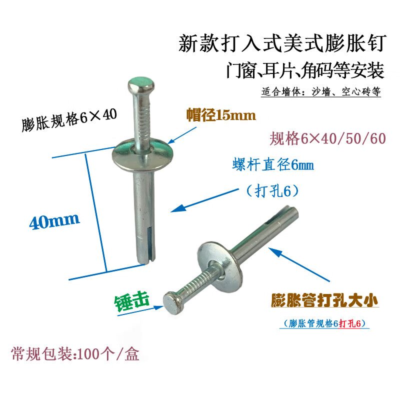 Drill-in American expansion nails, quick core nails, anti-theft net screws, hollow bricks, galvanized internal expansion round heads, M6, customized by the manufacturer, 6 40 white zinc (100 pcs)