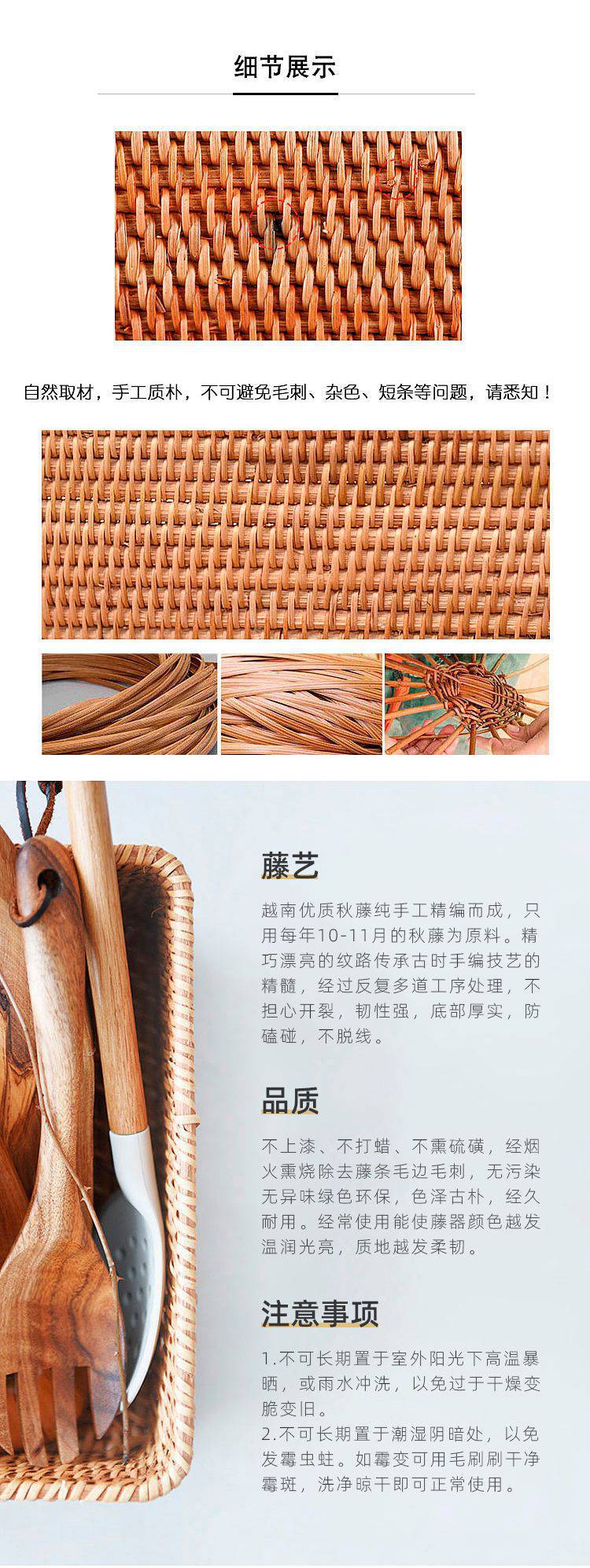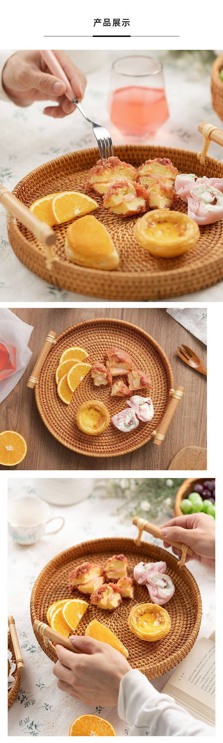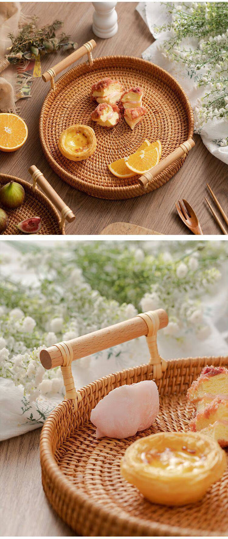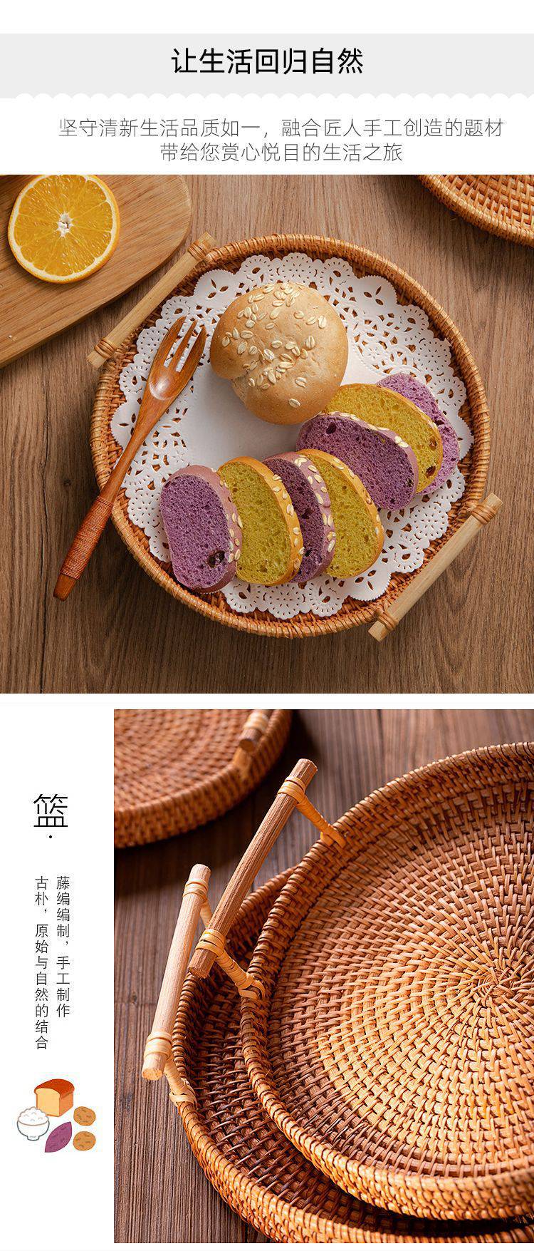 Rattan coasters, rattan trays, Japanese woven bread baskets, candy and fruit baskets, handmade bamboo woven plates, steamed bun baskets, home snack trays, rattan coasters, solid wood handles, XL size, default
