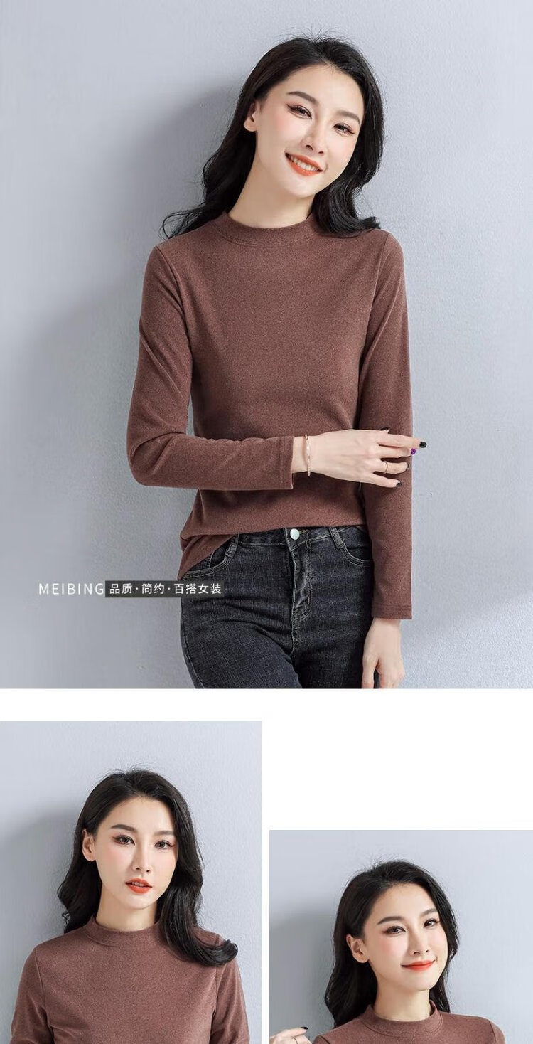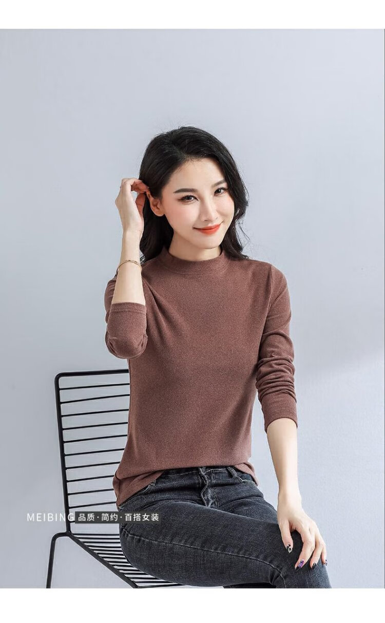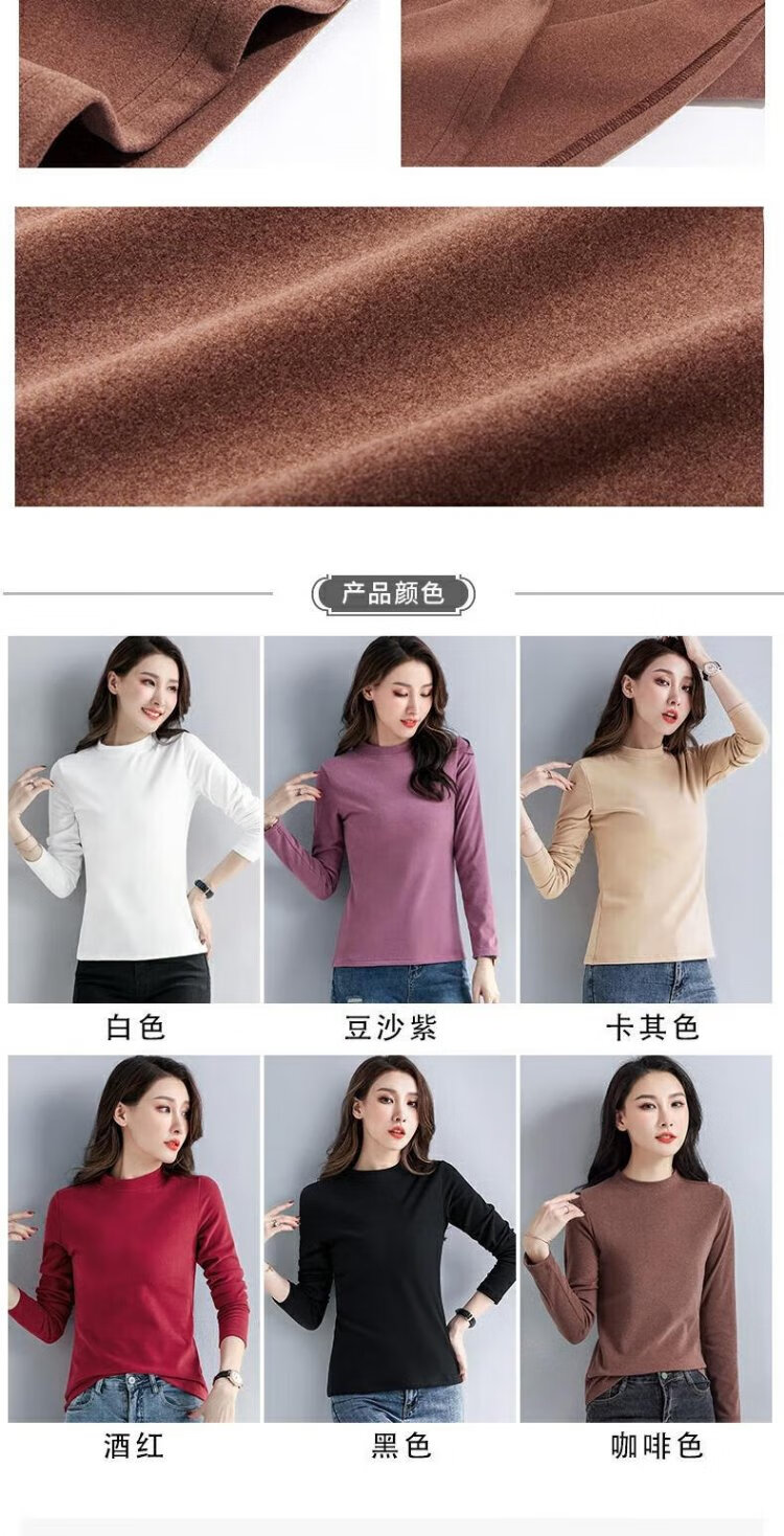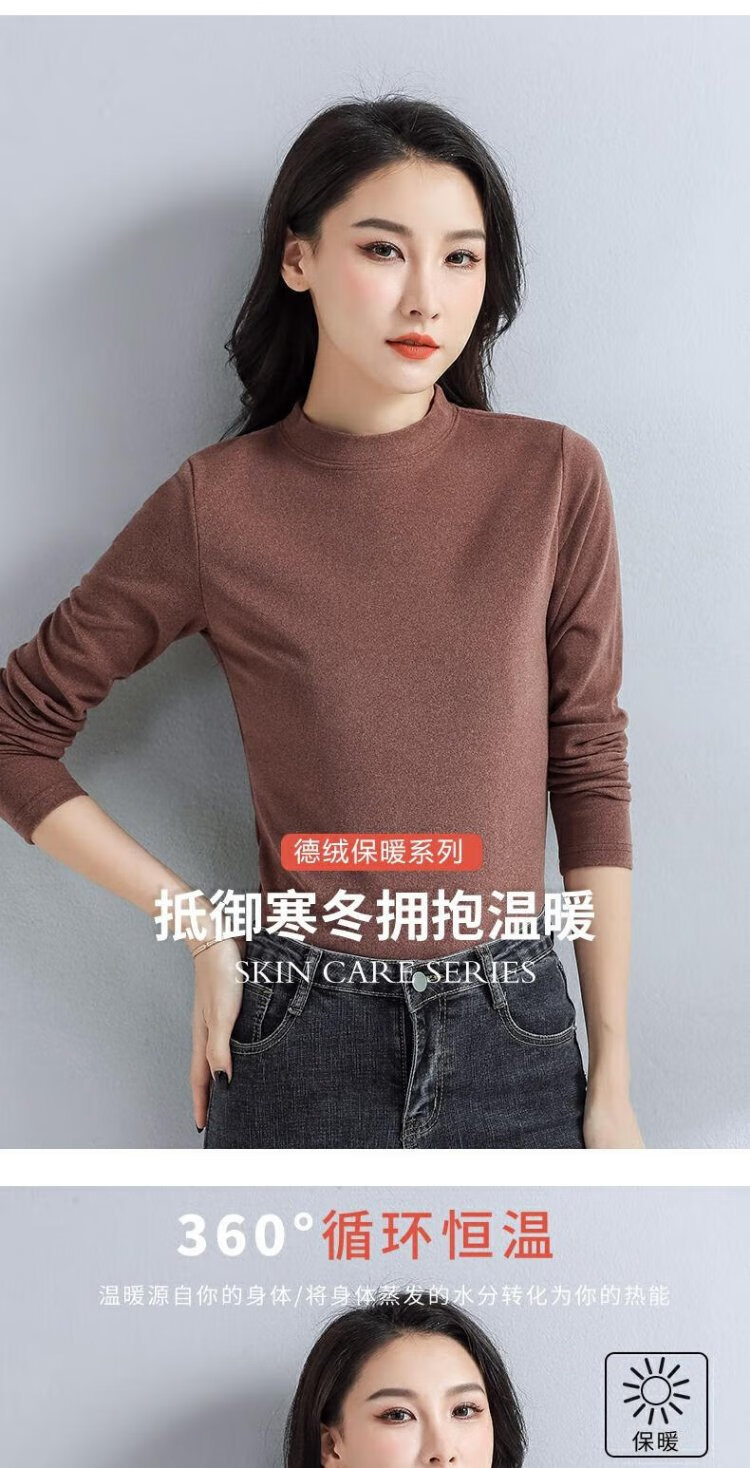 Qiji DeRong half turtleneck bottoming shirt for women in autumn and winter, western style plus velvet thickened warm top with long-sleeved autumn coat, brown L, recommended (100-110 catties)