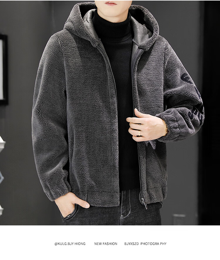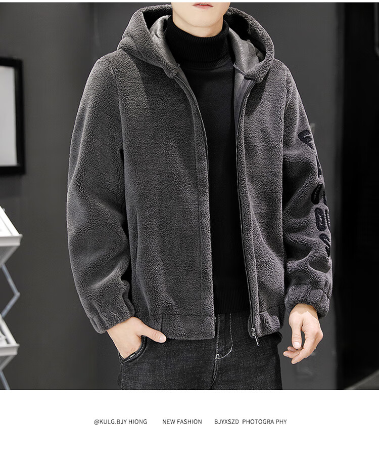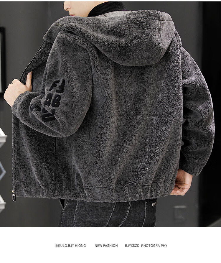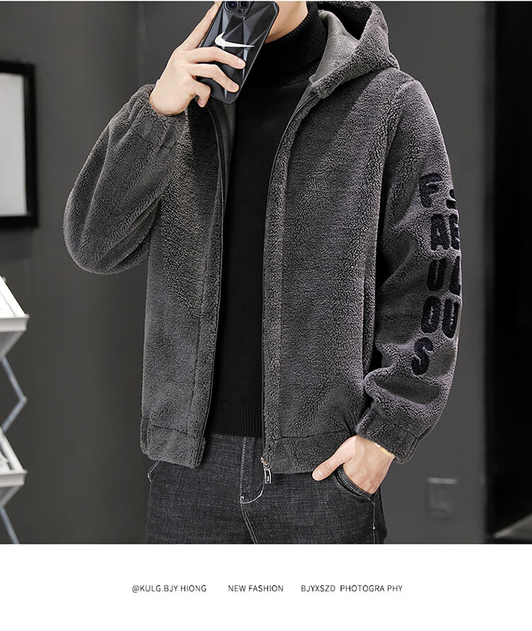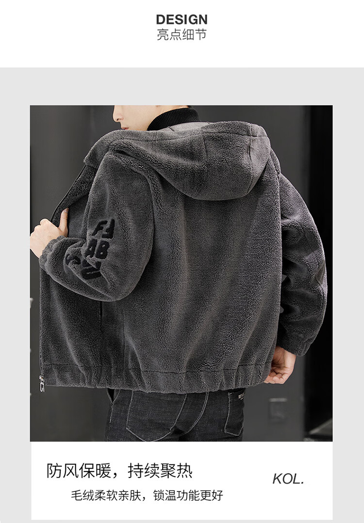 ROMON autumn and winter sheep sheared hooded woolen jacket plus velvet and thickened fur all-in-one men's embroidered cardigan jacket hooded gray 2XL (recommended 130-145 pounds)