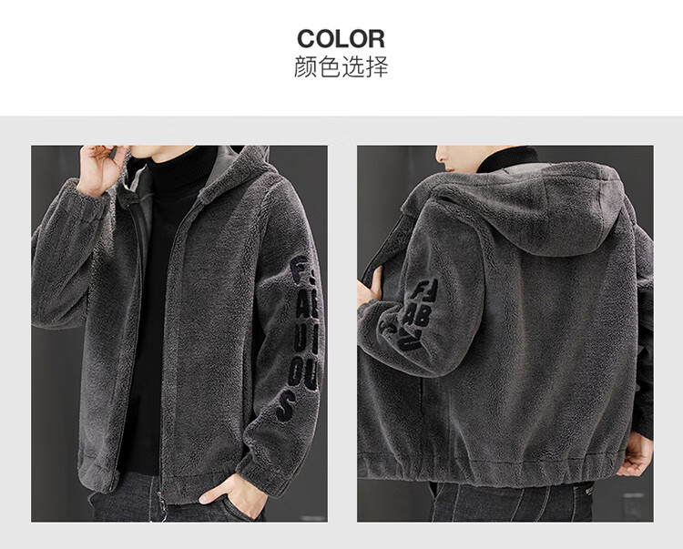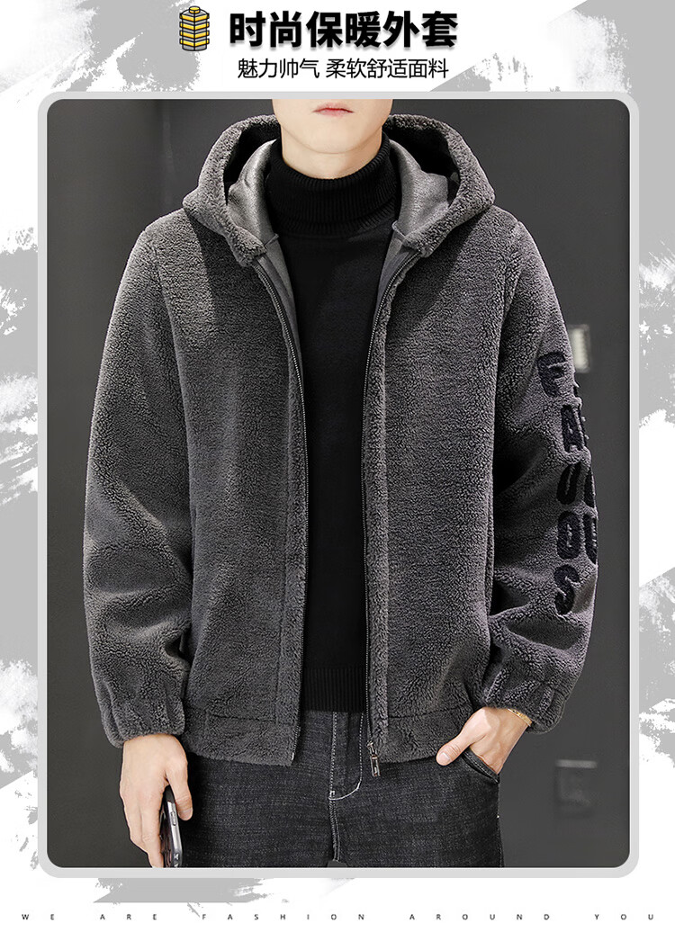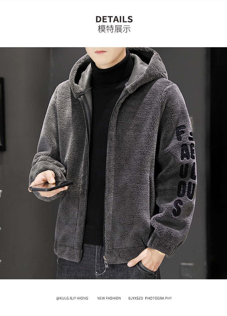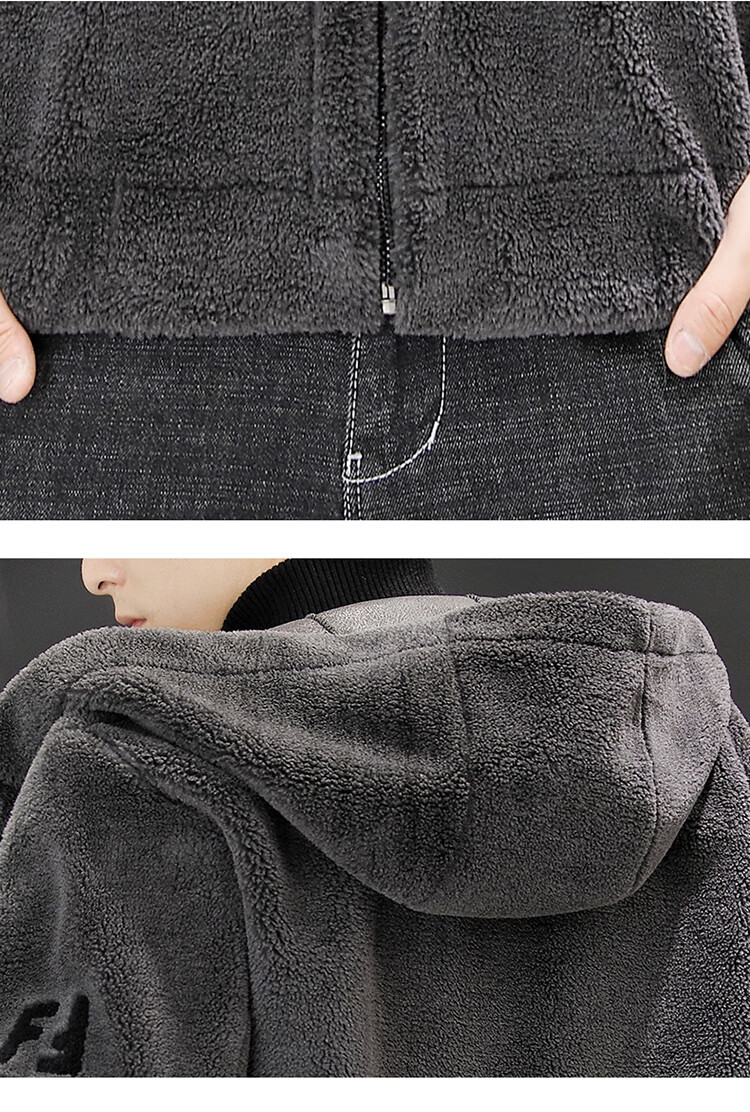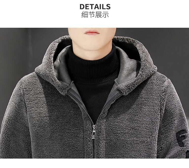 ROMON autumn and winter sheep sheared hooded woolen jacket plus velvet and thickened fur all-in-one men's embroidered cardigan jacket hooded gray 2XL (recommended 130-145 pounds)