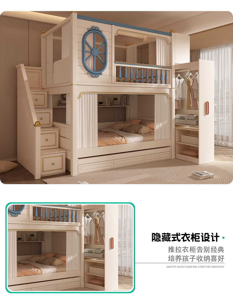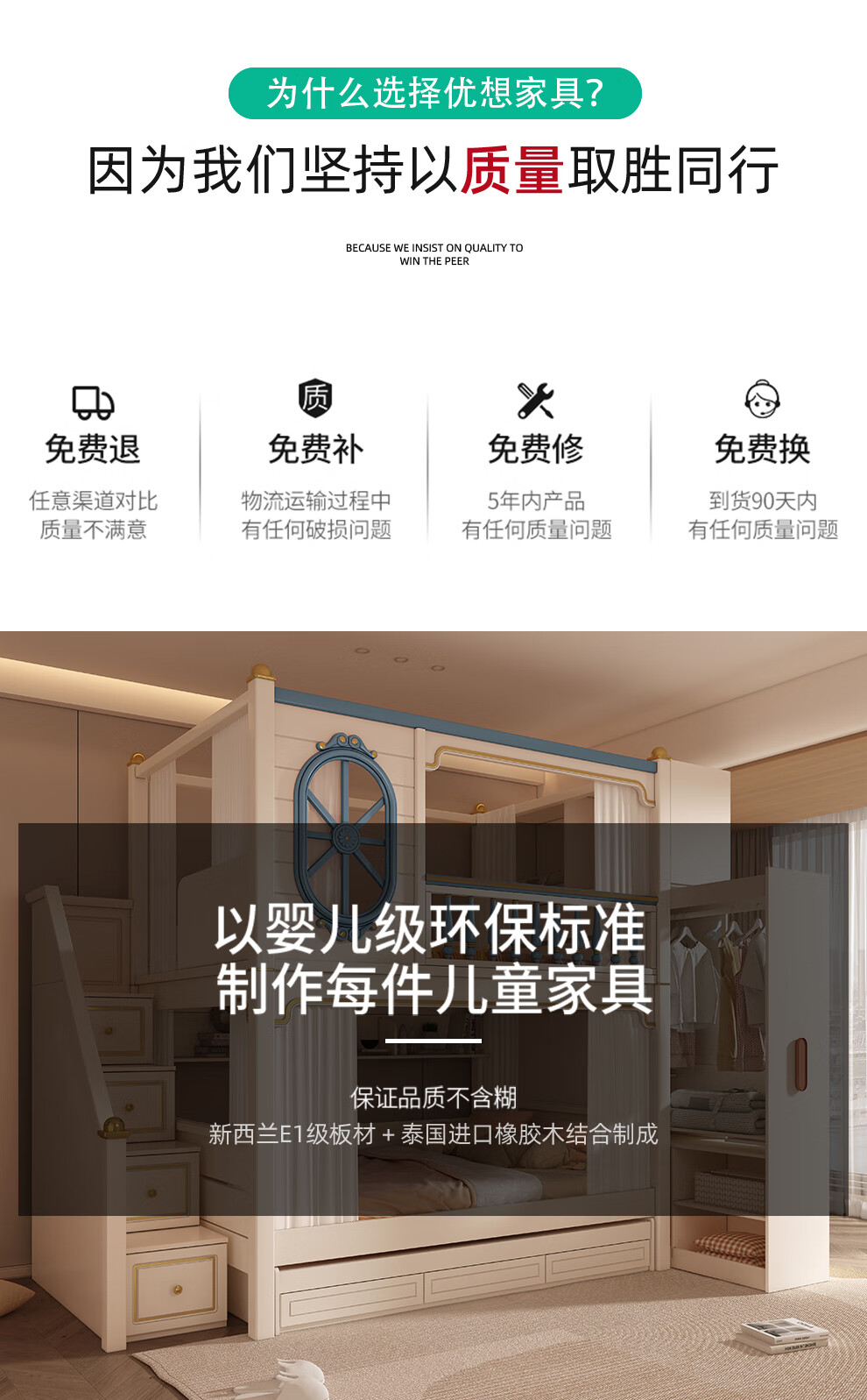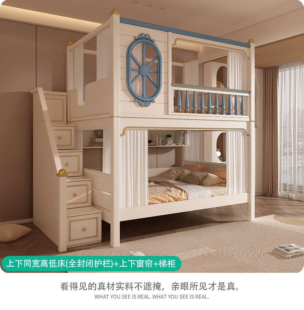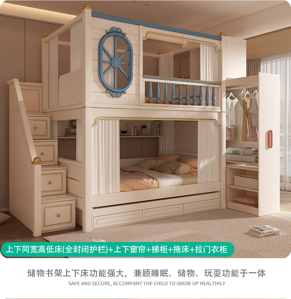 Youxiang high and low beds, mother and child beds, bunk beds, mother and child beds, boy beds, double children's beds, plus high guardrails, upper and lower beds + drag beds + ladder cabinets + upper and lower six-sided curtains 1500mm*1930mm