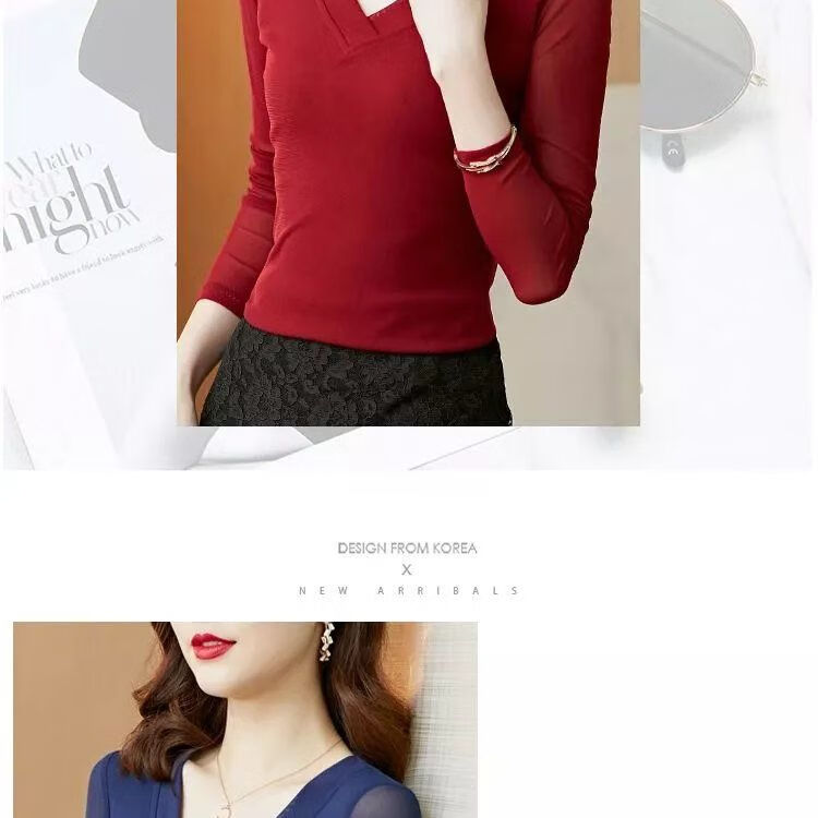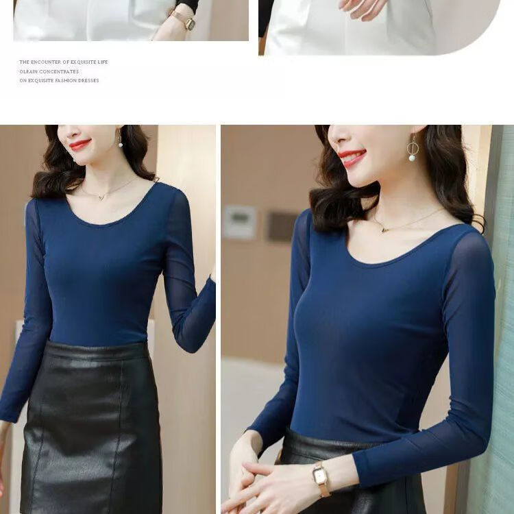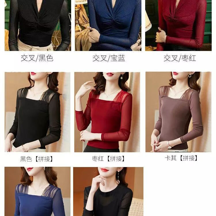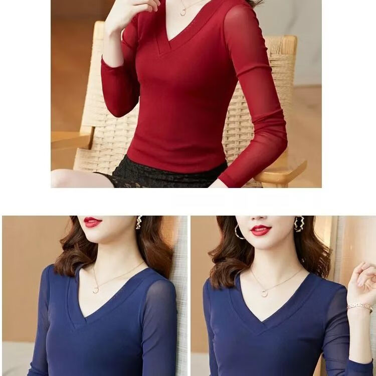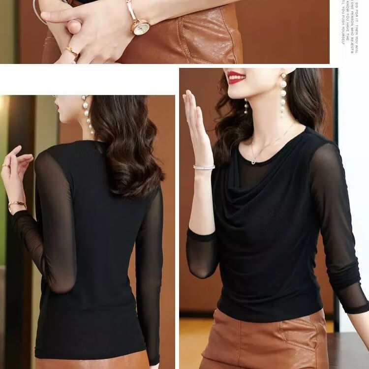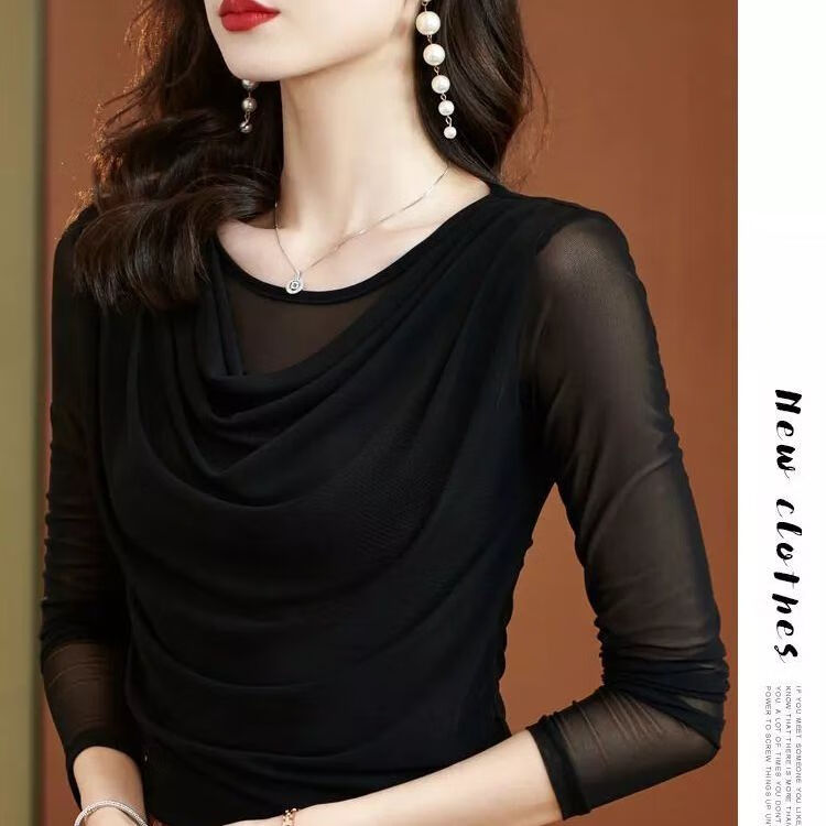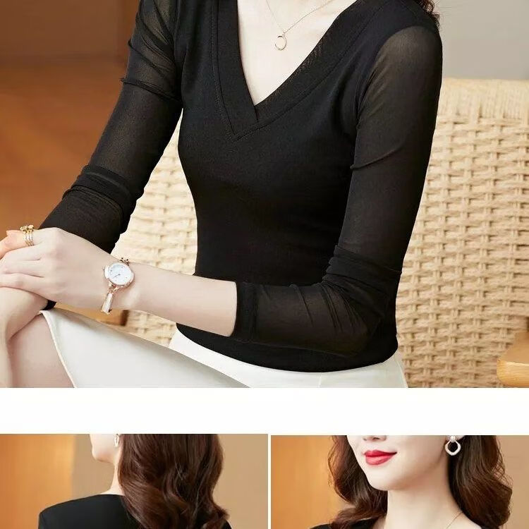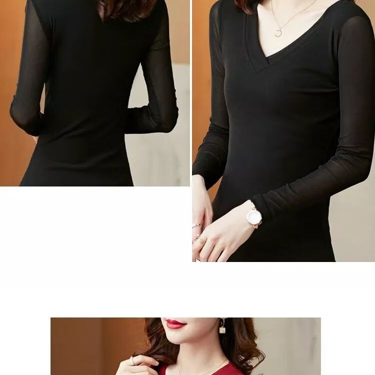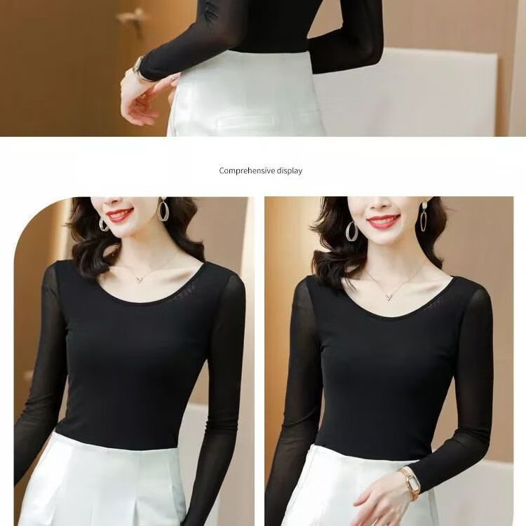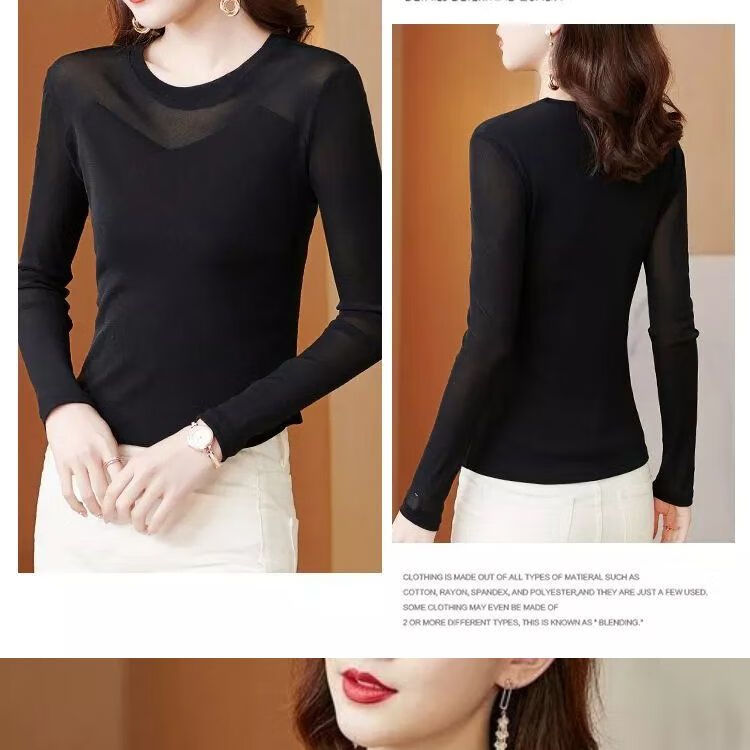 Xinan mesh bottoming shirt with spring and autumn V-neck western style slim top for women new fashion long-sleeved T-shirt for women black round-neck 2XL recommended 125-140 pounds