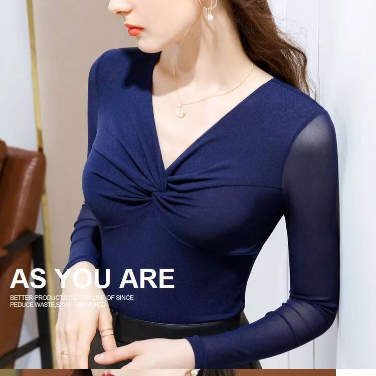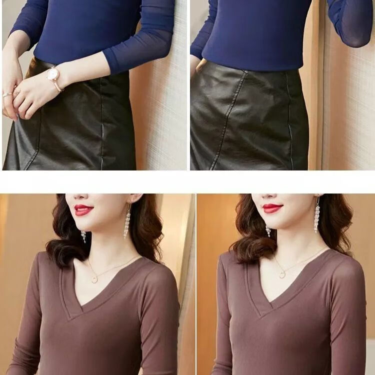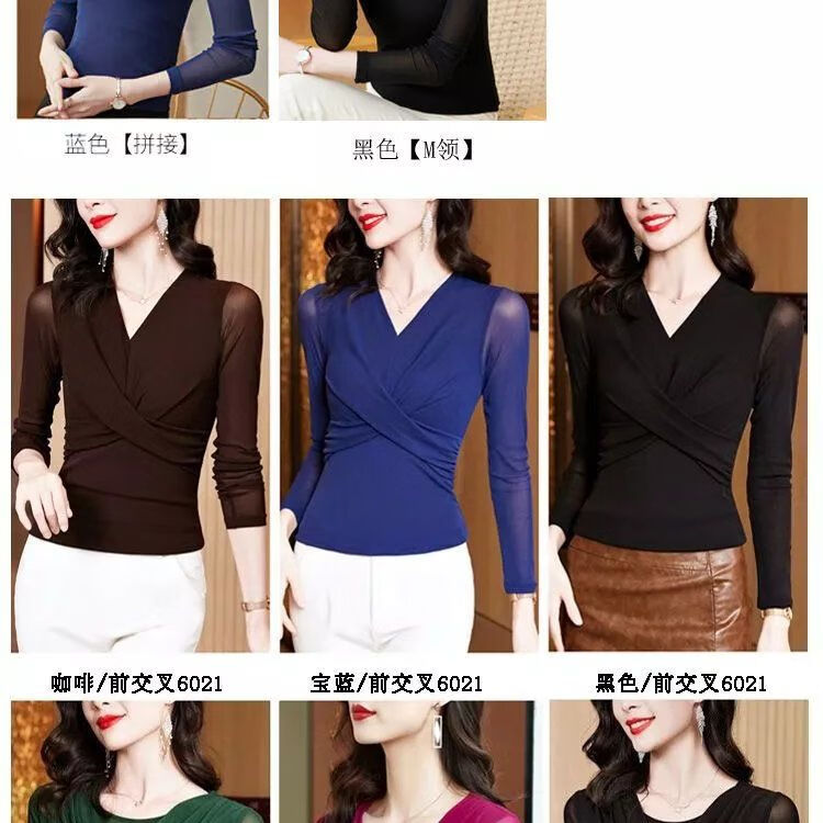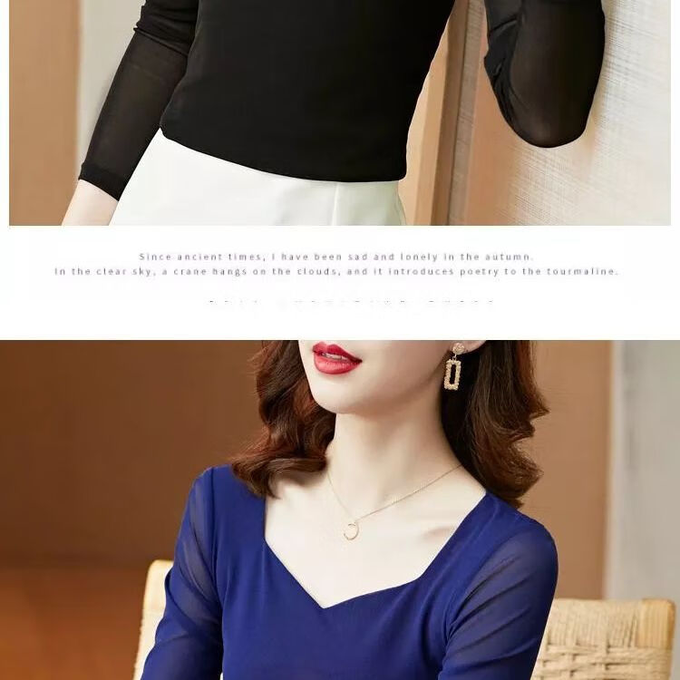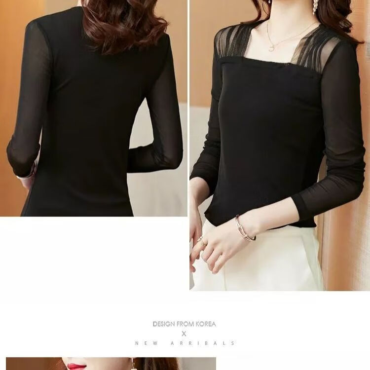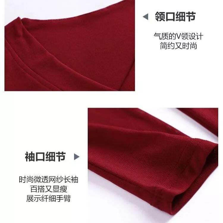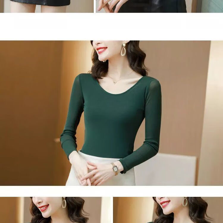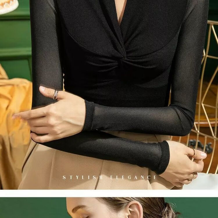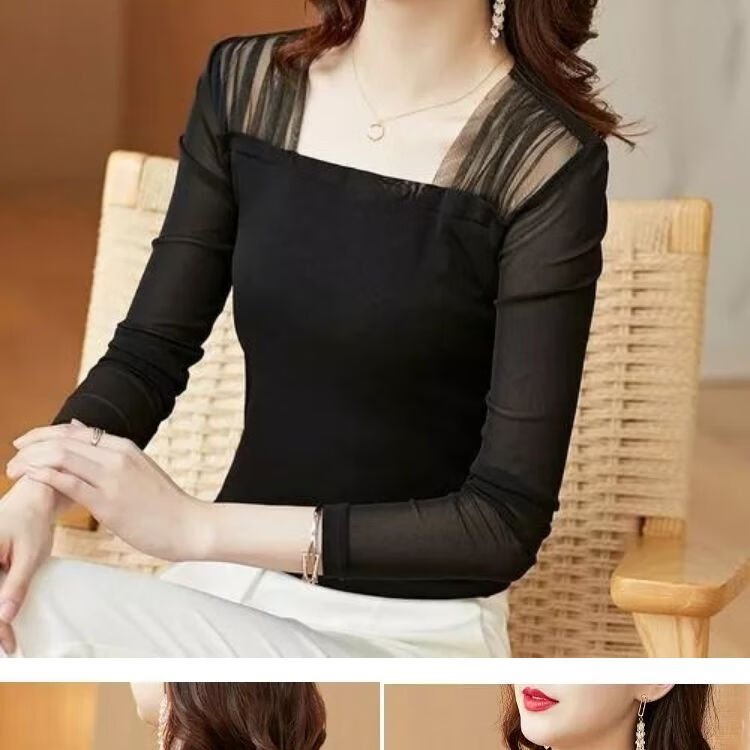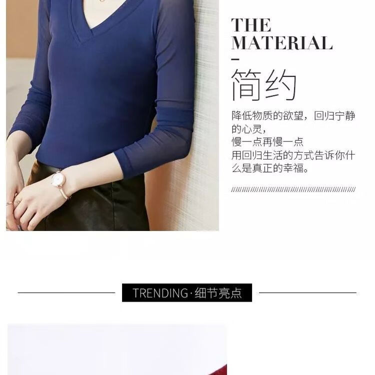 Xinan mesh bottoming shirt with spring and autumn V-neck western style slim top for women new fashion long-sleeved T-shirt for women black round-neck 2XL recommended 125-140 pounds