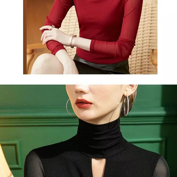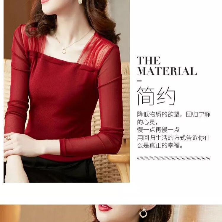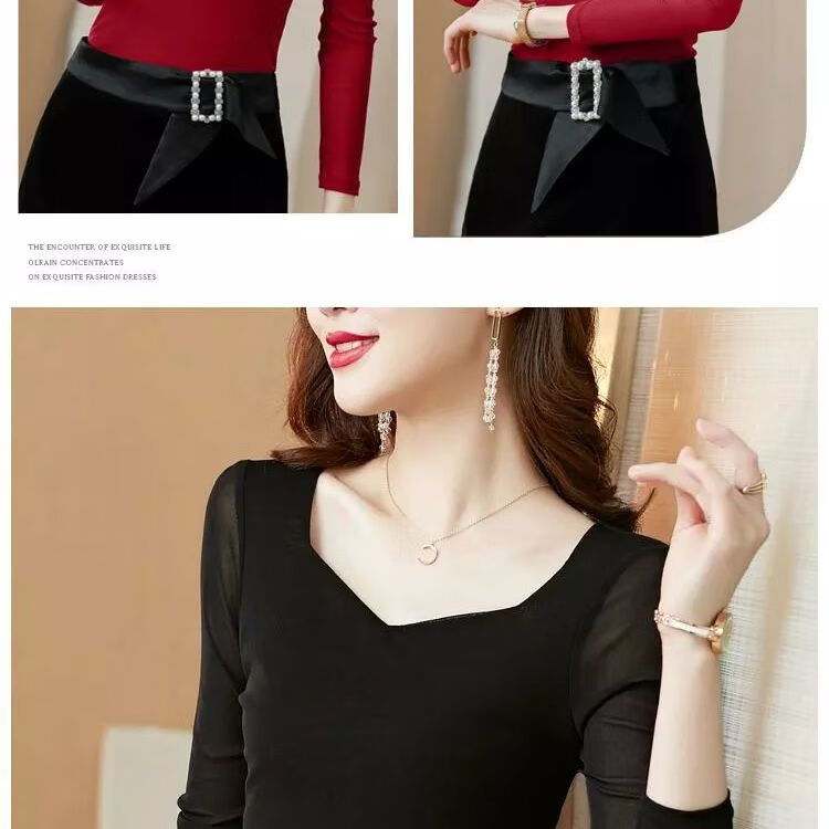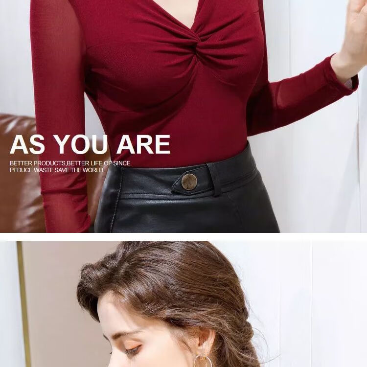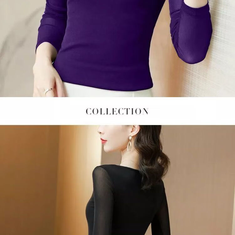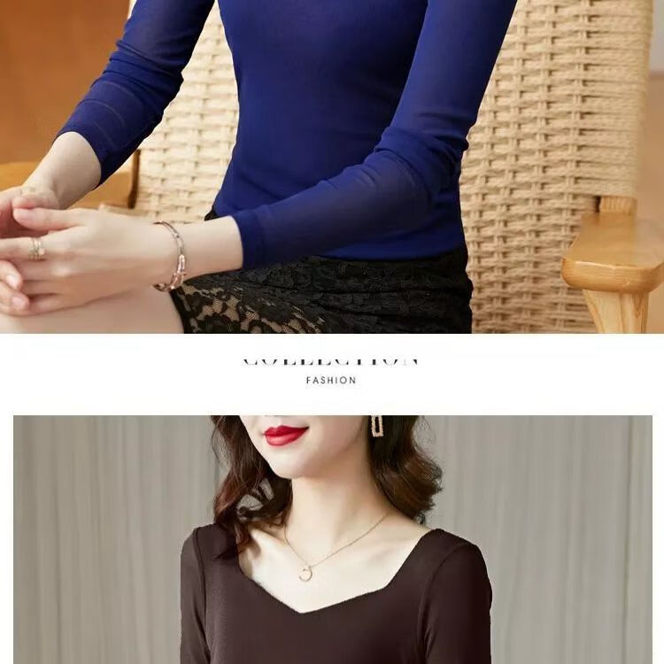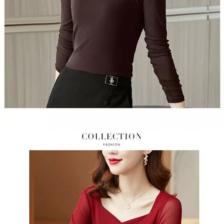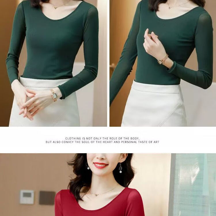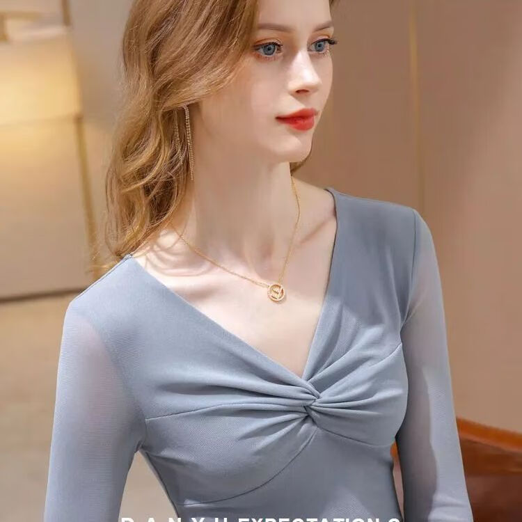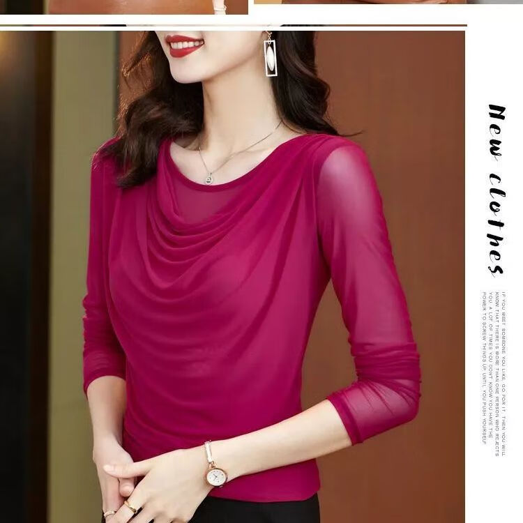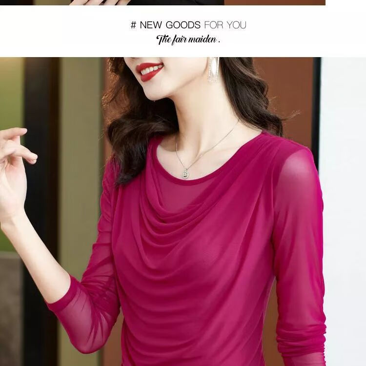 Xinan mesh bottoming shirt with spring and autumn V-neck western style slim top for women new fashion long-sleeved T-shirt for women black round-neck 2XL recommended 125-140 pounds