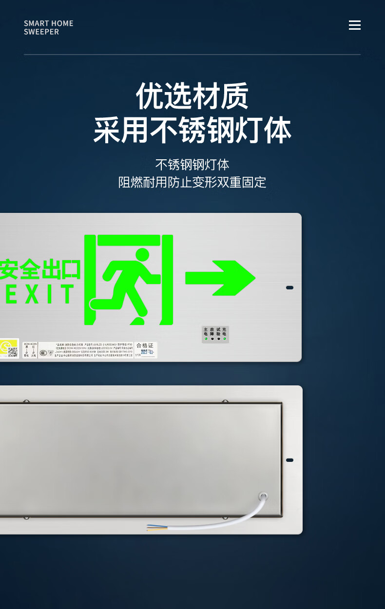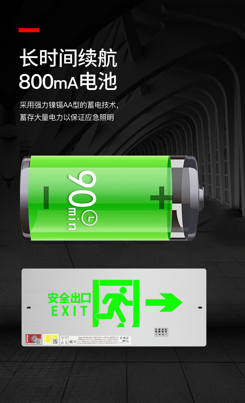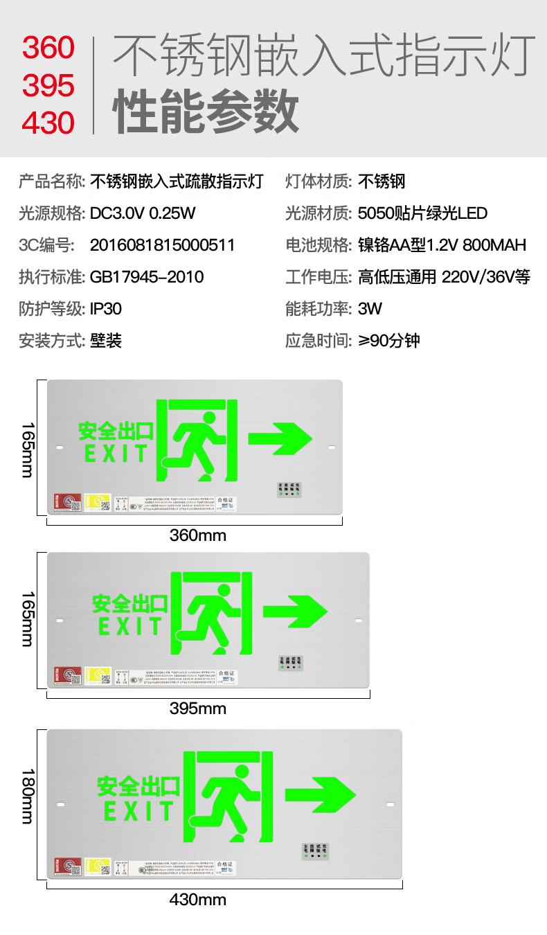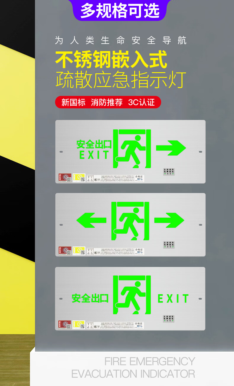 Embedded thin stainless steel emergency sign concealed emergency evacuation indicator light 395 left facing with bottom box