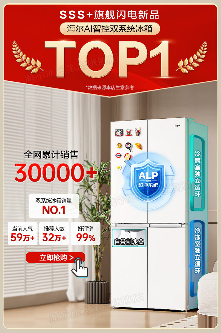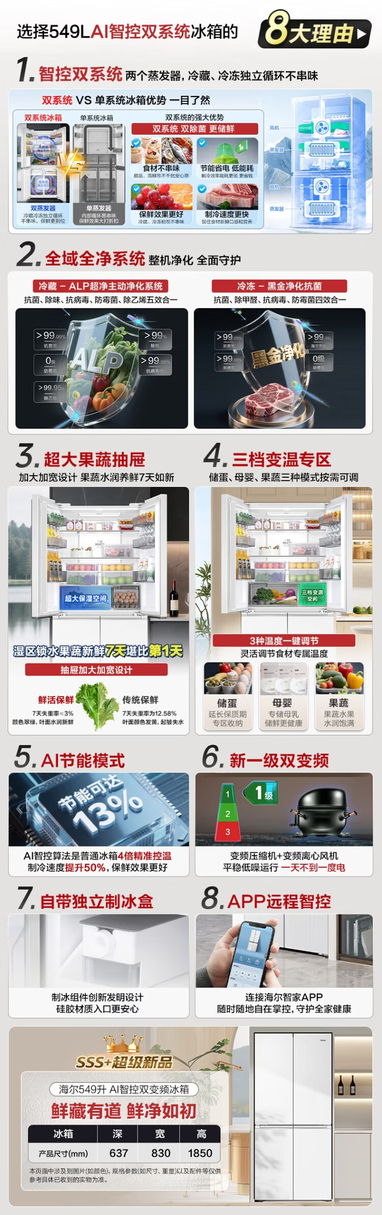 Haier's new product Xiaohonghua 2.0 dual-system 549-liter refrigerator first-class energy efficiency dual-frequency dual-cycle air-cooled frost-free cross four-door four-door double-door household refrigerator dual-system no odor | refrigerated and frozen full area purification | 549-liter large capacity
