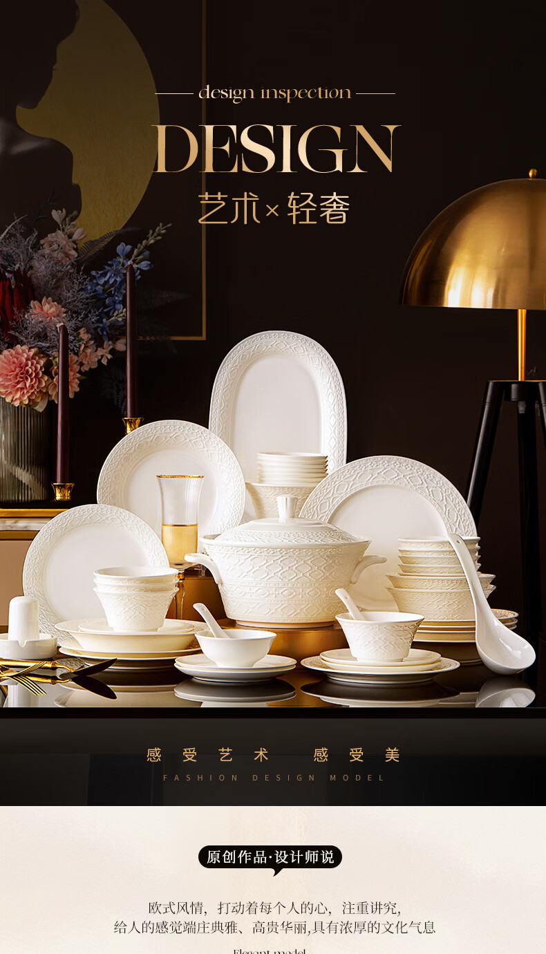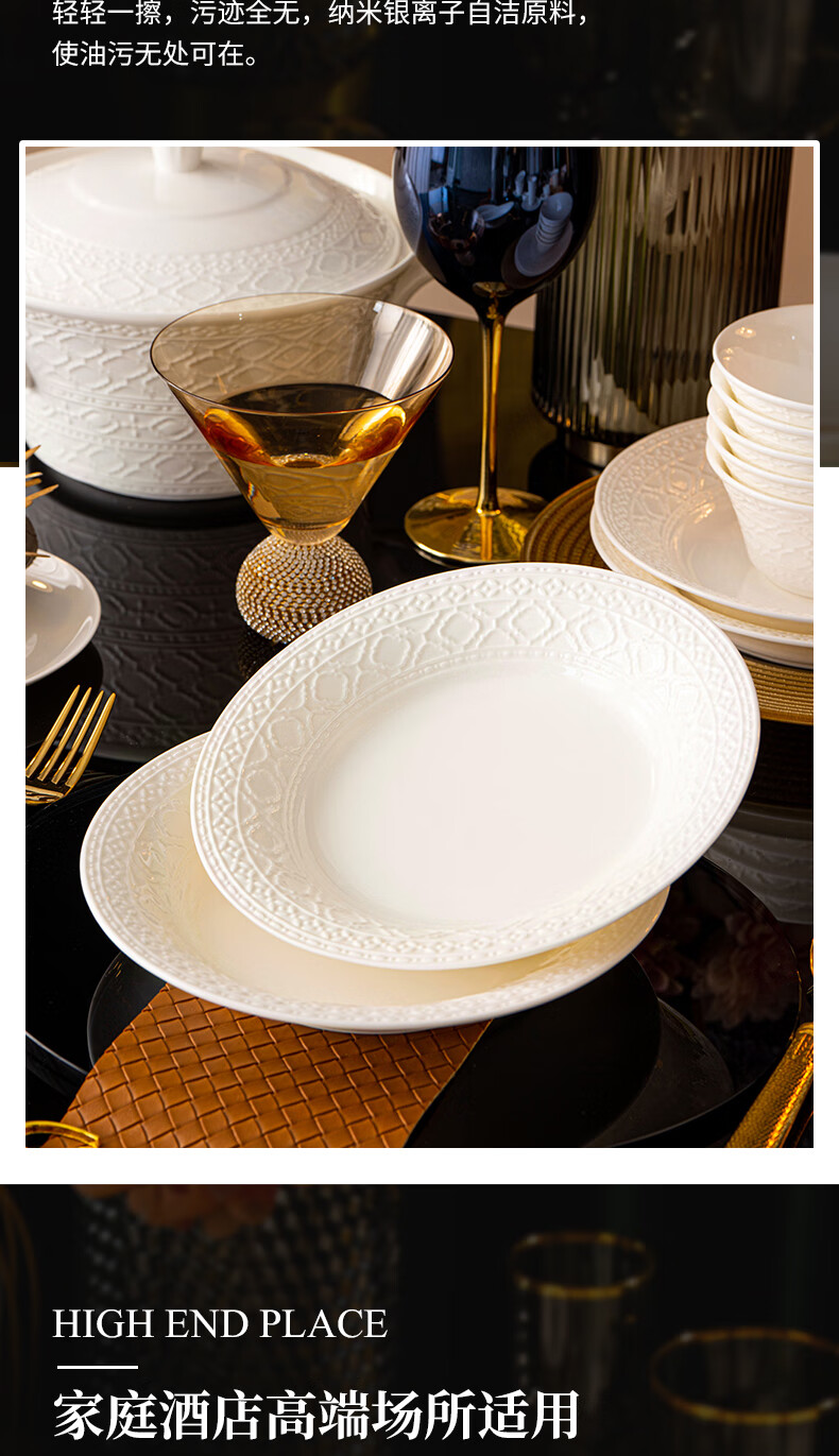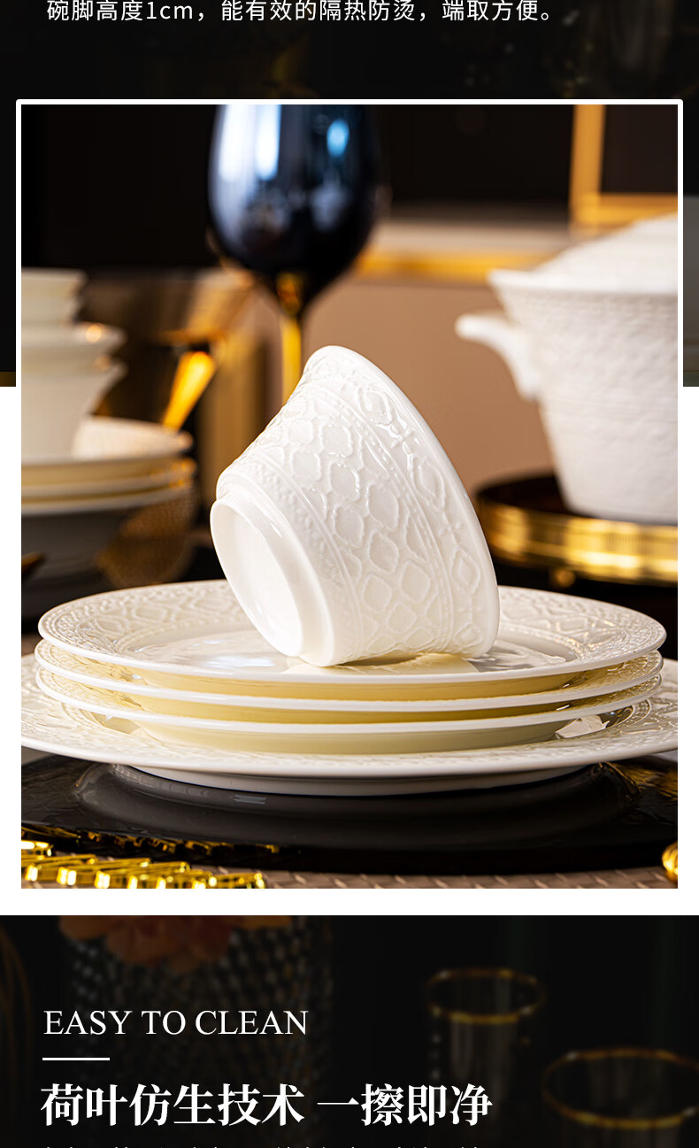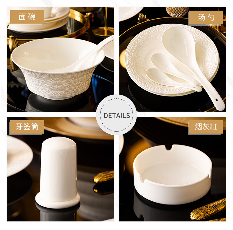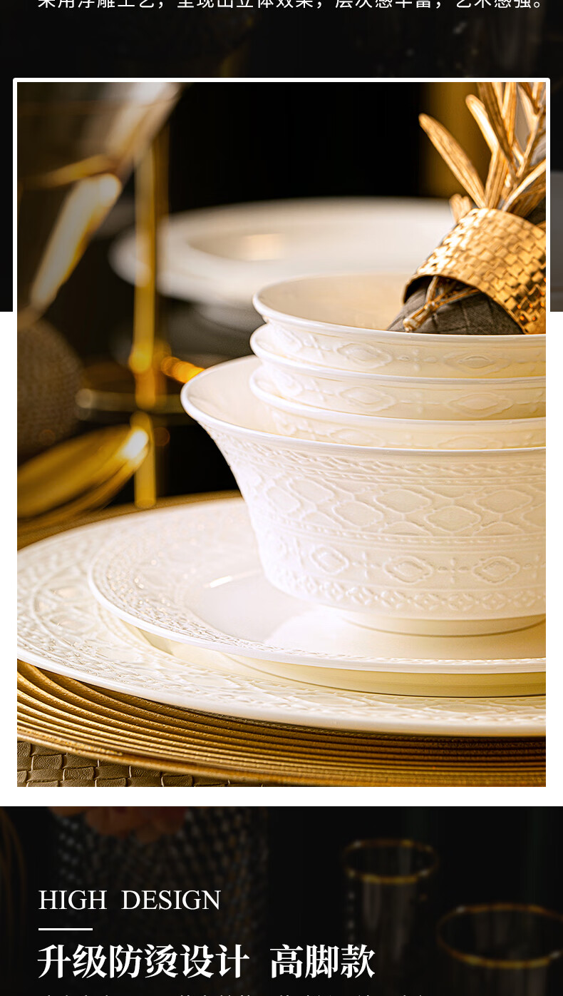 NINE CRANES embossed tableware complete set of household bowls and plates, high-end Jingdezhen underglaze color bone china tableware, housewarming gift bowl and dish set, 60-piece set丨Jingdezhen first-class underglaze color bone china