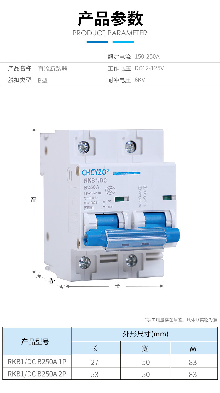 Electric vehicle DC circuit breaker 12V24V48V60V120V DC circuit breaker 150A air switch 250A 250A 1P