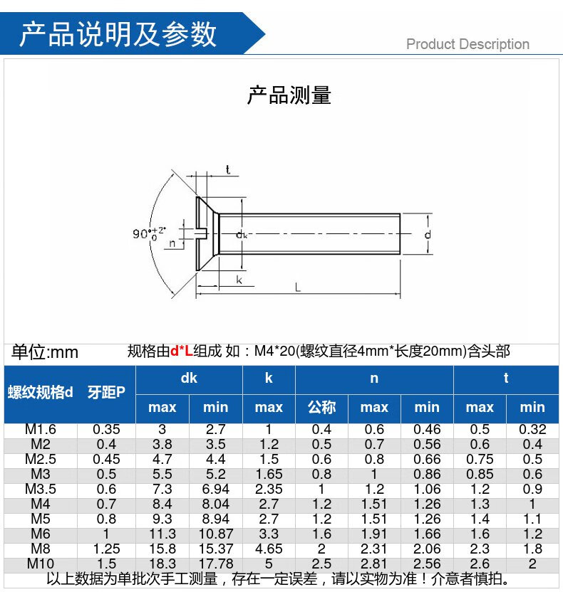 Bingneng 304 stainless steel GB68 slotted flat head screws, countersunk head bolts, flat tail machine screws, M4*8 (100 pieces)