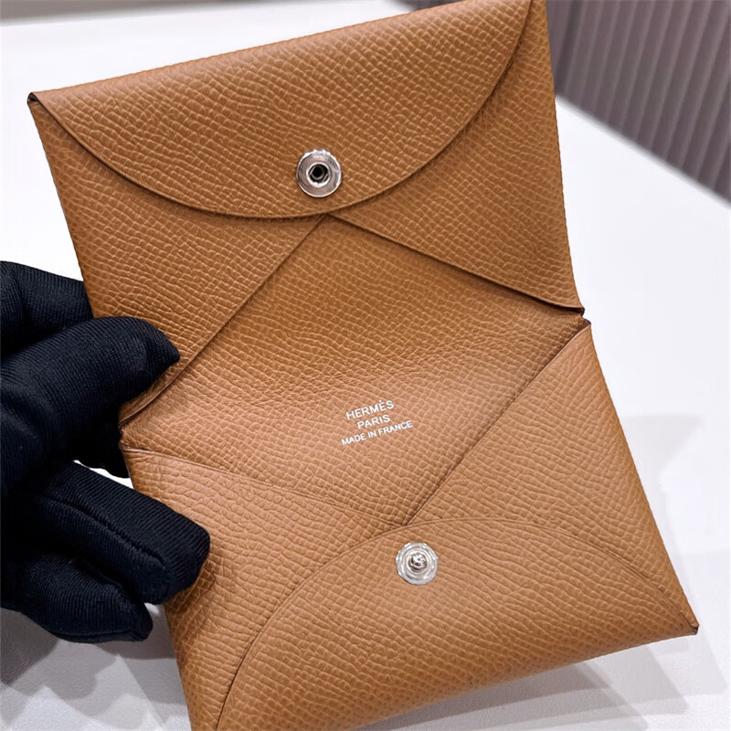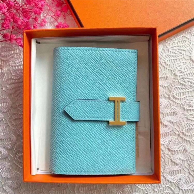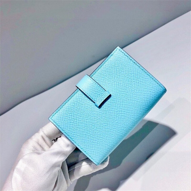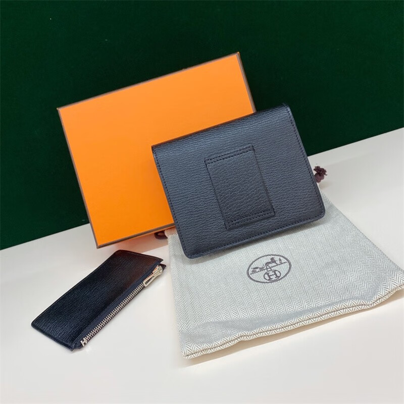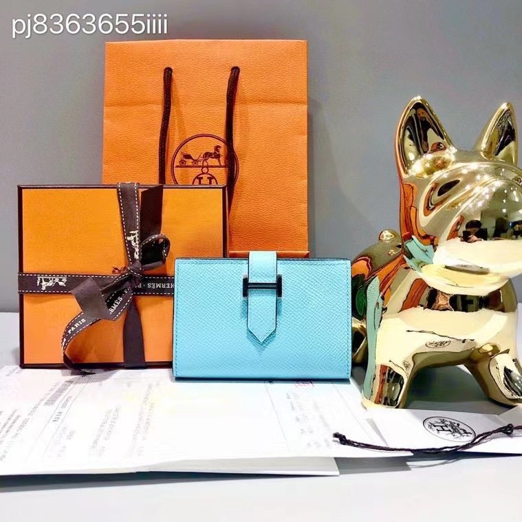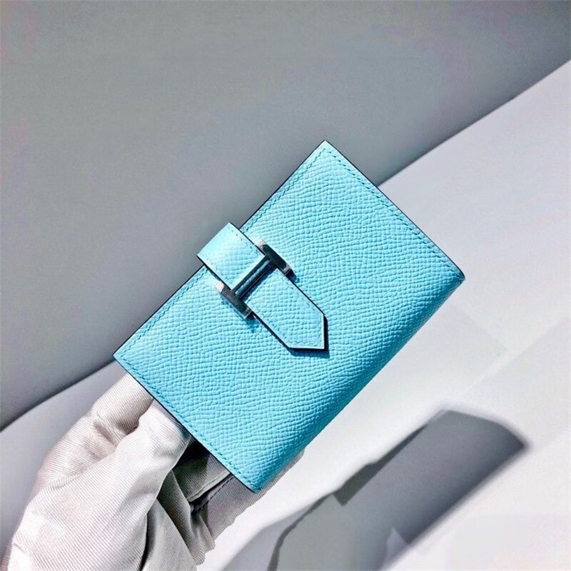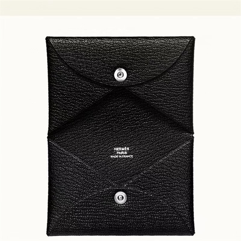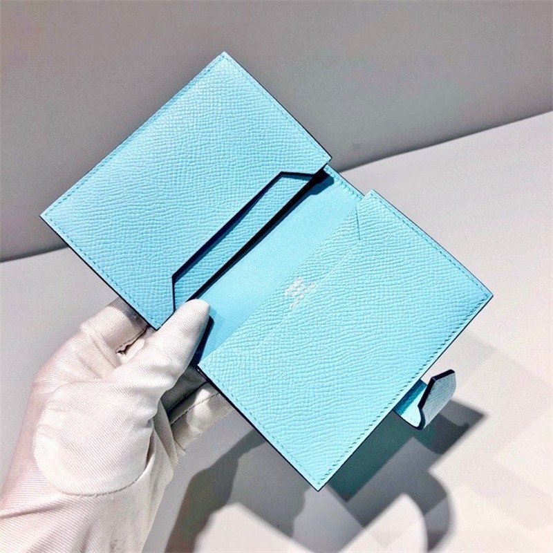 Second-hand 99 new unused full set of Hermes Hermes light blue card holder folding women's wallet card holder 99 new Hermes Calvi card holder black D-engraved