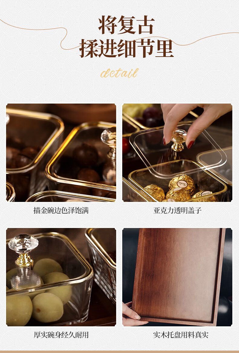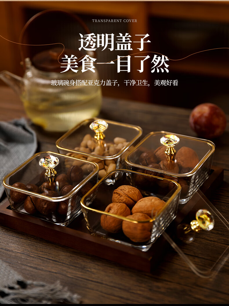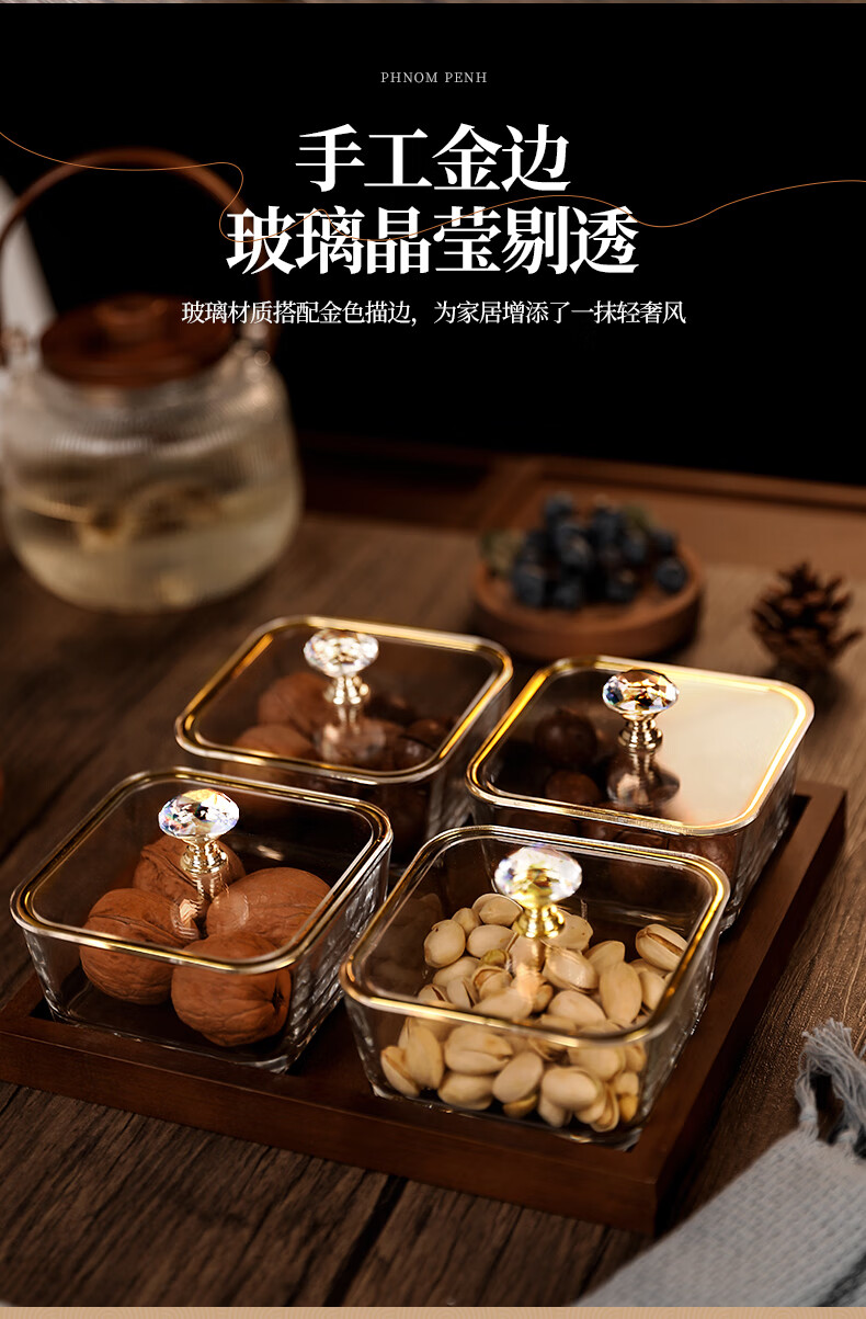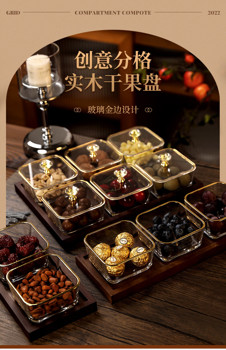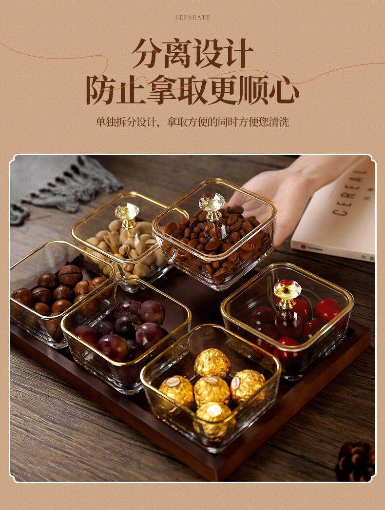 CRISTALGLASS new home living room fruit plate, coffee table, dried fruit plate, snack plate, storage box, snacks, dried fruits, nuts, candies, snack compartments, 6-grid tray + 6 gold-rimmed fruit plates with lids