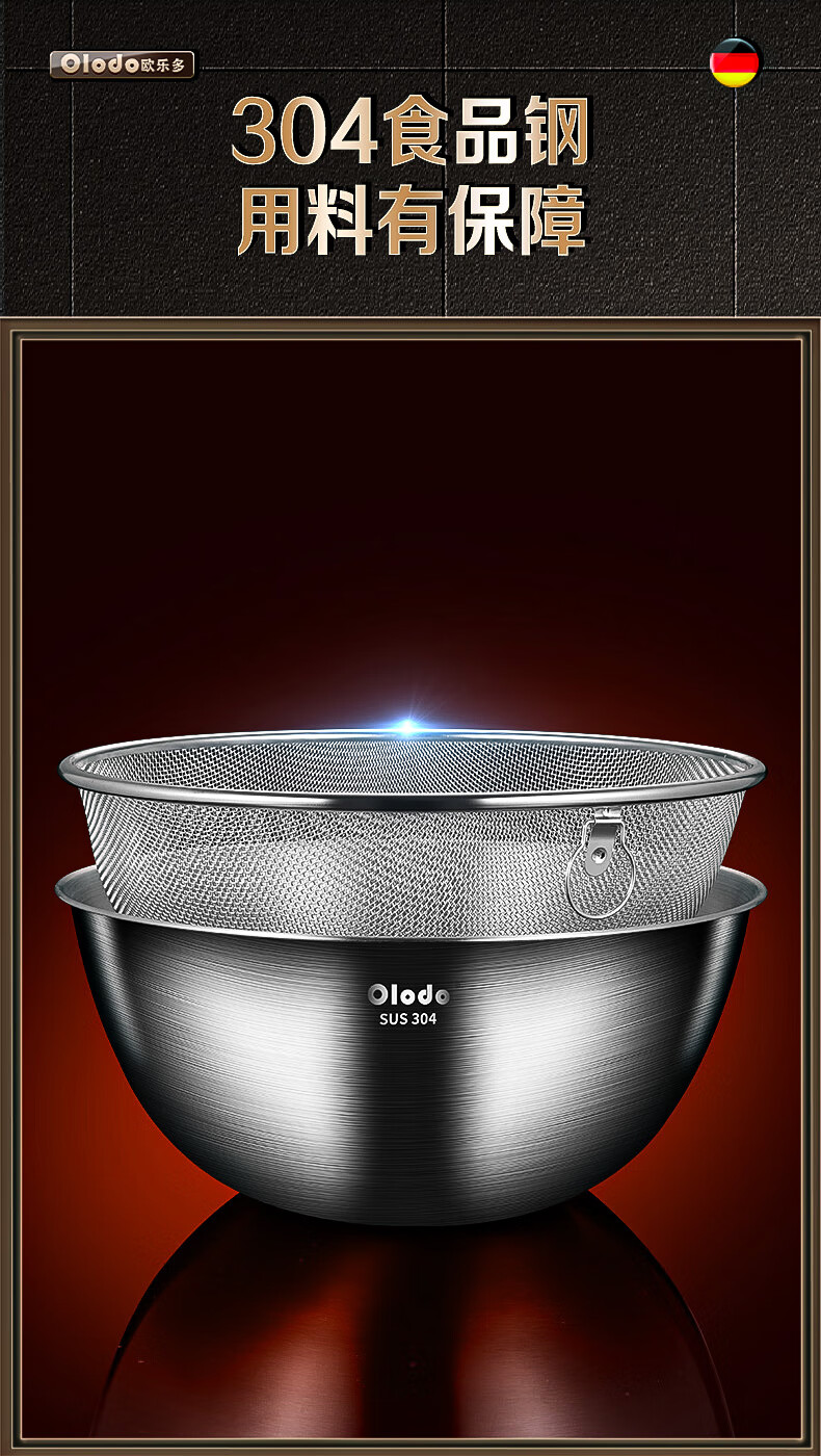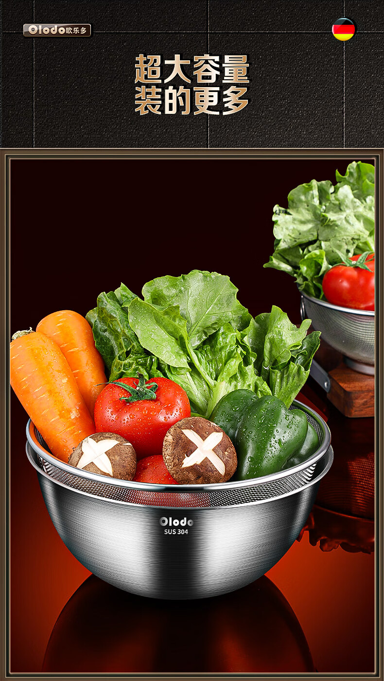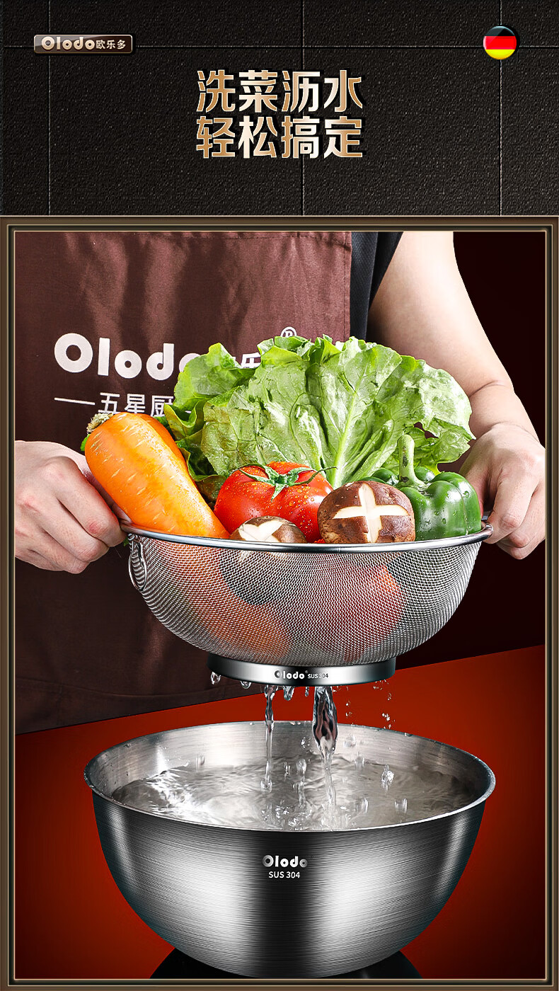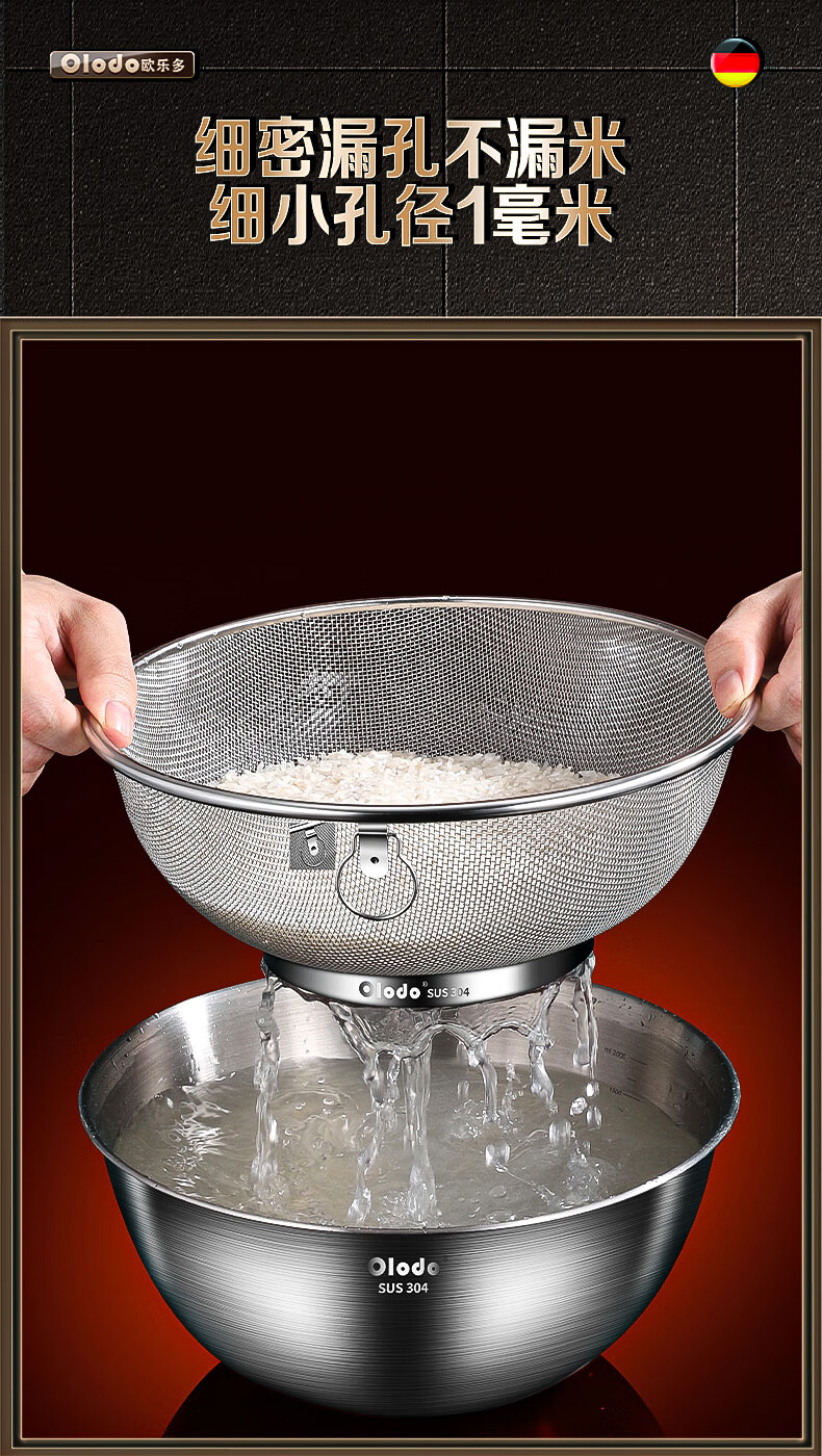 Olodo German 304 stainless steel rice basket, vegetable basin, rice sieve, drain basket, drain basin, drain basin, rice basin, fruit basin 304 food grade multi-purpose drain basin, large size 24cm