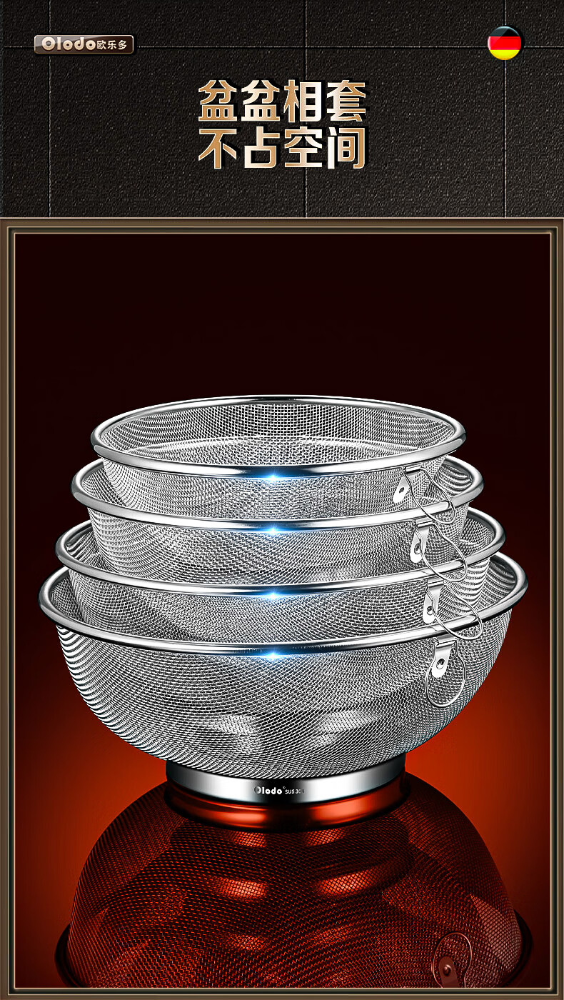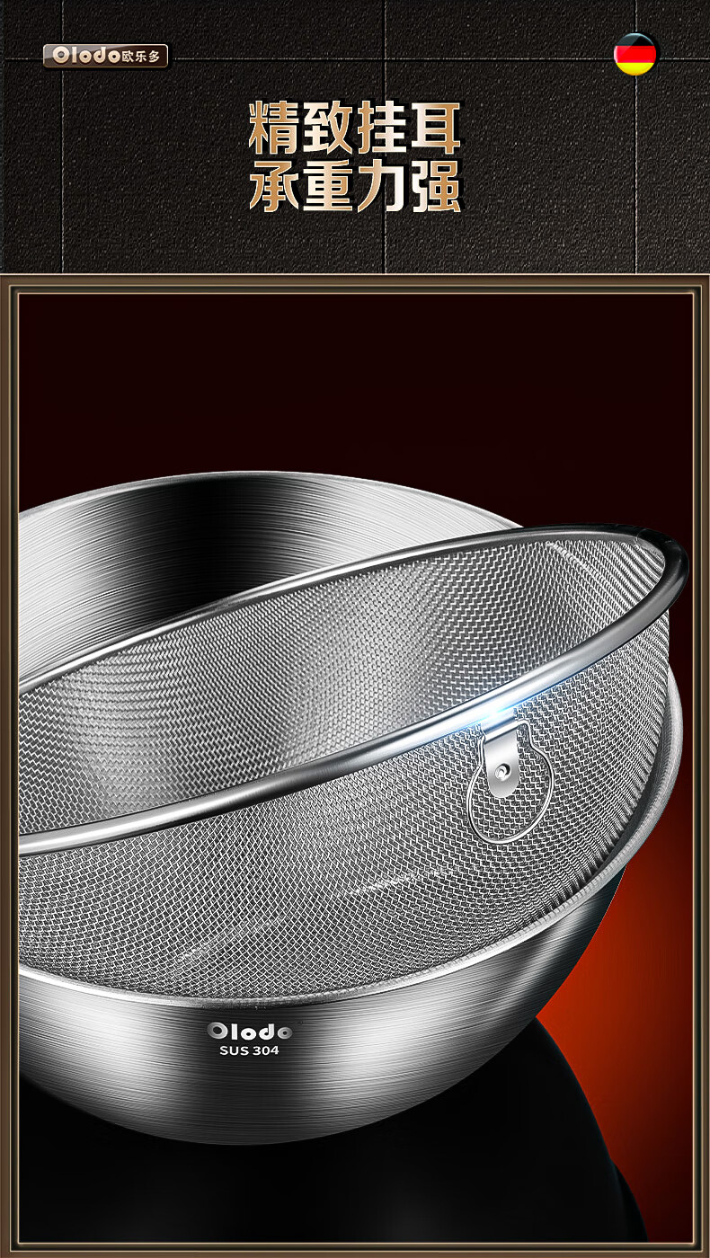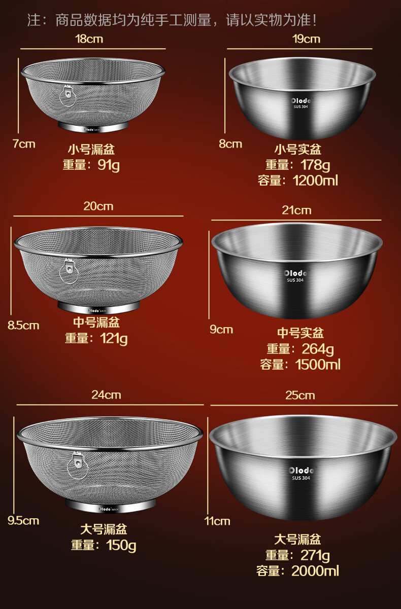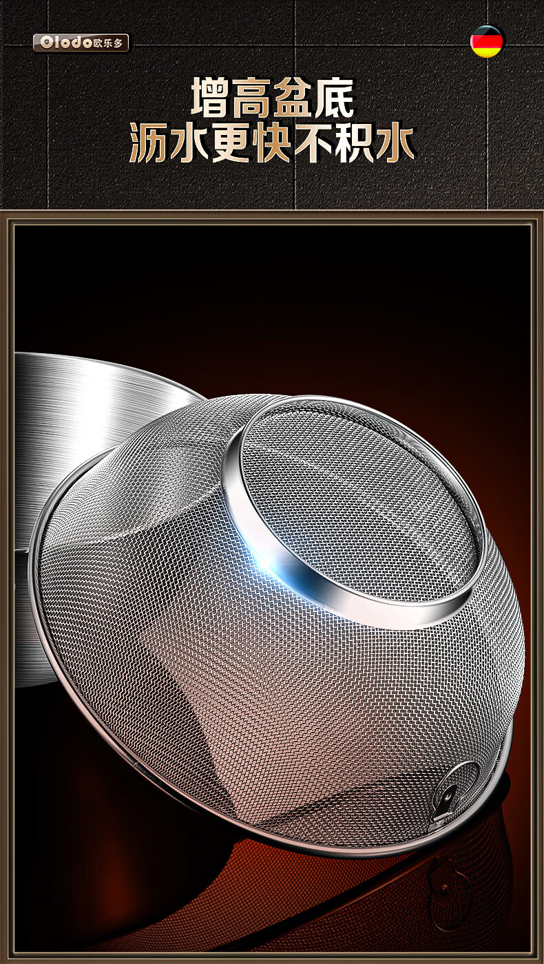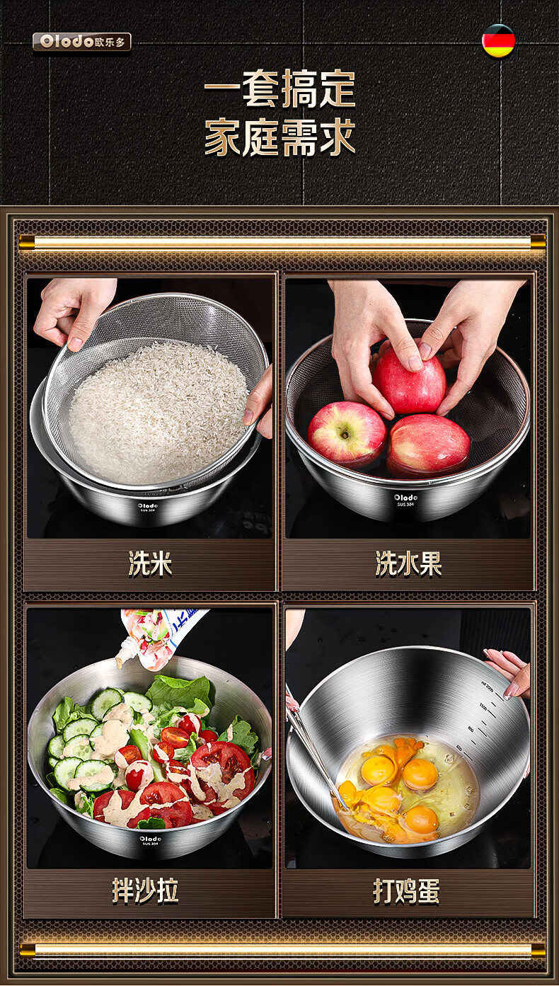 Olodo German 304 stainless steel rice basket, vegetable basin, rice sieve, drain basket, drain basin, drain basin, rice basin, fruit basin 304 food grade multi-purpose drain basin, large size 24cm