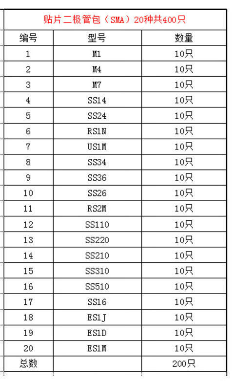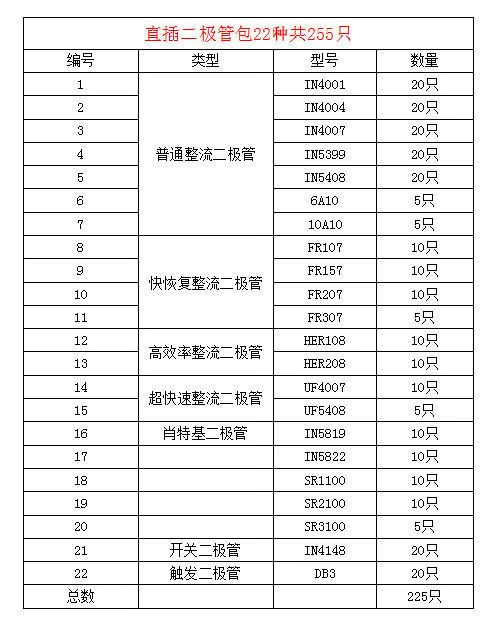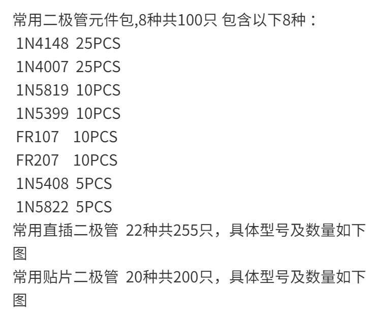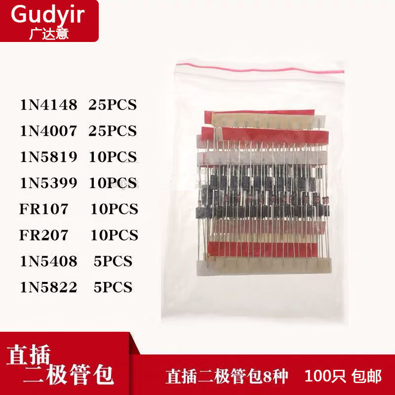 Commonly used diode component package, 8 types, total 100 pieces, including 1N4148, 1N4007, 5819, 5822, 5408 direct plug diode package, 8 types, total 100 pieces, 1 package)