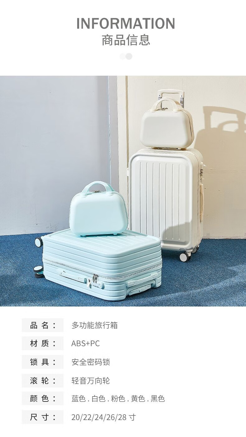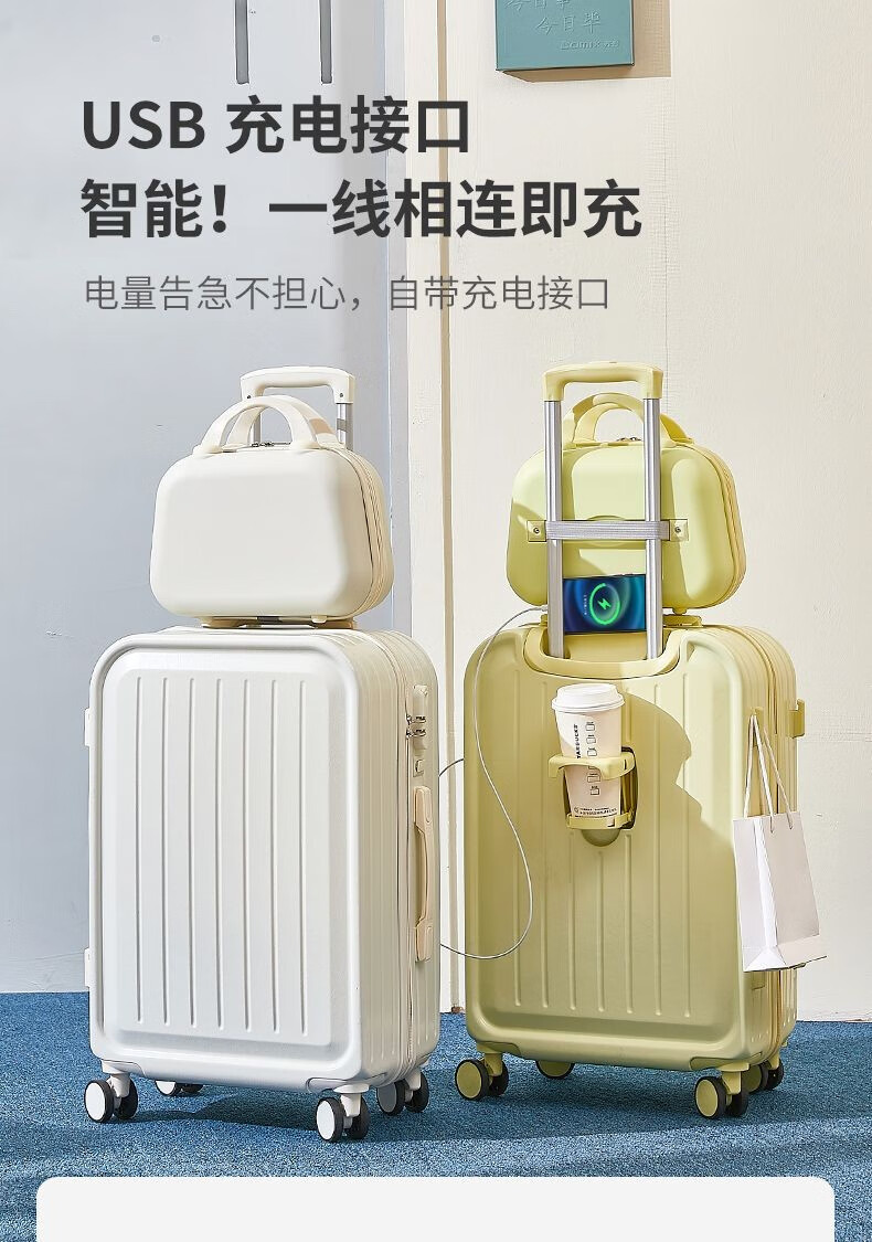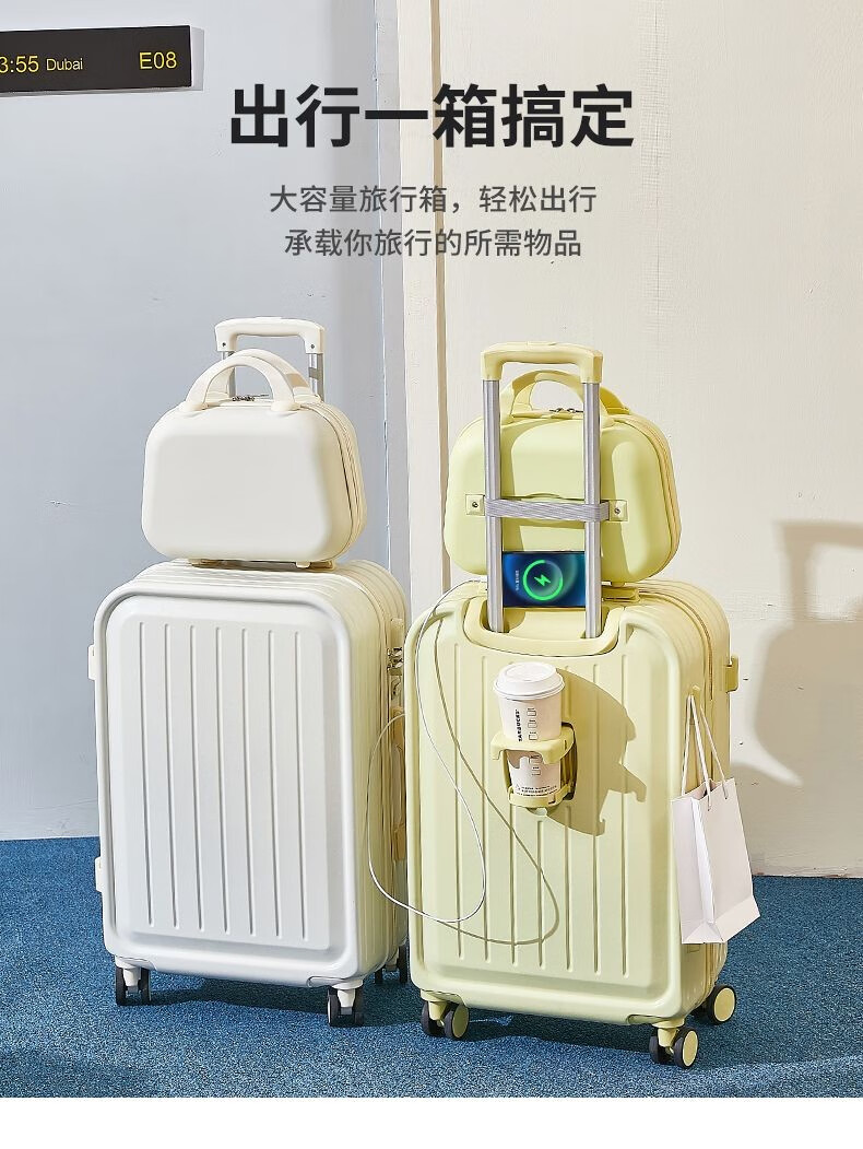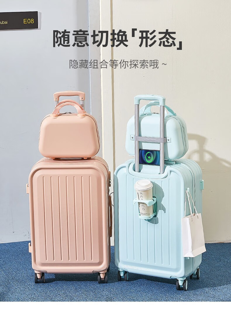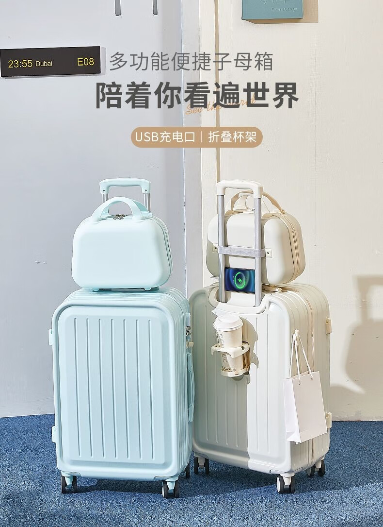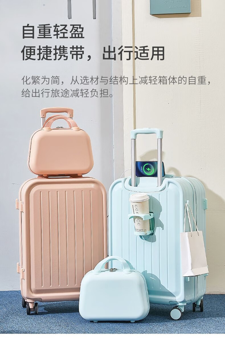 Ouyao's high-looking two-piece suitcase with next-day delivery small boarding trolley case for female students, durable and seatable password suitcase, light blue, folding cup holder + charging port + cosmetic bag, 20 inches, can be boarded on the plane without checking in