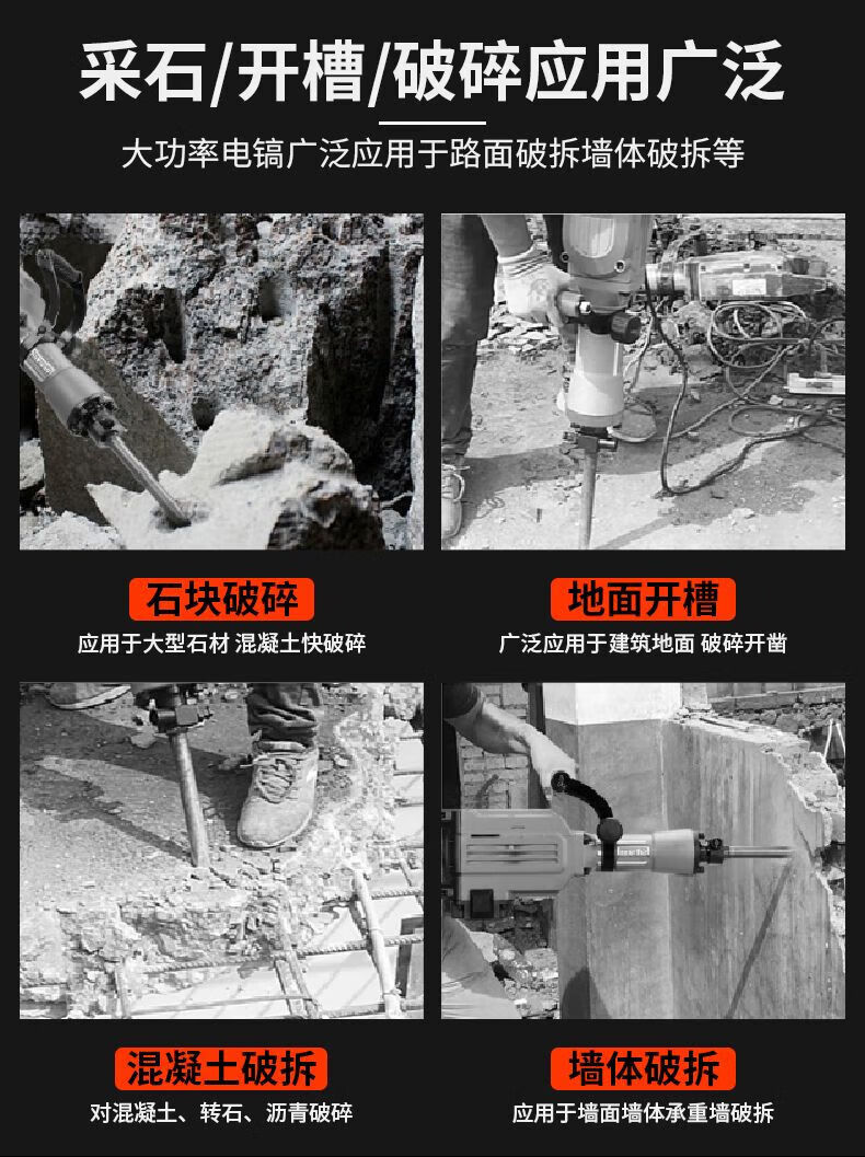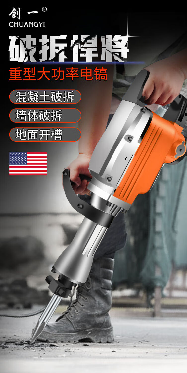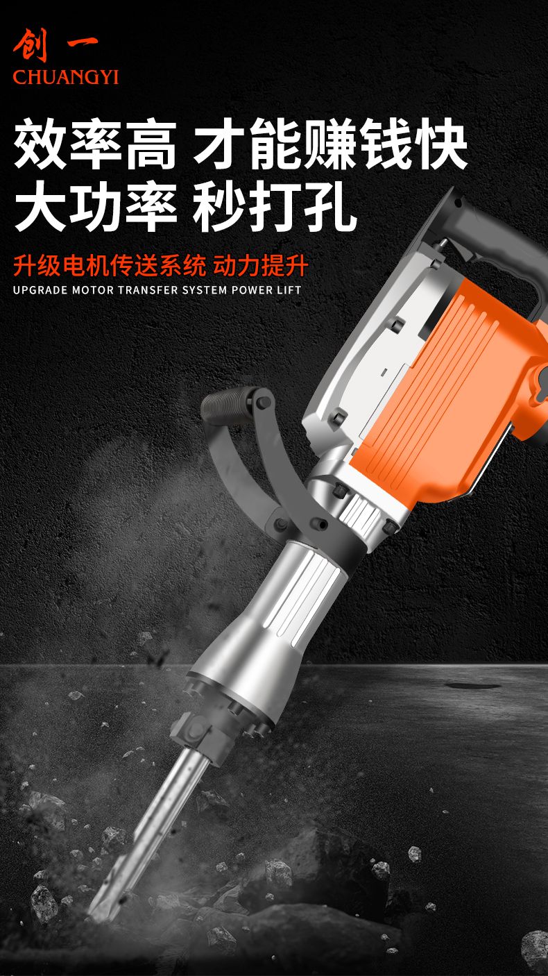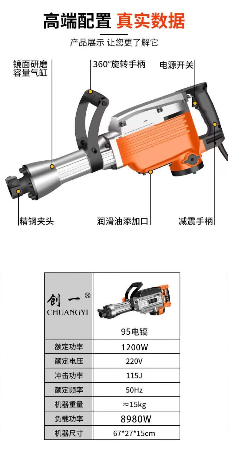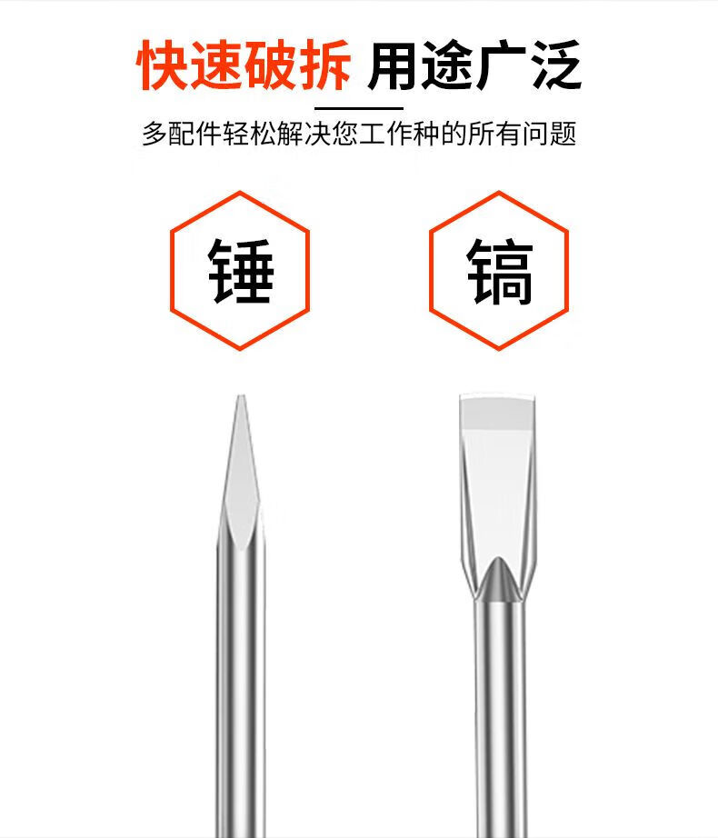 Create a high-power electric hammer with a single electric pick for demolishing concrete road projects and demolishing walls. 95 heavy-duty 95 electric pick + sharp and flat pick + tool box